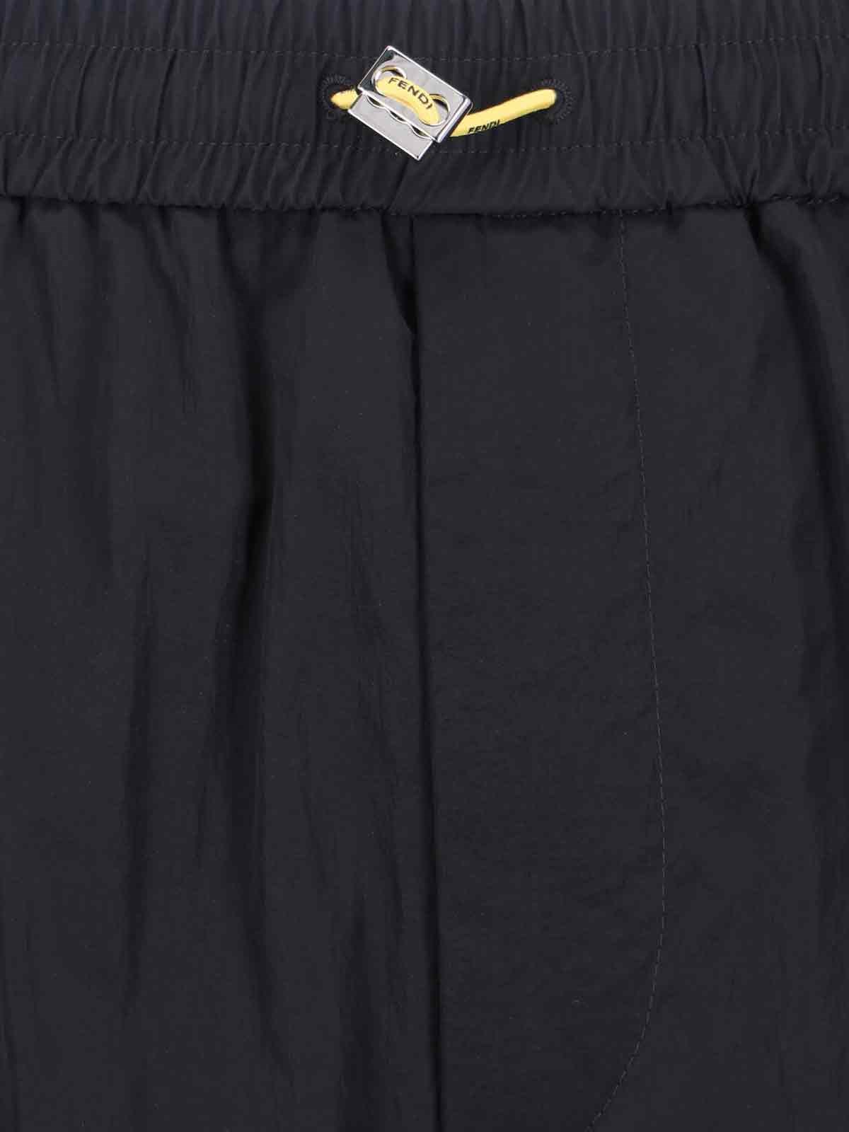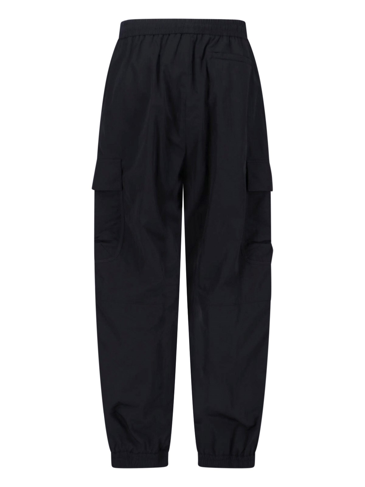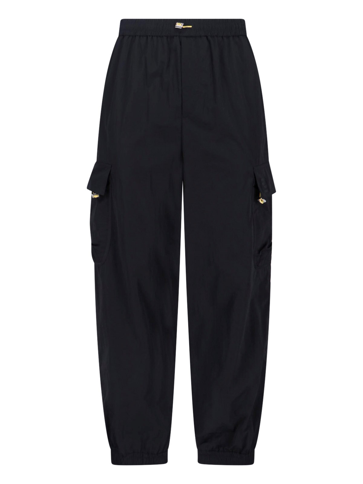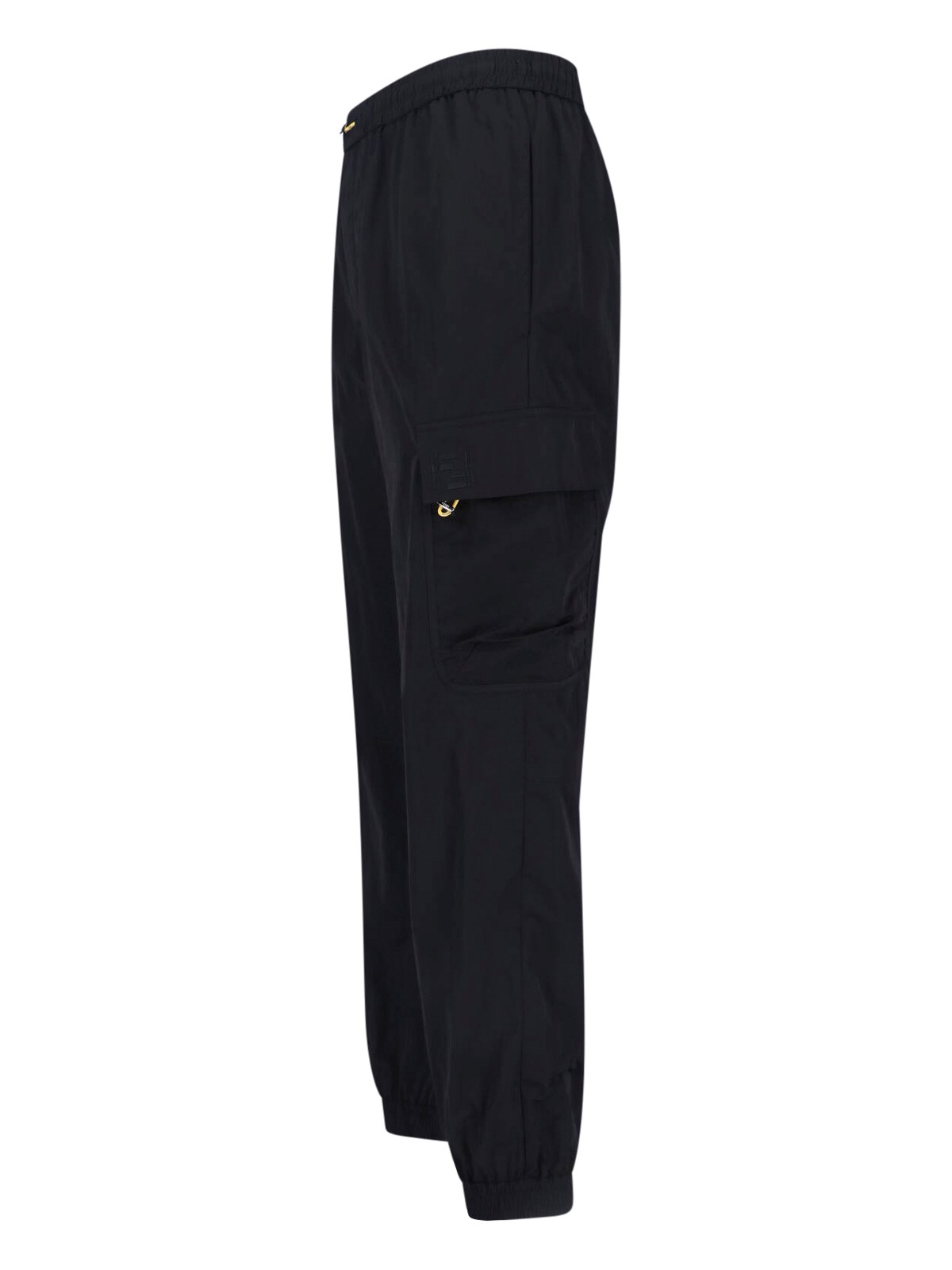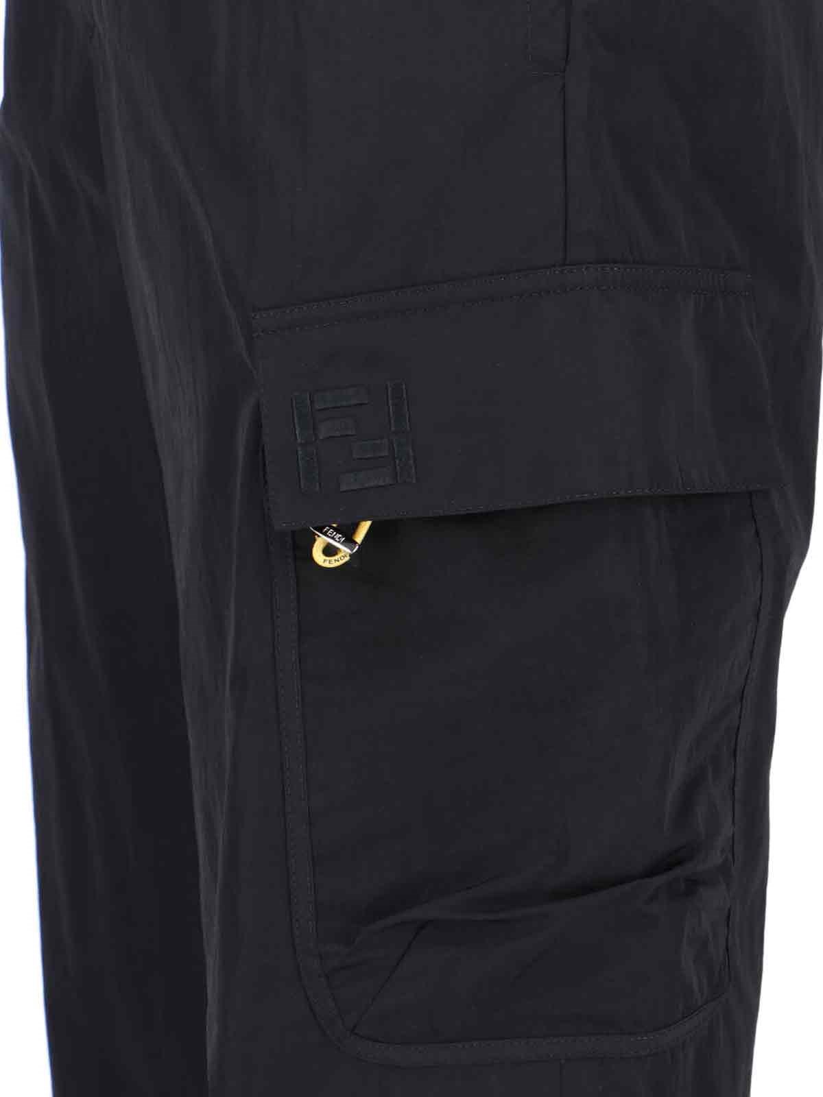 black pants in Fendi technical fabric with medium elastic waistband, adjustable drawstring at the waist, two slanted side pockets, two side cargo pockets, embroidered "FF" logo on the pocket, elastic hems, straight leg.