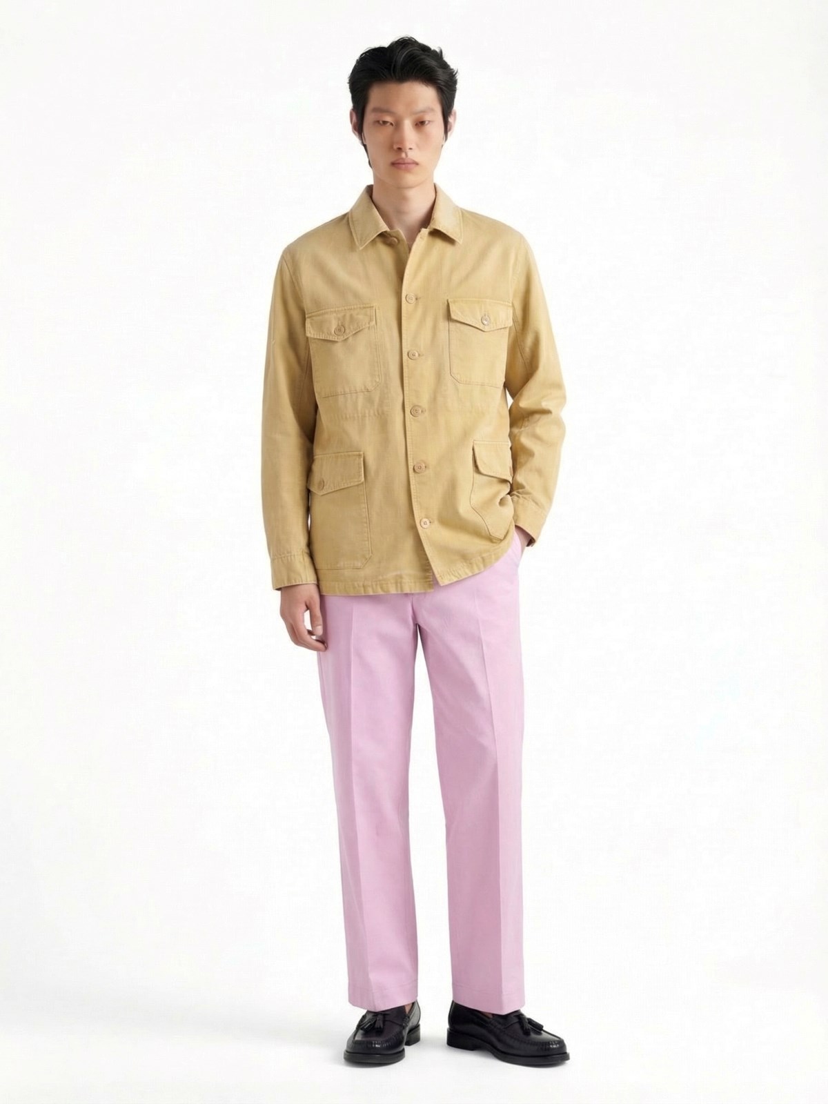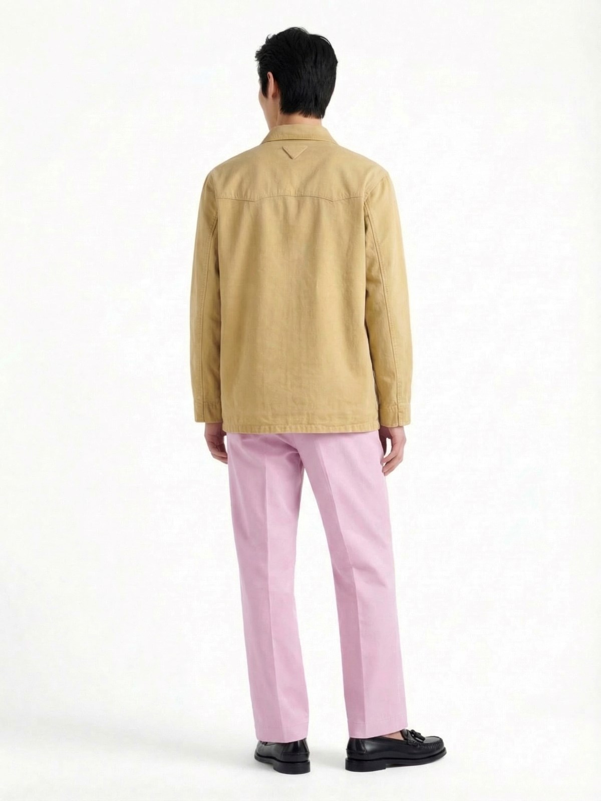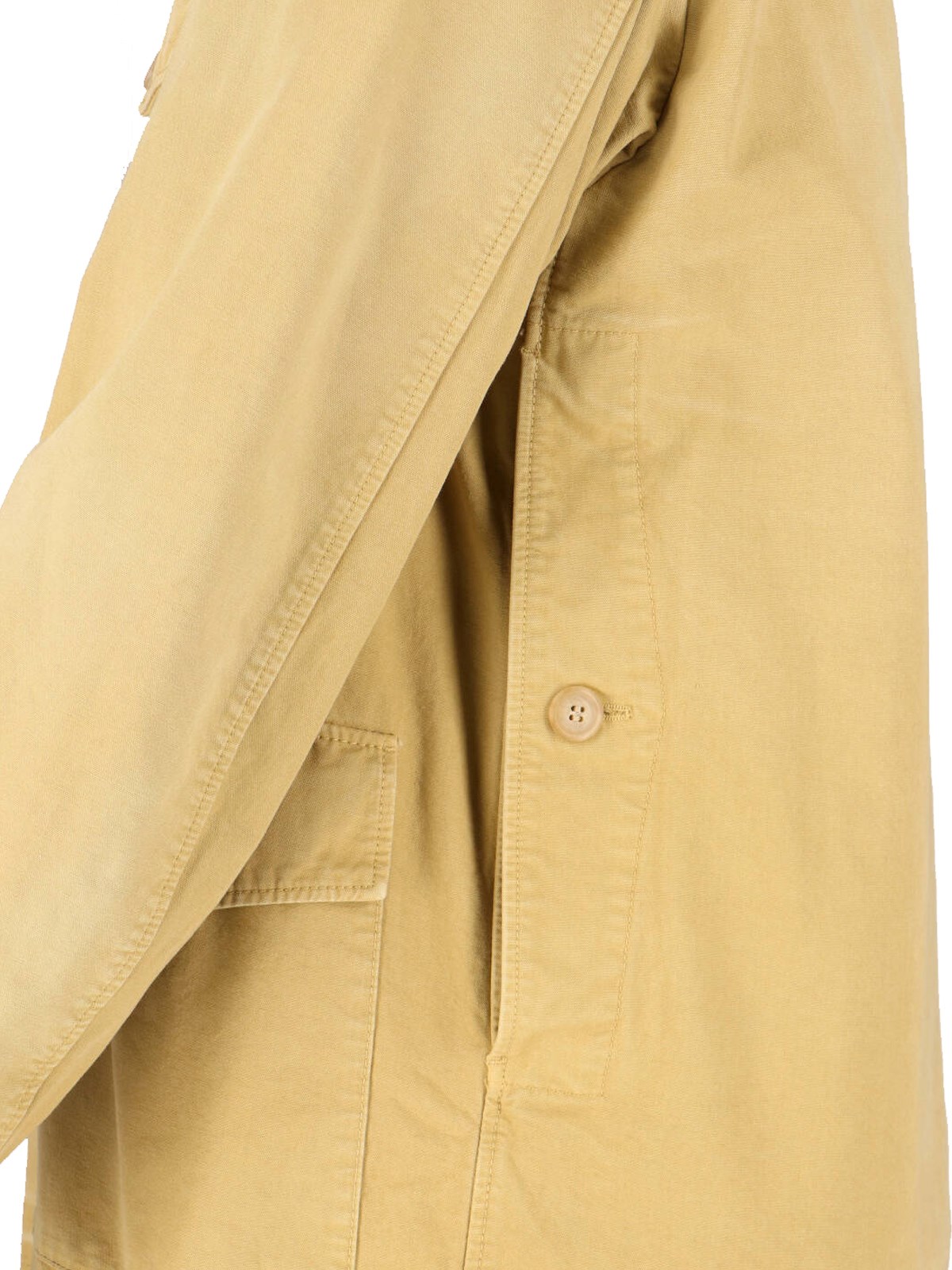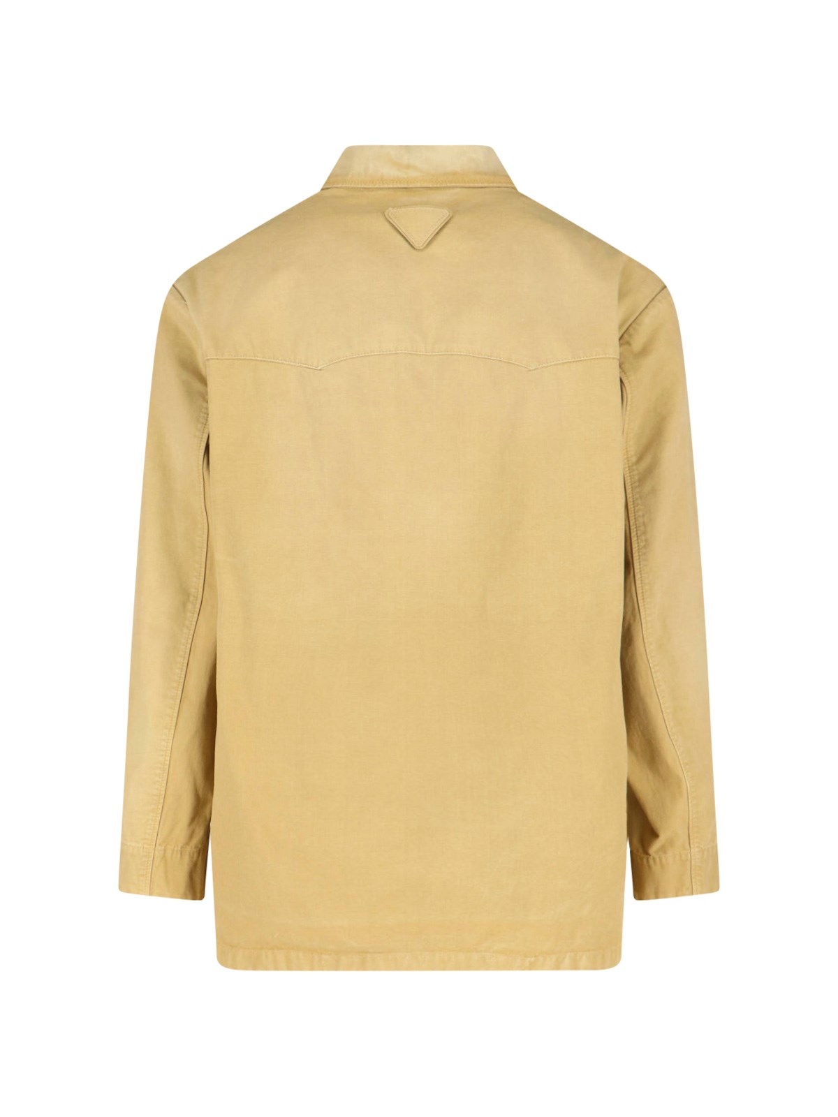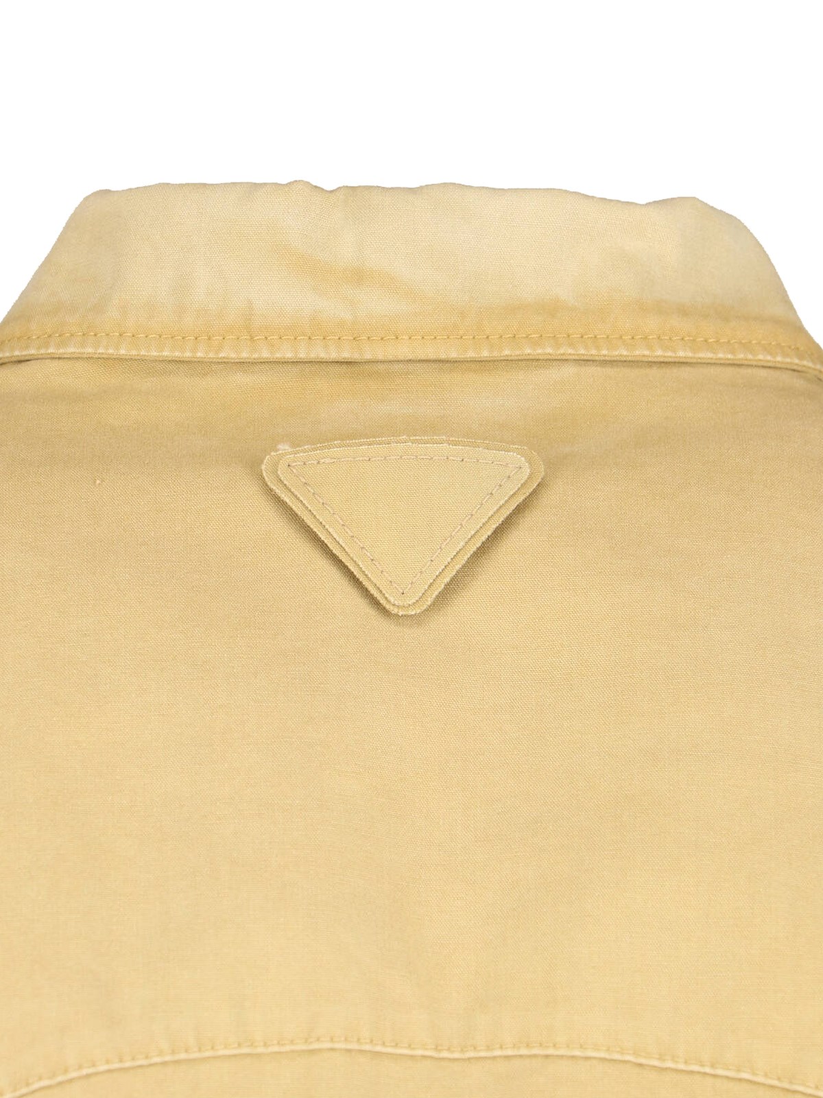 Prada beige cotton jacket with classic collar, button closure, long sleeves, four front flap pockets including two buttons, straight hem.