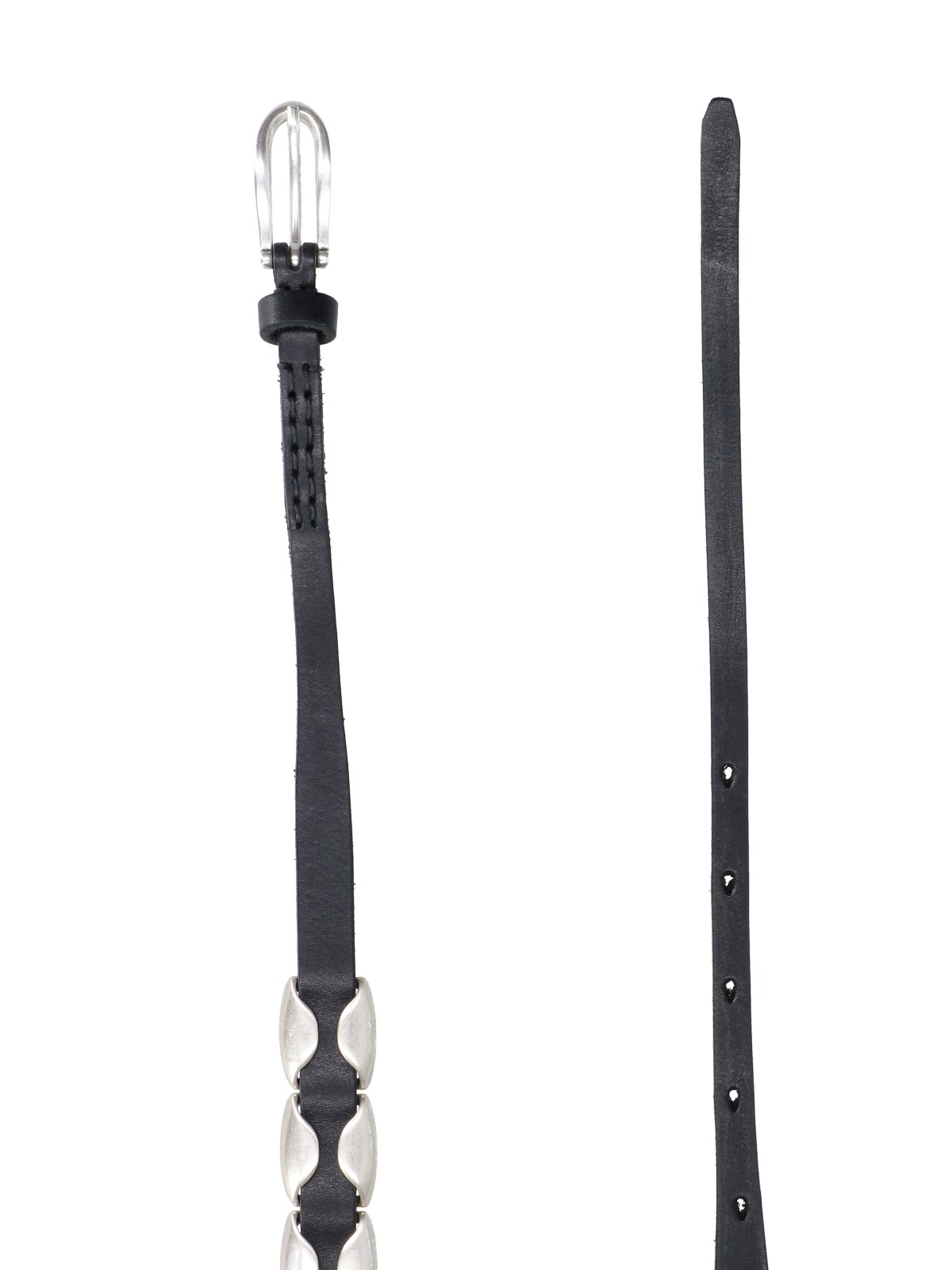 Black calfskin leather Our Legacy Billow belt, all-over silver metal details, adjustable.