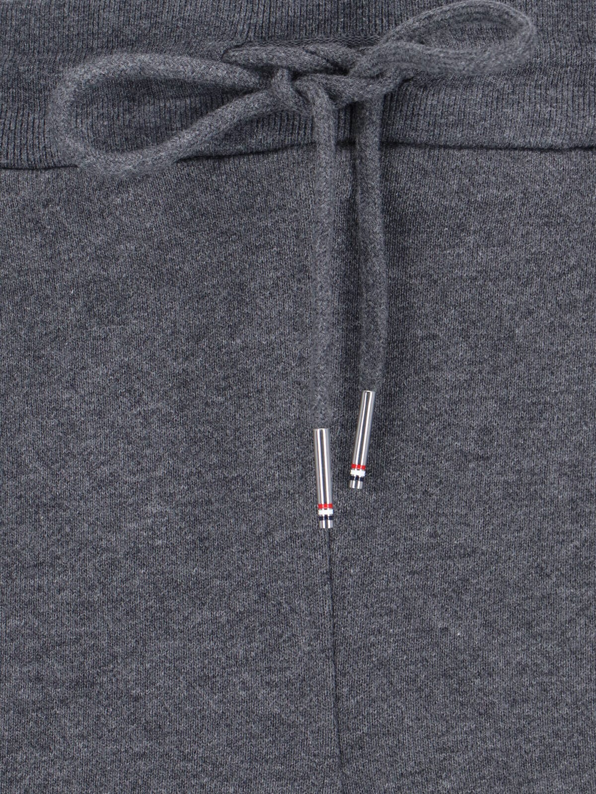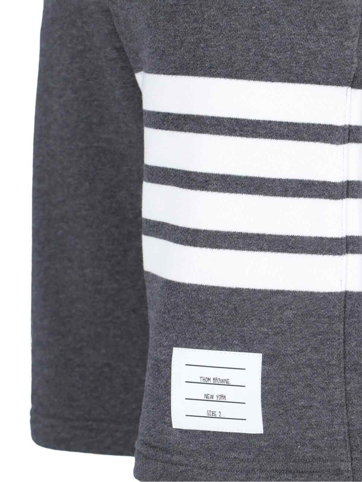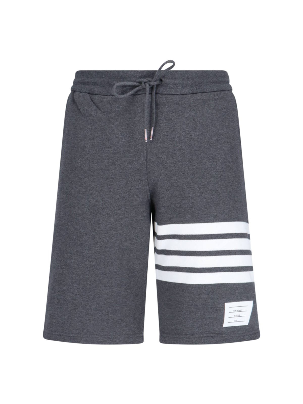 Thom Browne "4-Bar" dark grey cotton sports shorts with elastic mid waistband, drawstring closure, white bands on the front, logo label on the front, two side pockets, one back slip slip, tricolor grosgrain tab on the back, straight leg.