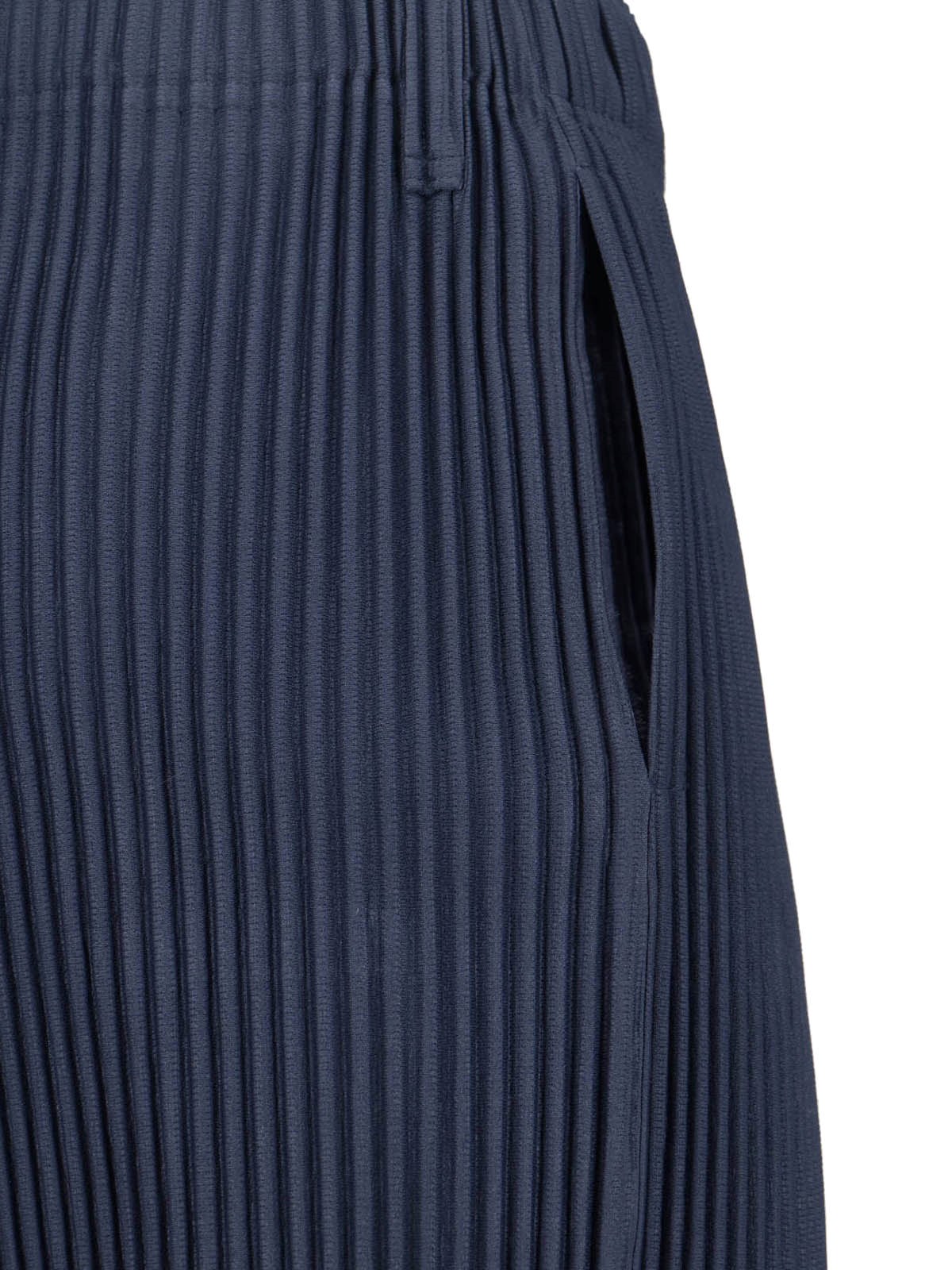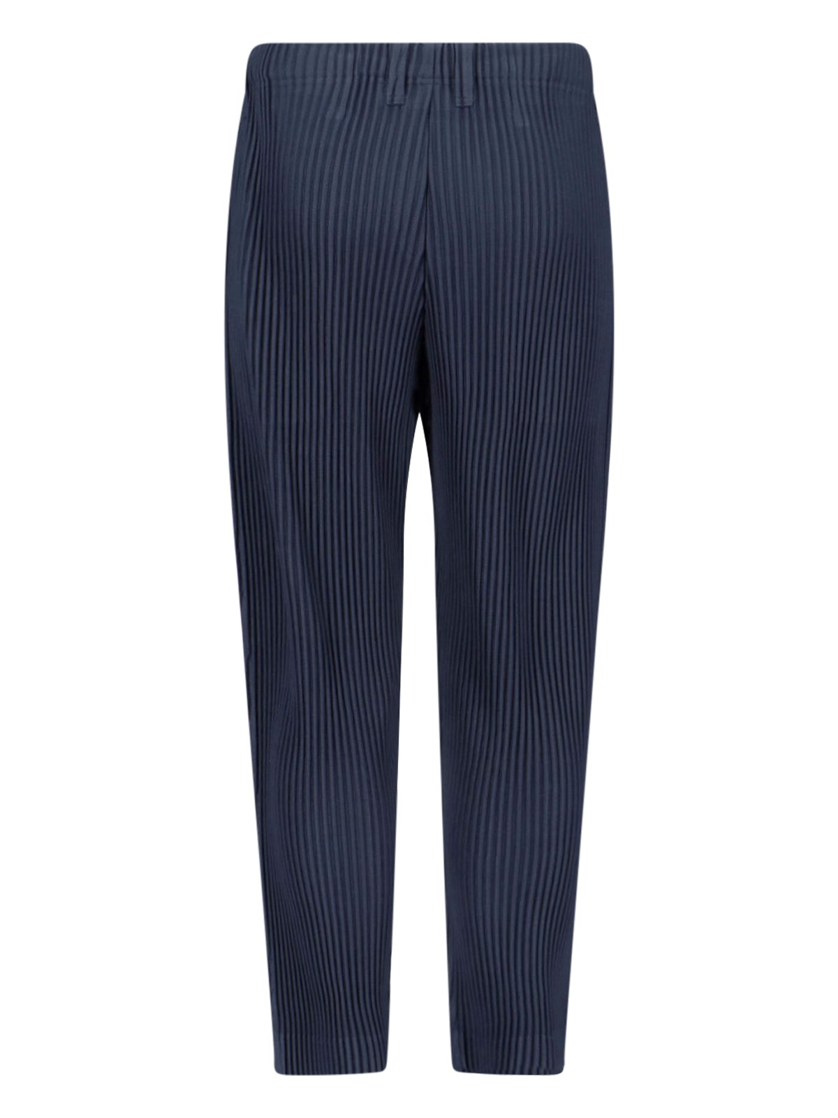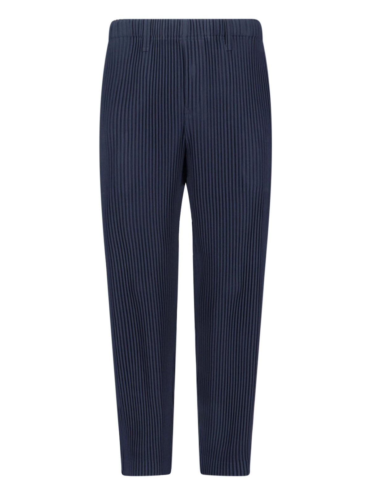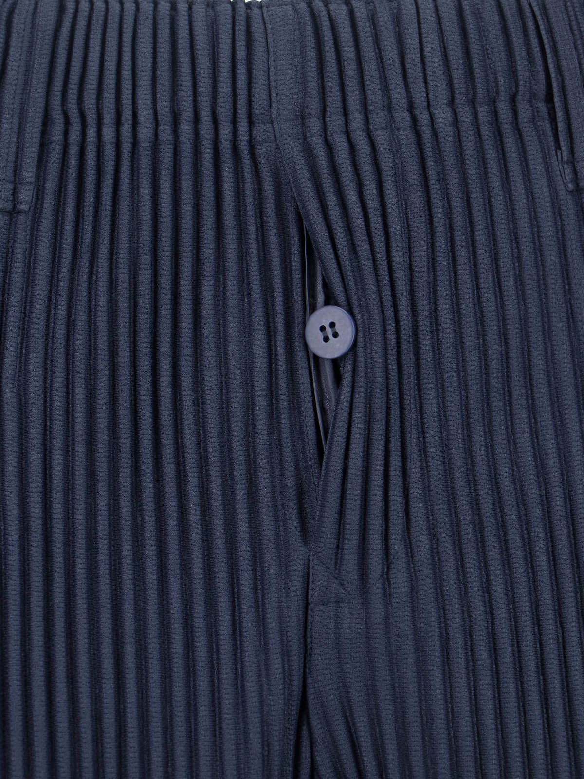 Homme Pleated pants in navy blue fabric with mid waist, button closure, two side pockets, front pleats, straight leg.