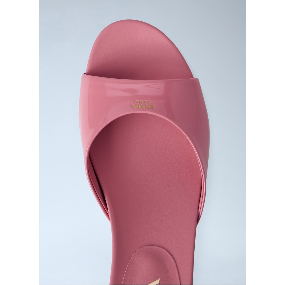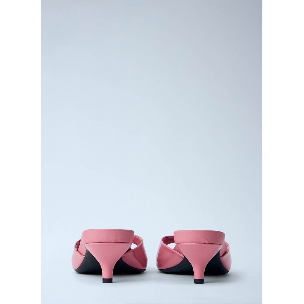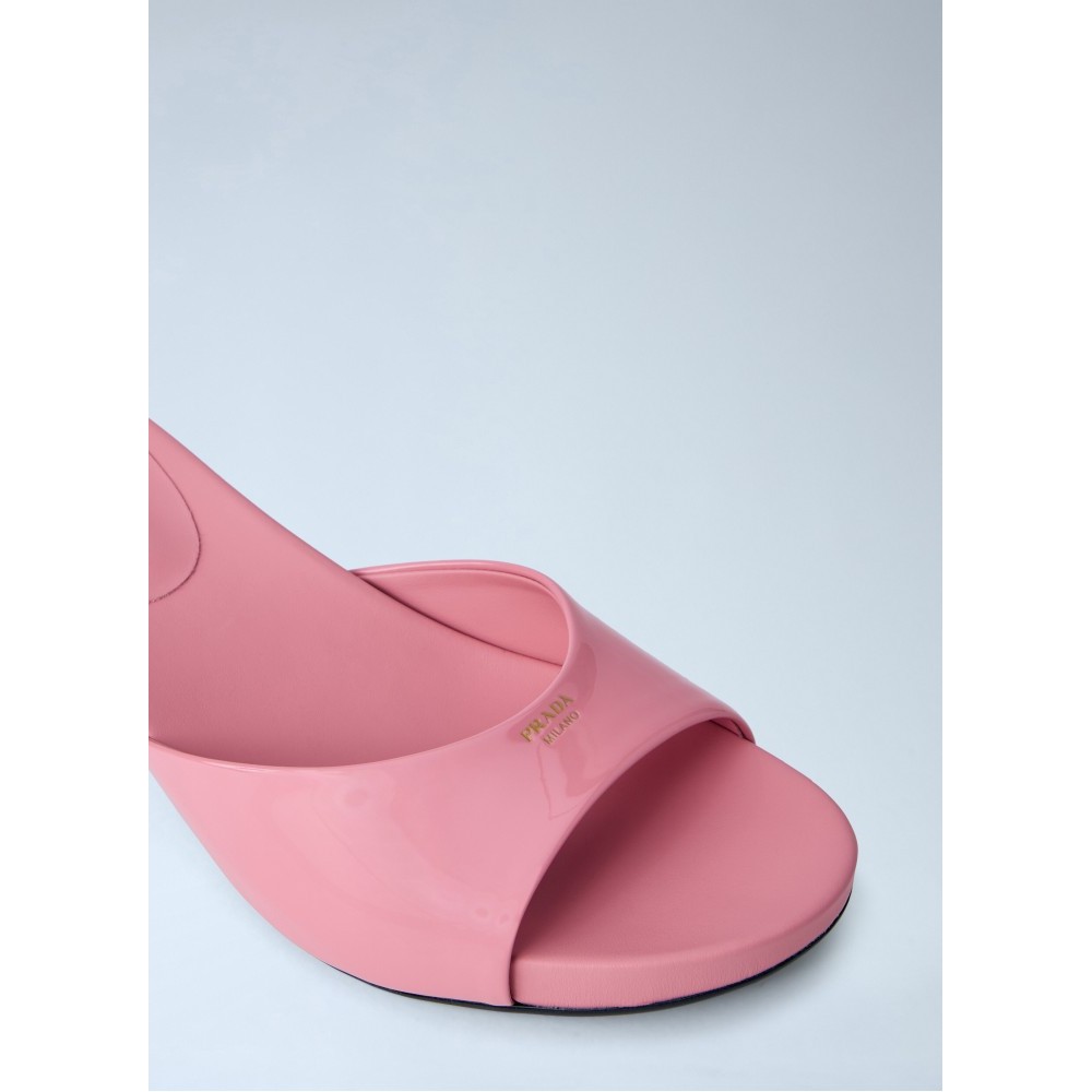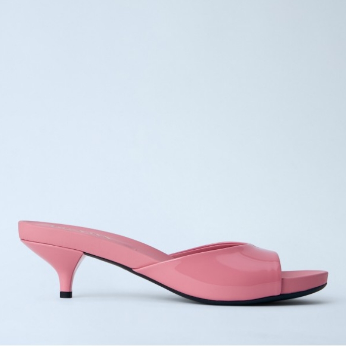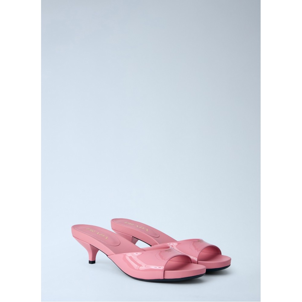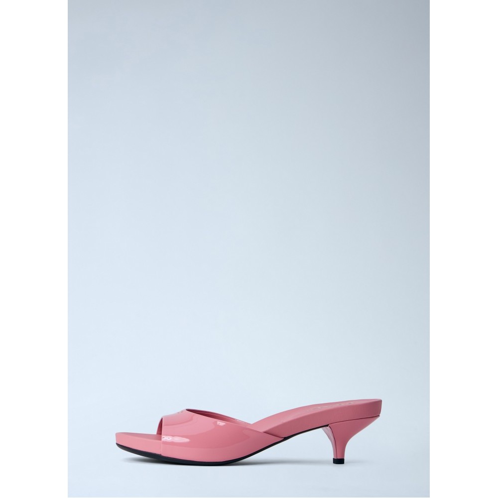 Open-toe mules with patent leather upper and kitten heel.