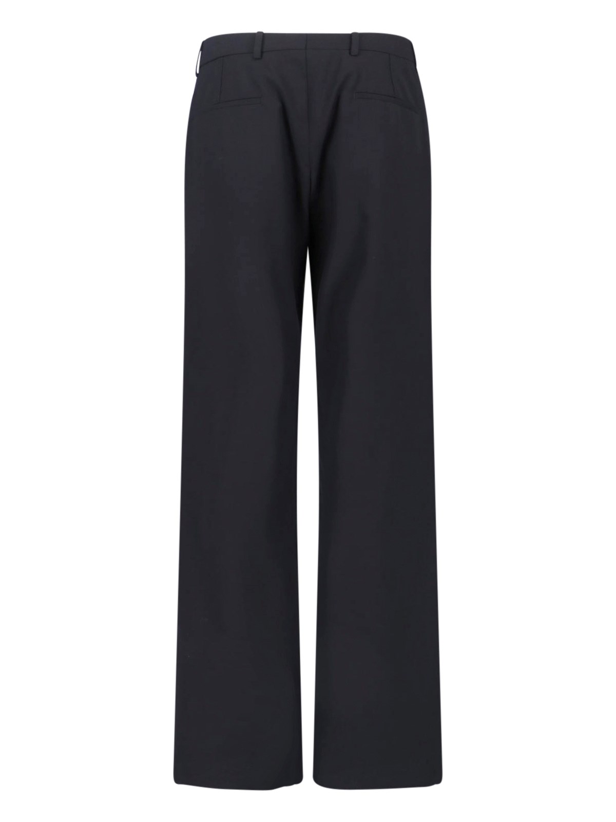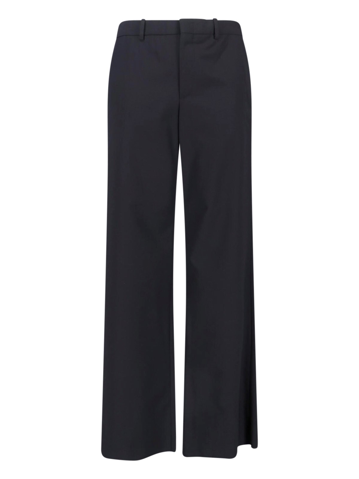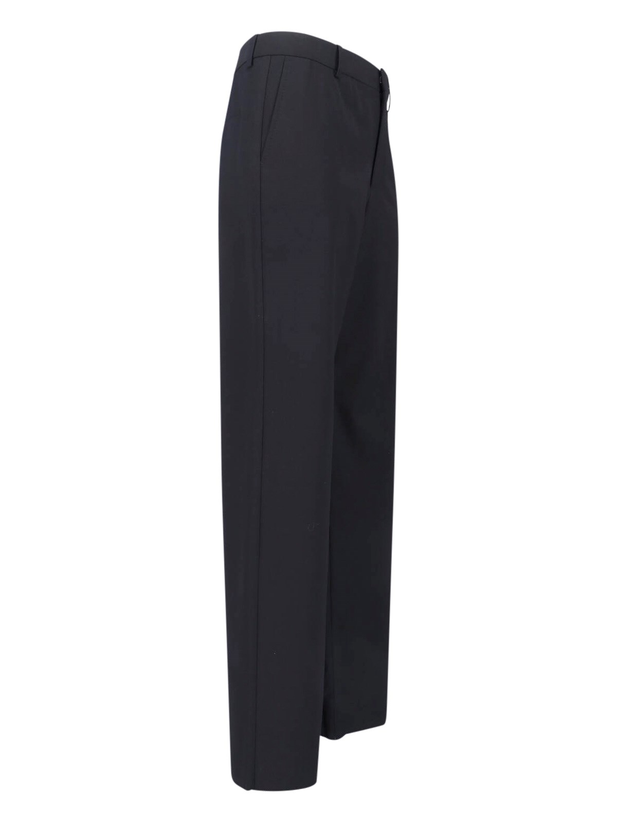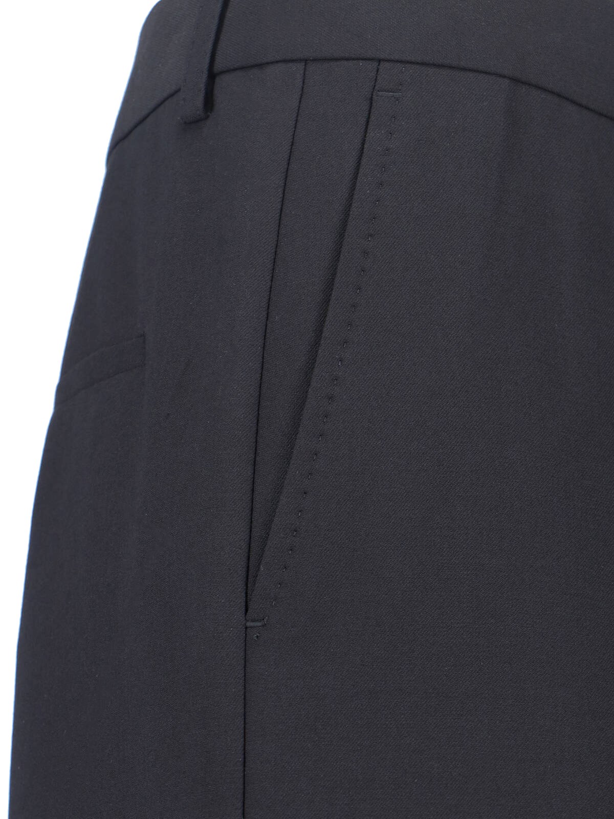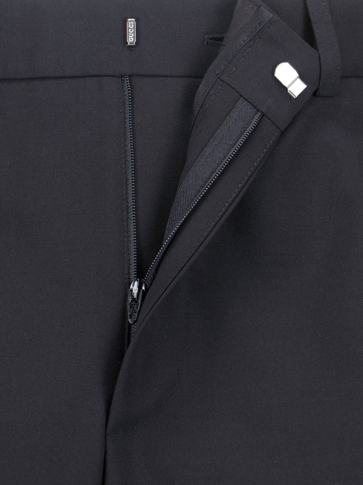 Gucci silk and wool twill pants, black, mid-rise, belt loops, button and hook closure, two side pockets, two back pockets, straight leg.