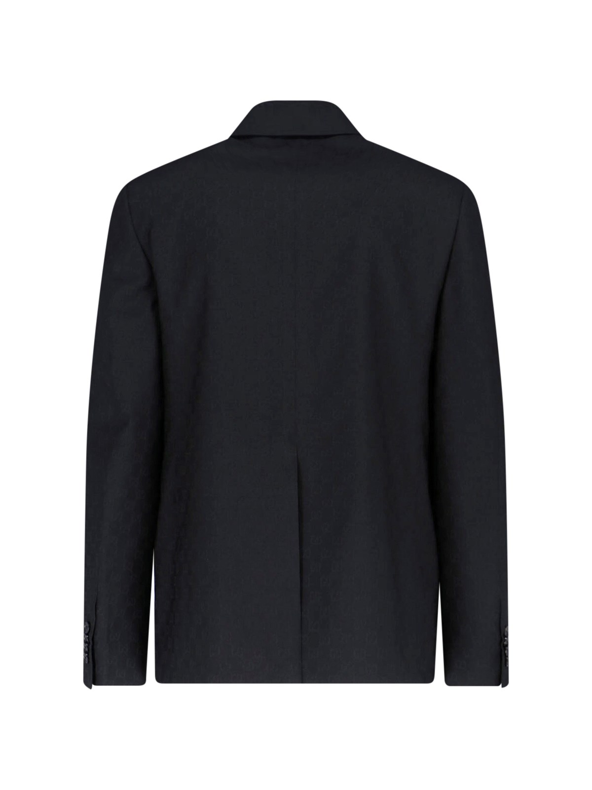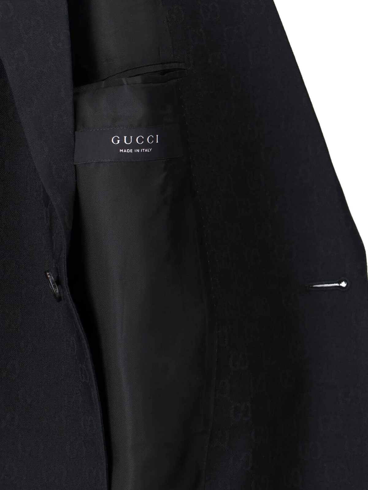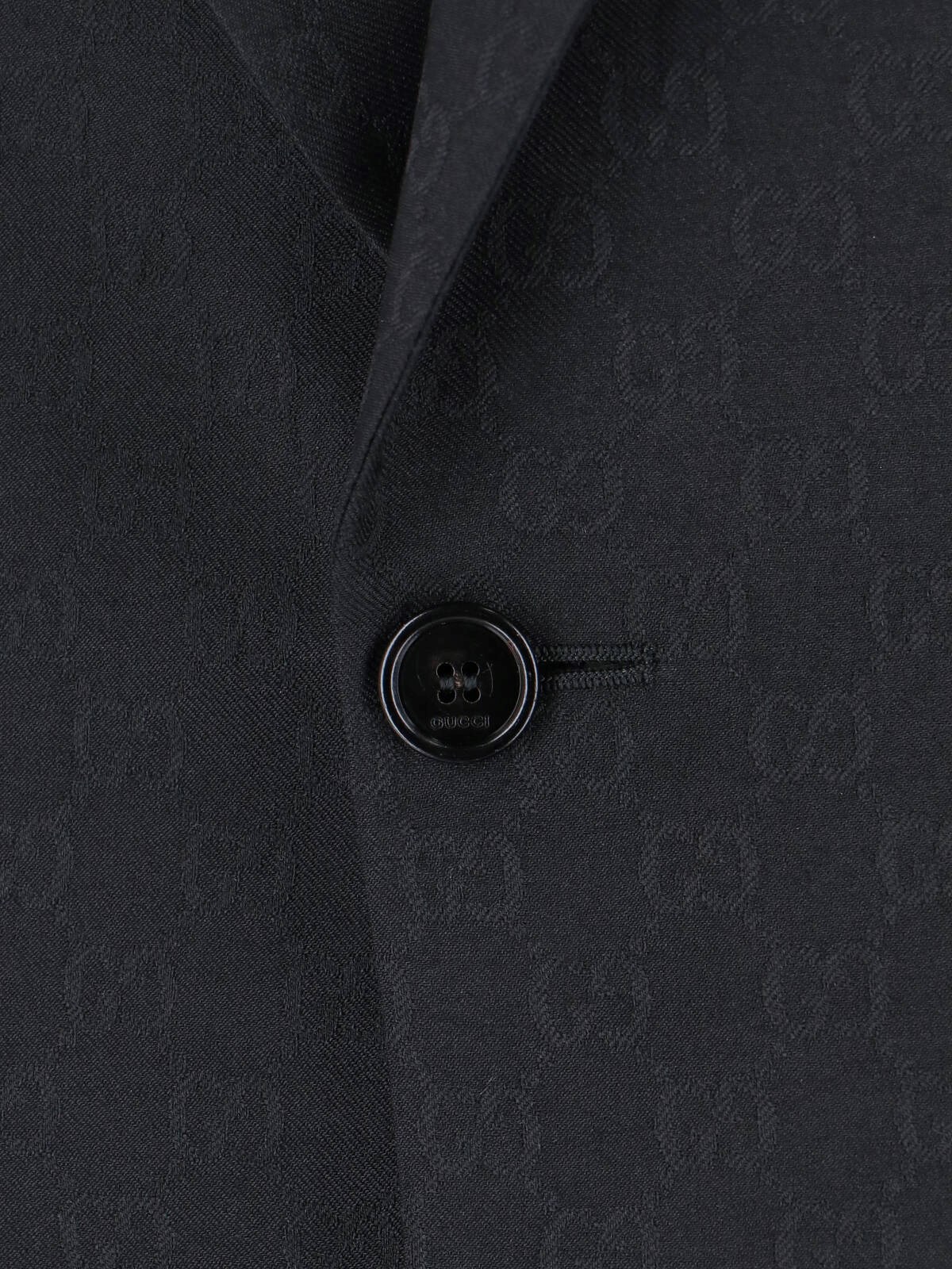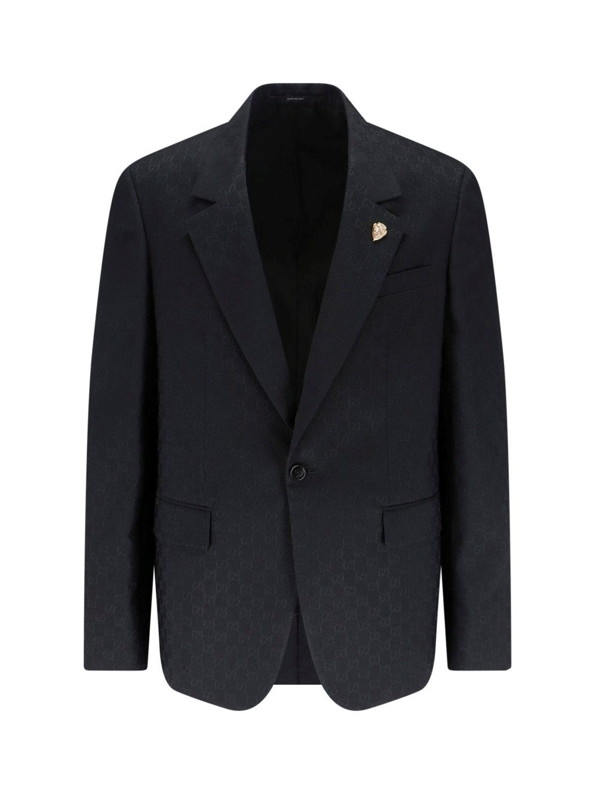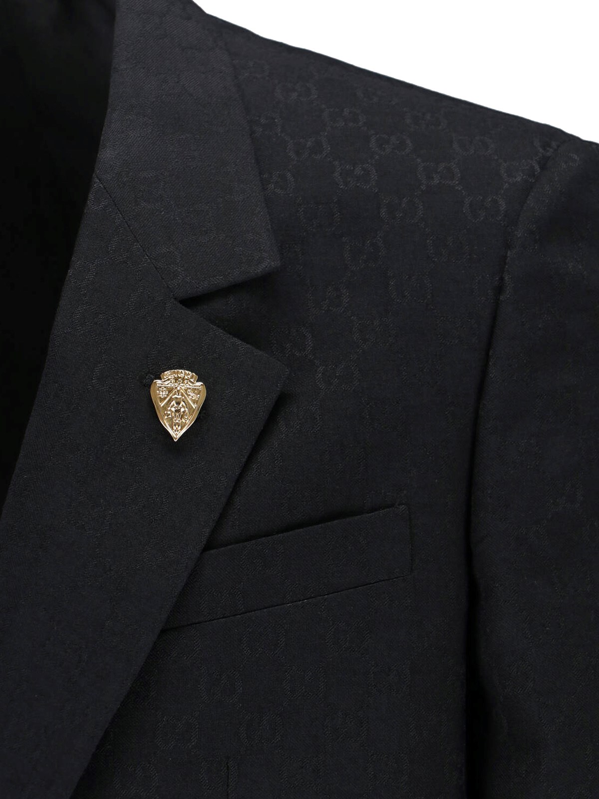 Gucci 'GG' black single-breasted wool blend blazer with classic lapels, button closure, chest welt pocket, two front flap pockets, removable gold metal brooch on the front, button cuffs, straight hem.