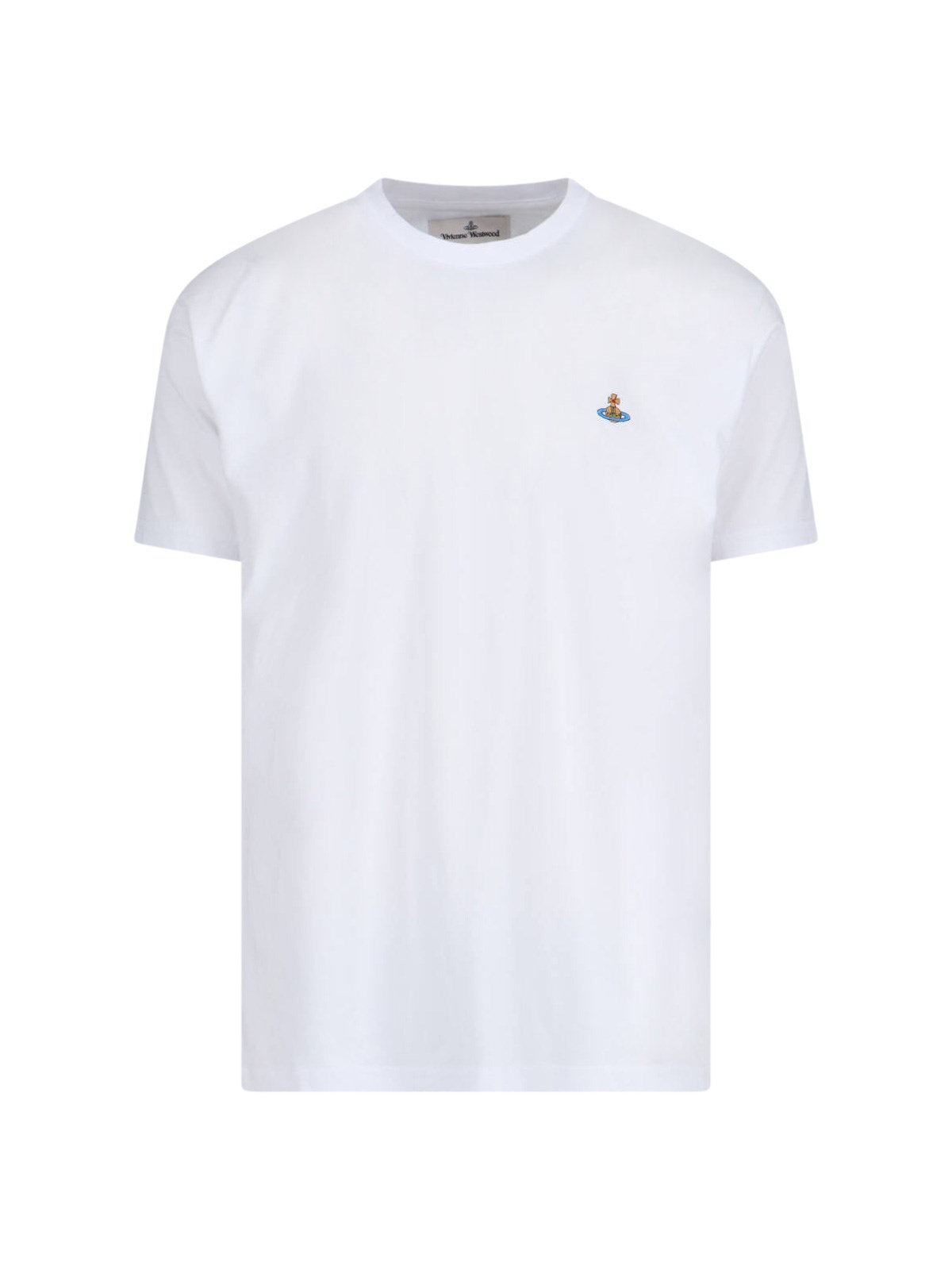T-shirt logo "Orb" by Vivienne Westwood, made of white cotton, crew neck, short sleeves, multicolor logo embroidery on the chest, straight hem.