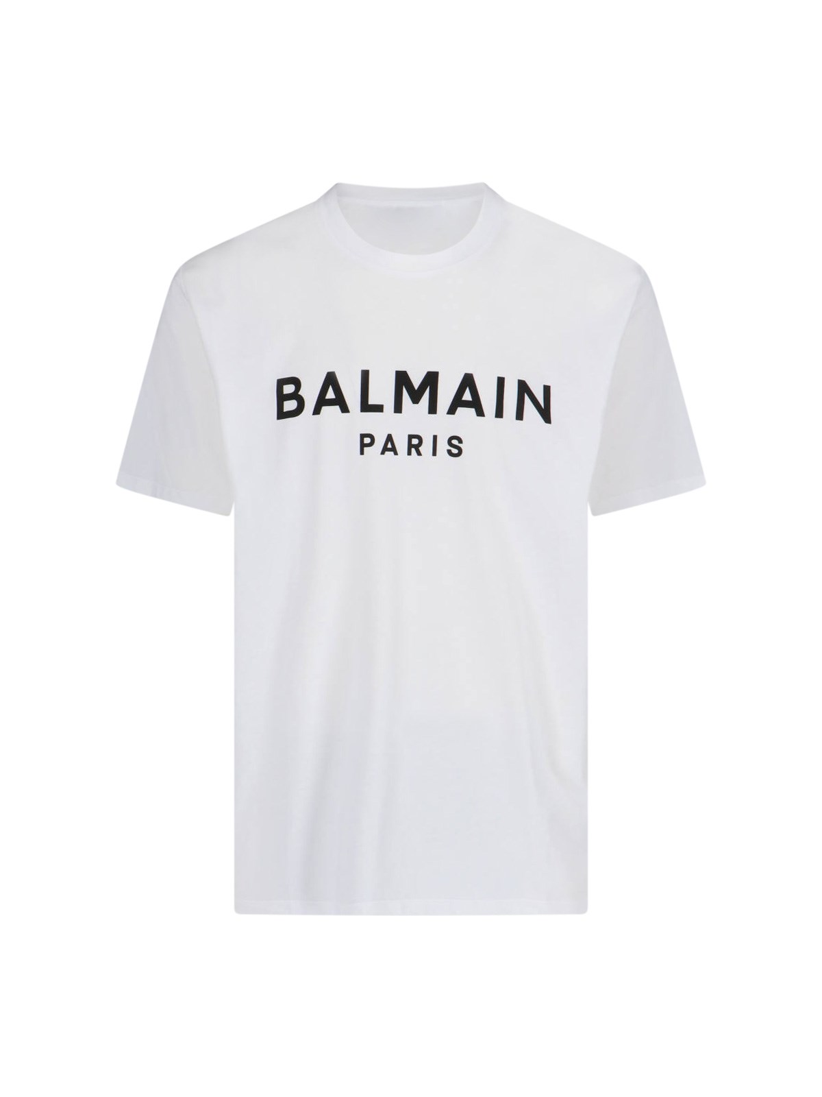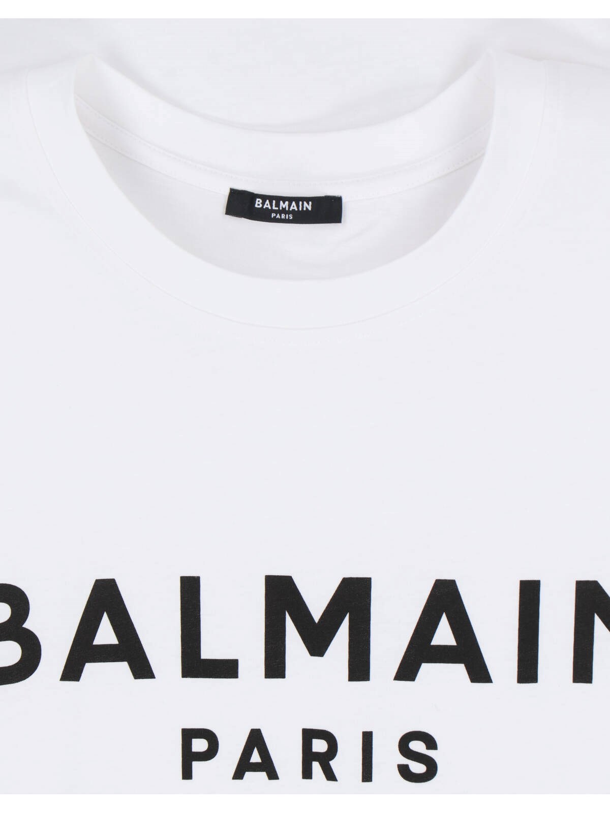 Balmain "Paris" white cotton crew neck t-shirt with short sleeves, contrasting chest logo print, straight hem.