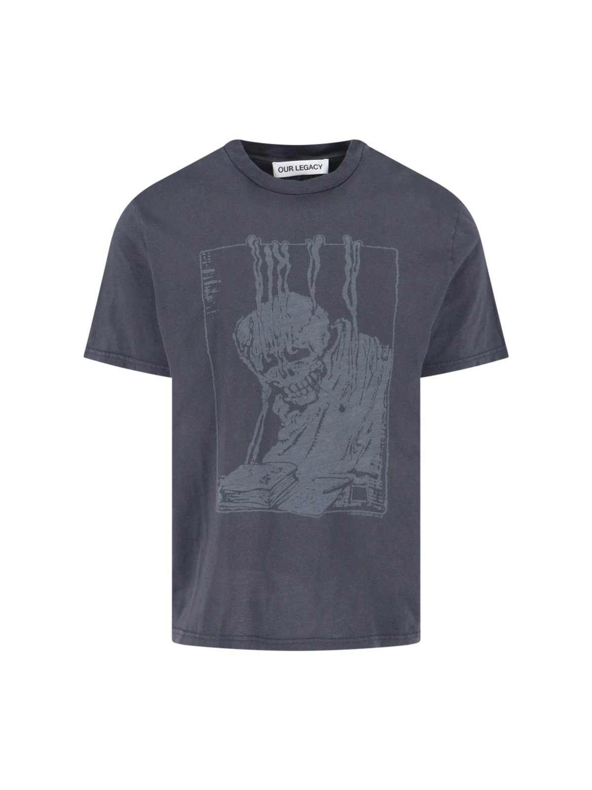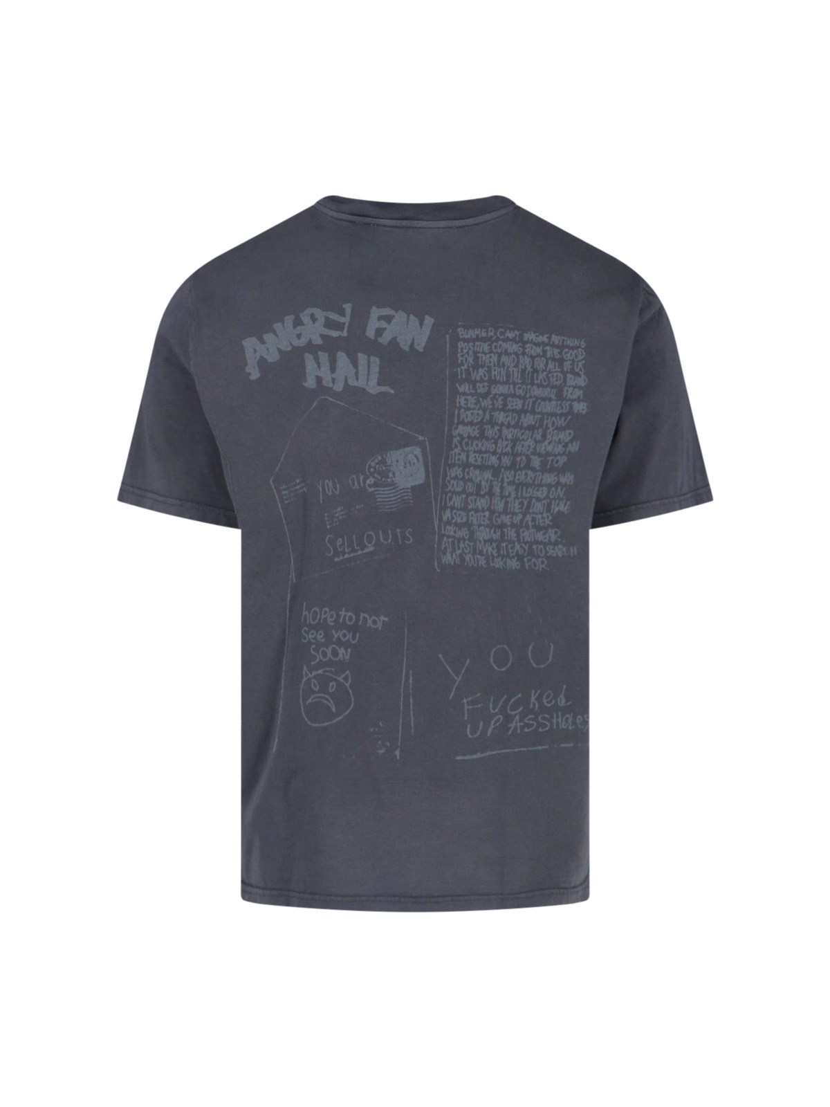 Our Legacy gray cotton Angry Fan Mail T-shirt with crewneck, short sleeves, contrasting print on the front and back, and straight hem.