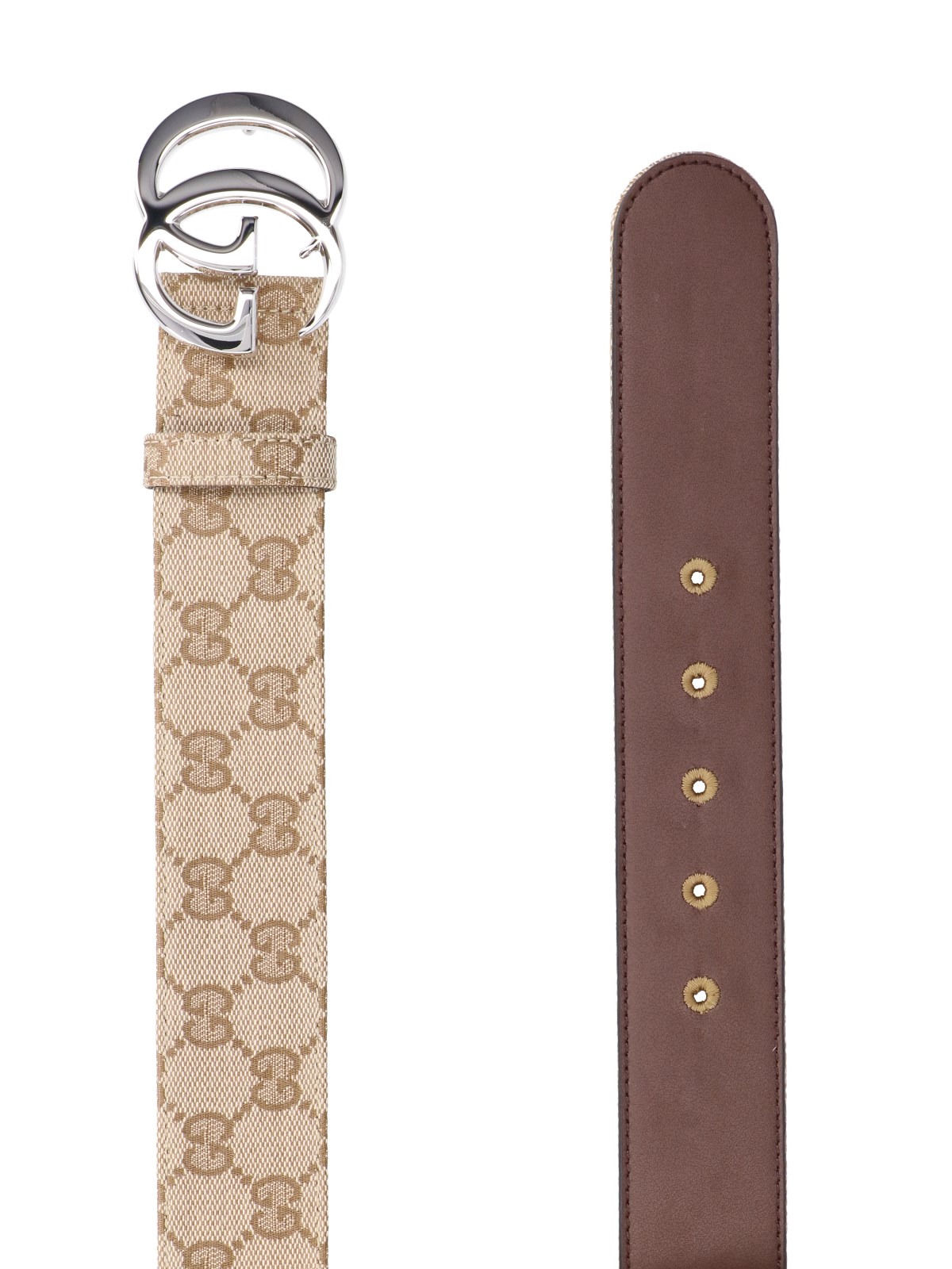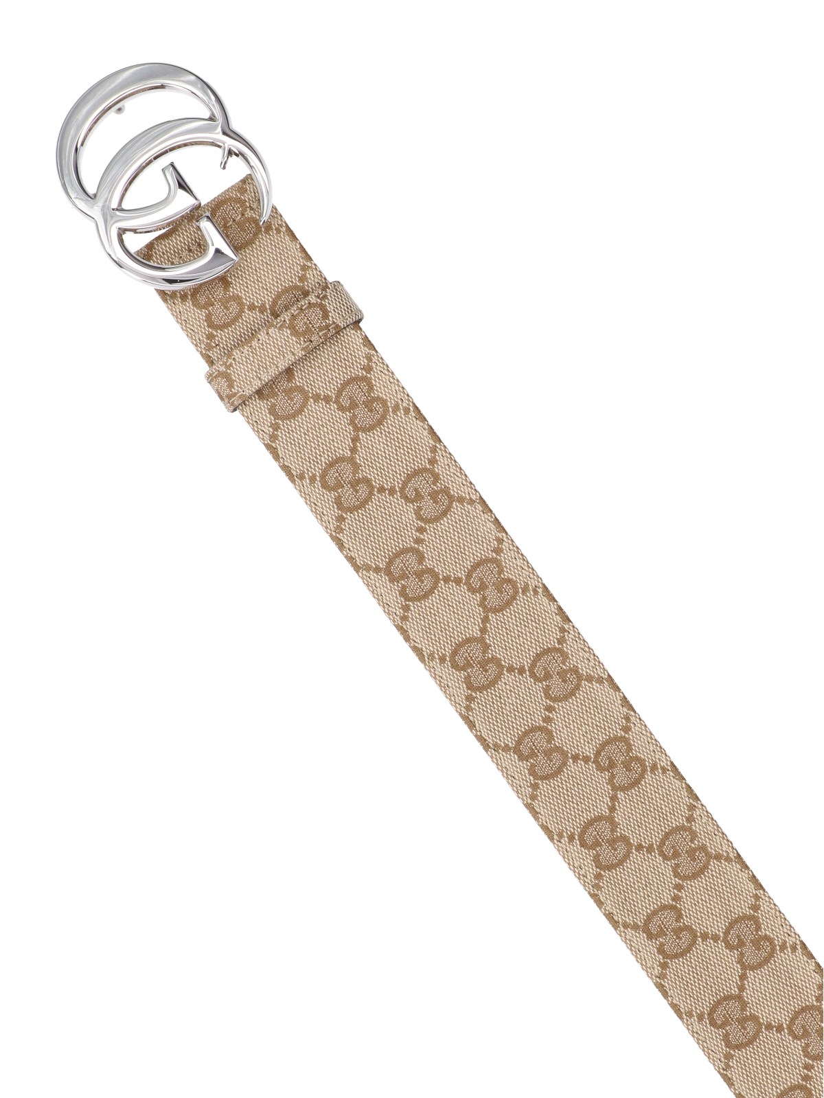Gucci 'GG Marmont' belt in beige fabric with all-over 'GG Supreme' logo pattern, silver metal 'Flat Marmont' logo buckle, adjustable.