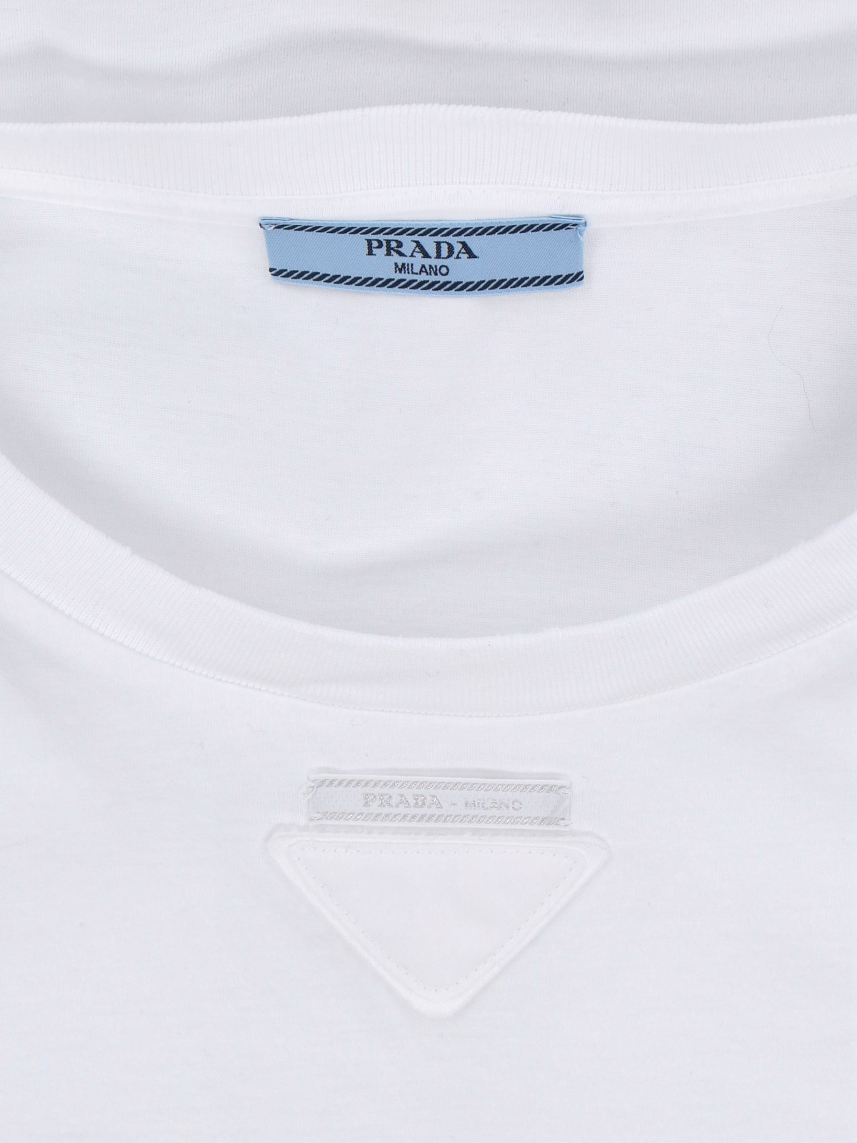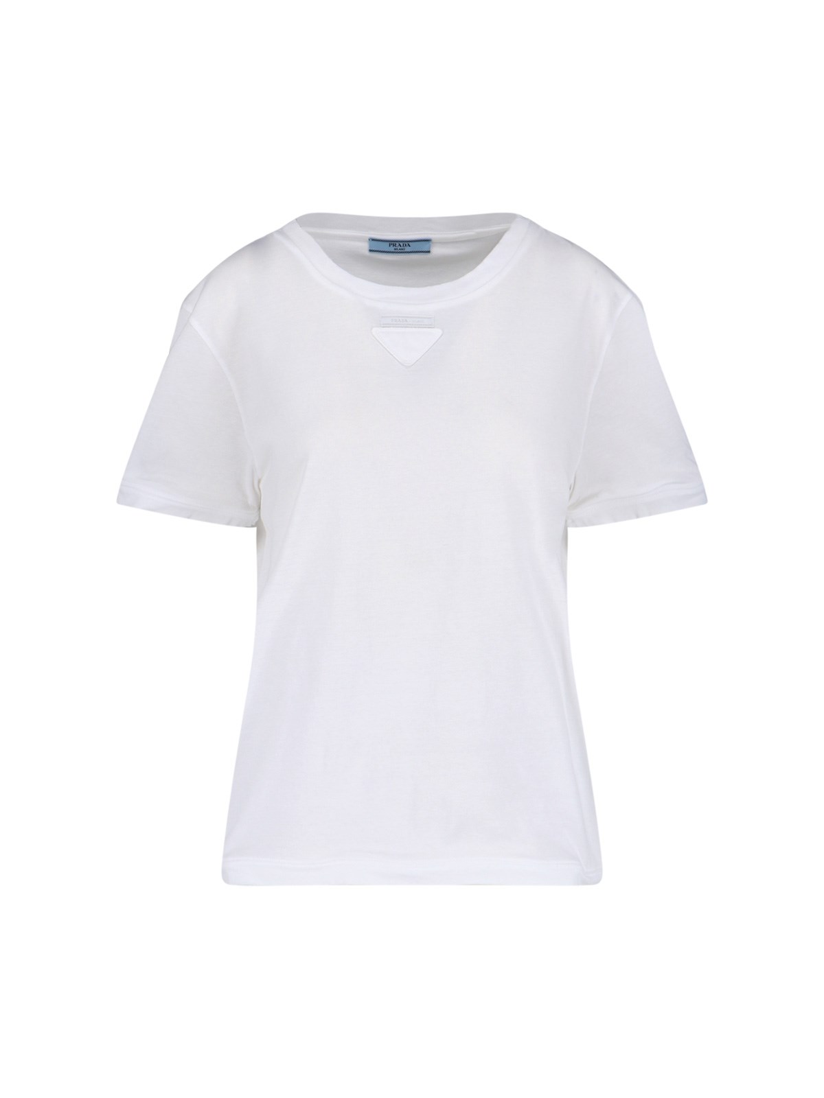 Prada logo T-shirt in white cotton with crewneck, short sleeves, tone-on-tone triangle logo detail on the front, straight hem.