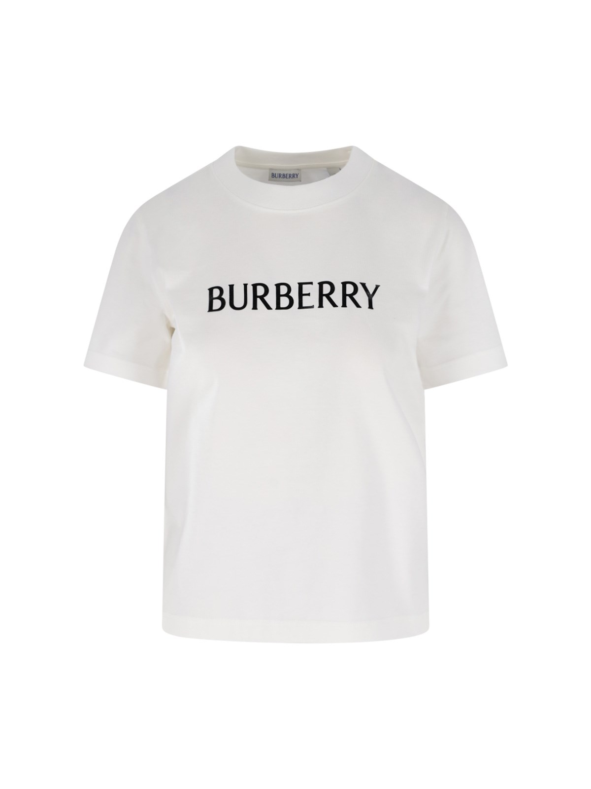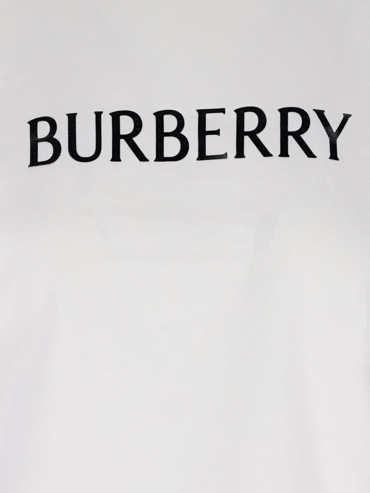 Burberry logo t-shirt in white cotton with crew neck, short sleeves, contrasting lettering logo at the front, straight hem.