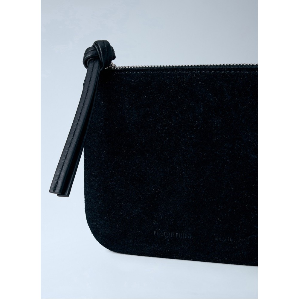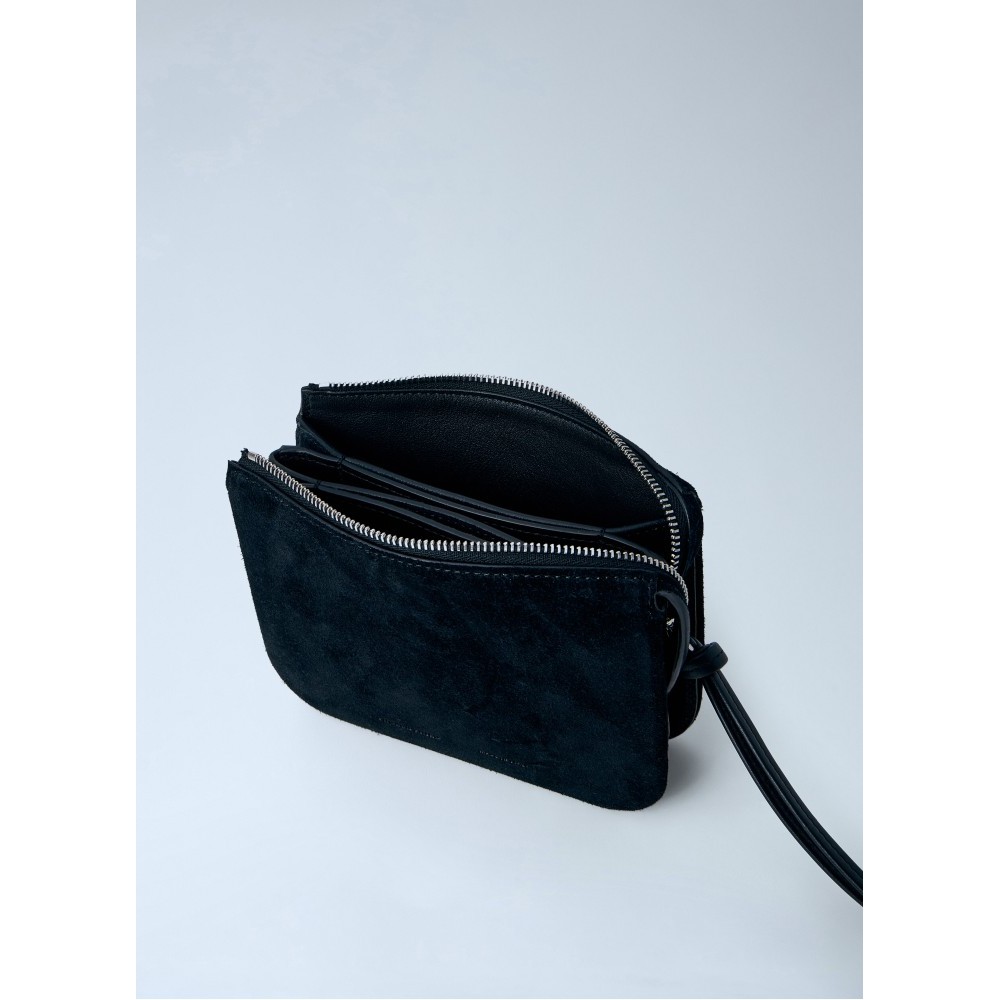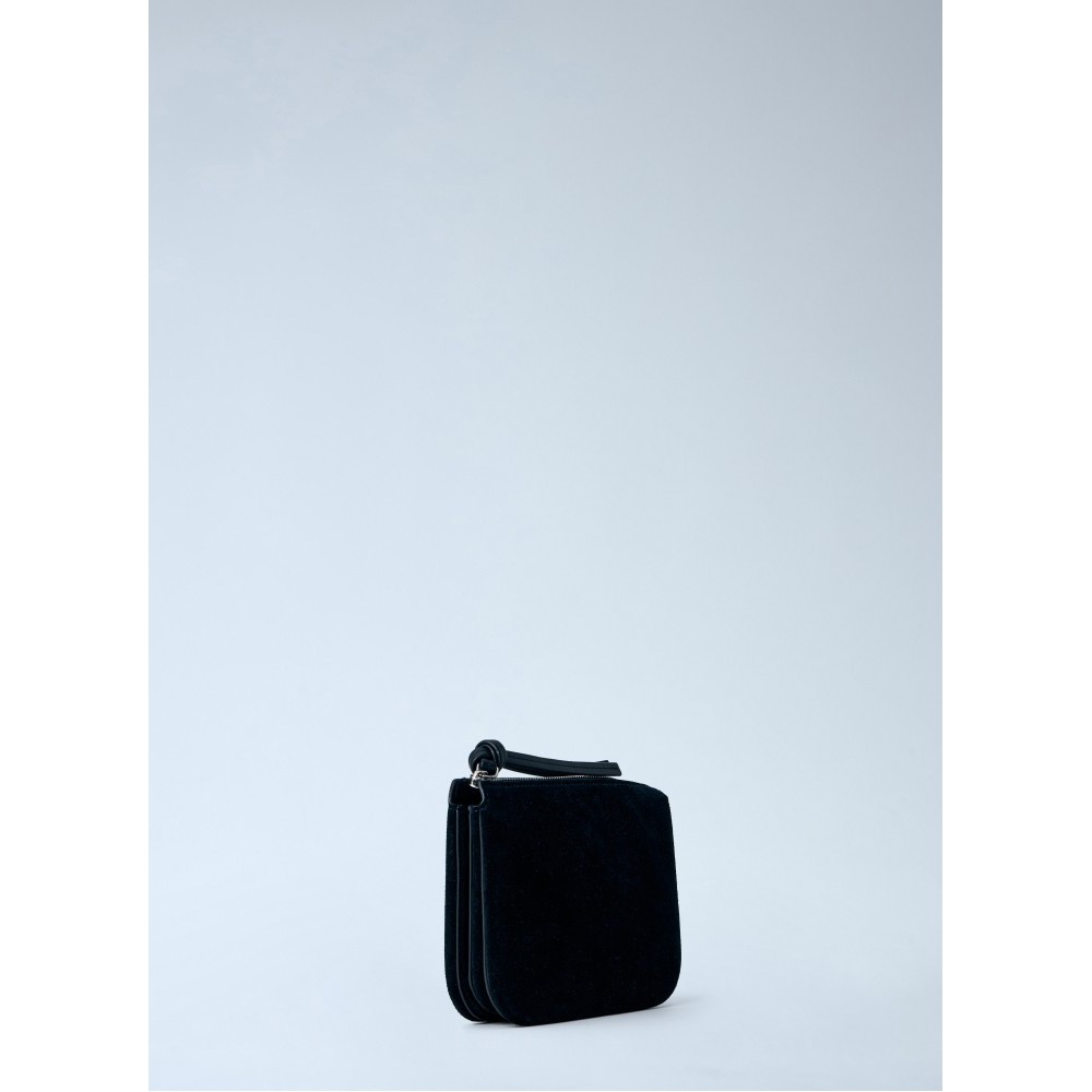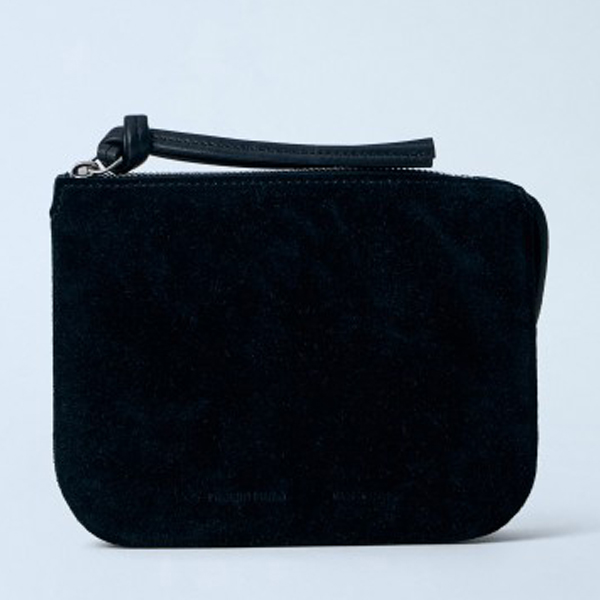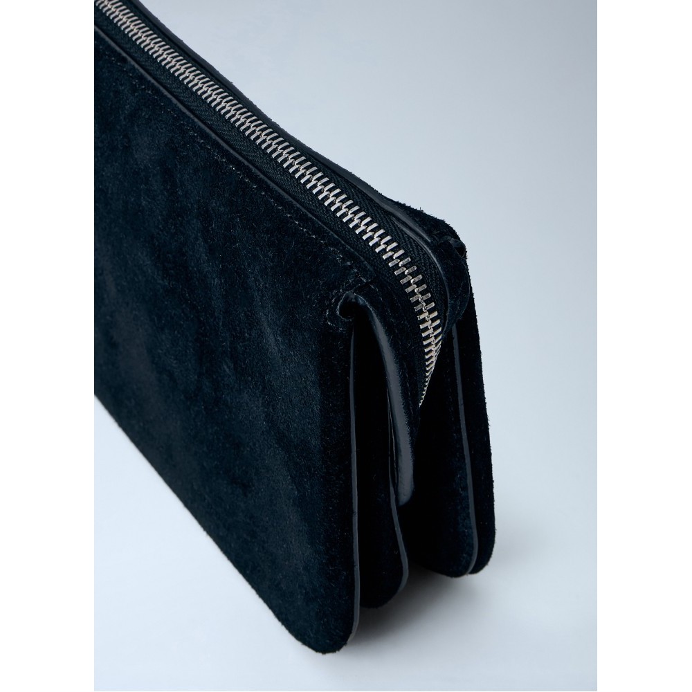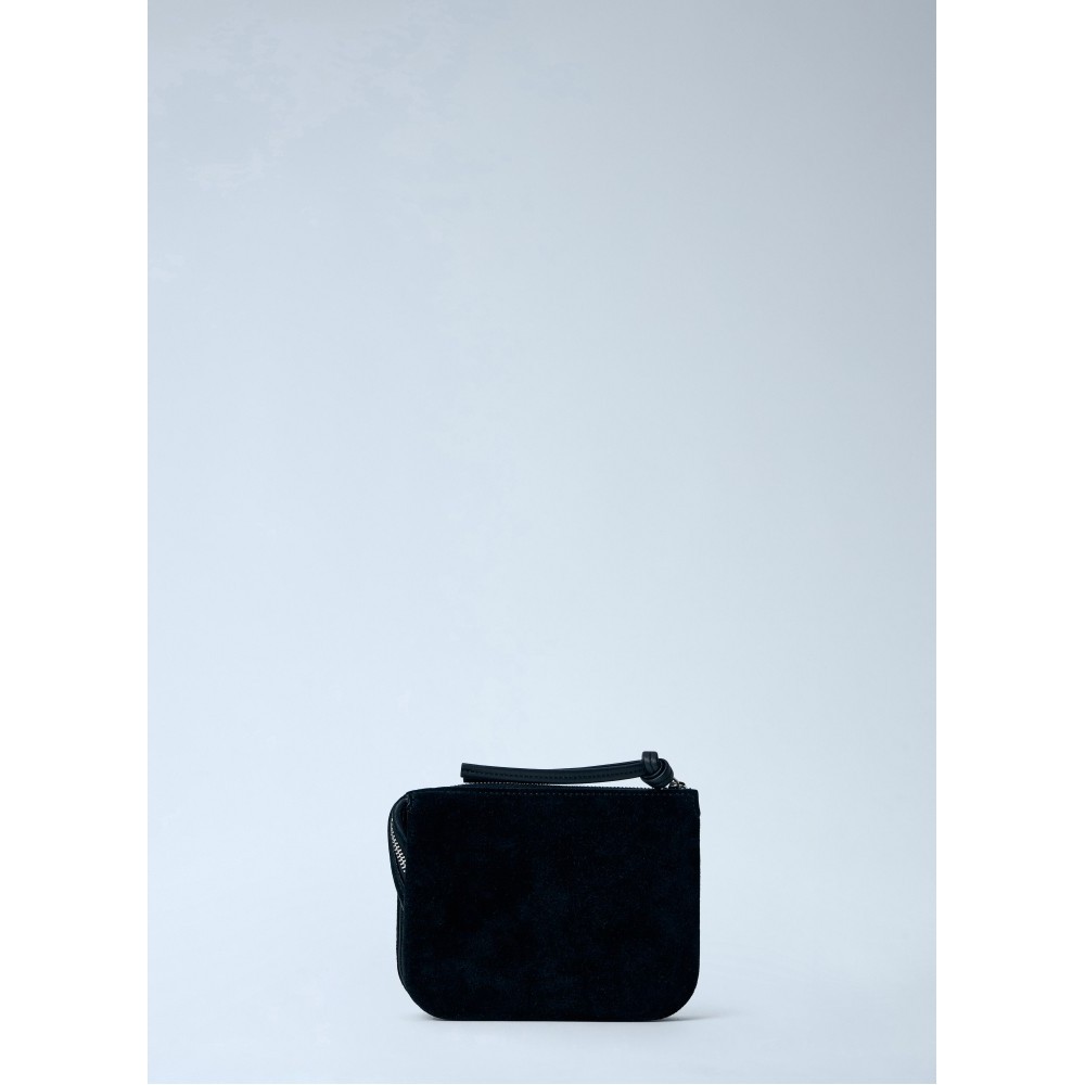 Compact suede pouch with top zip fastening.