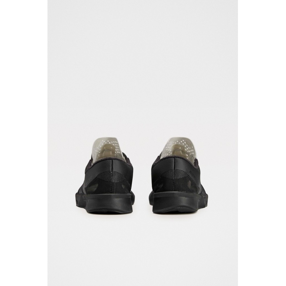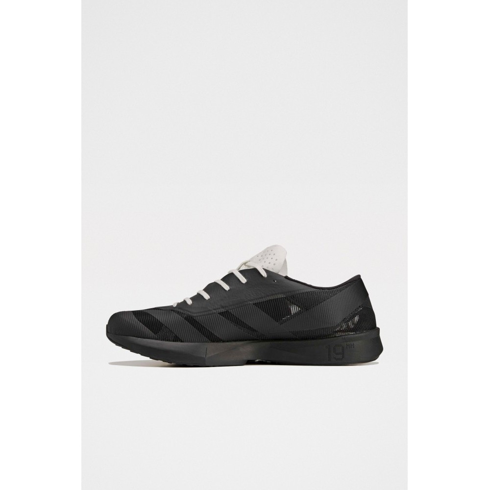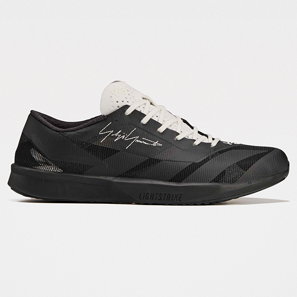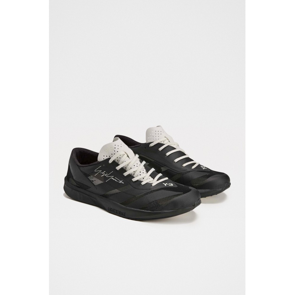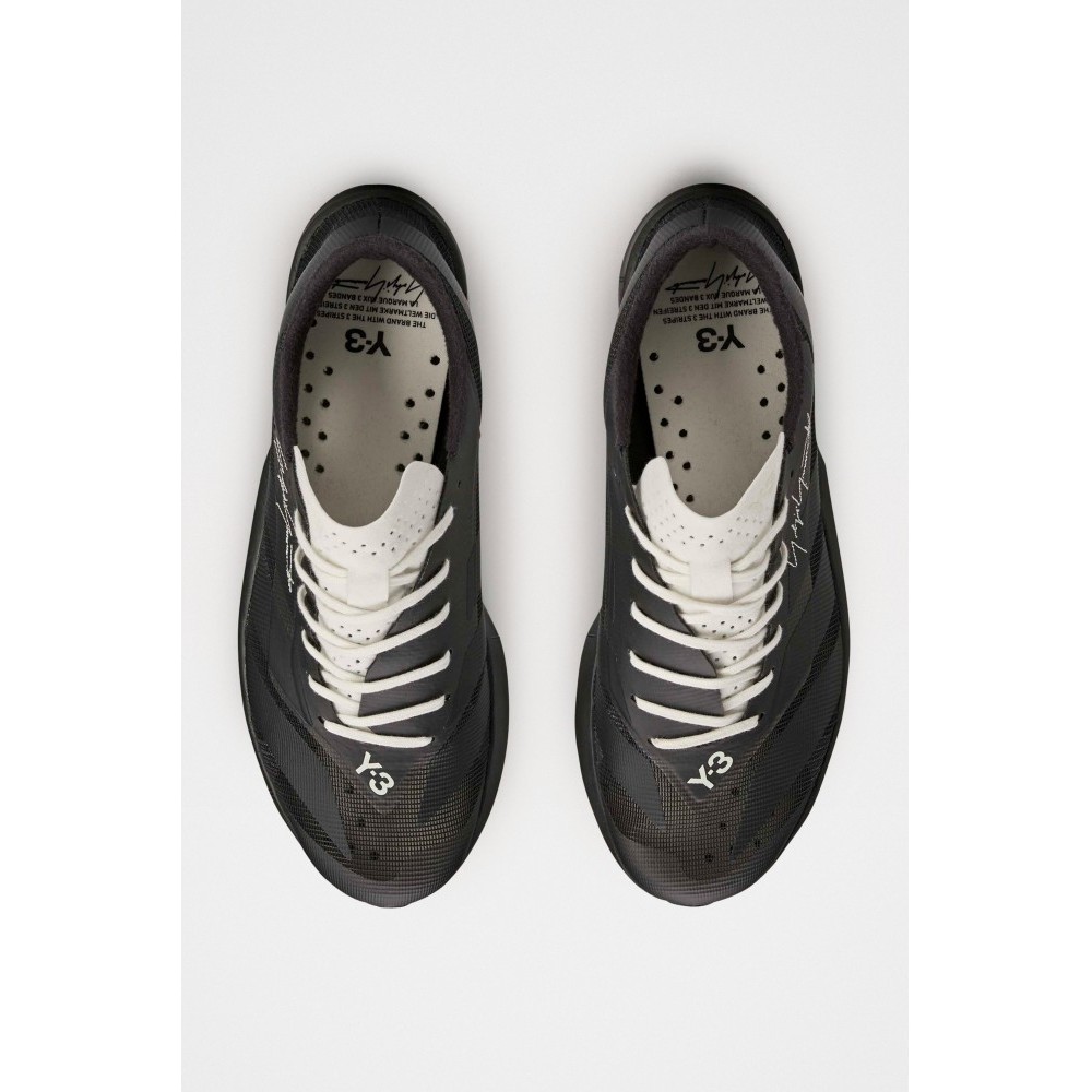 Running sneakers from Y-3. Textile and synthetic upper in layered black tones with an asymmetric eyestay exposing a lighter tongue panel. Forefoot carries Yohji Yamamotos stitched signature and Y-3 branding. Lightweight cushioned midsole with a low stack height. Rubber outsole with defined tread pattern for grip on city surfaces.