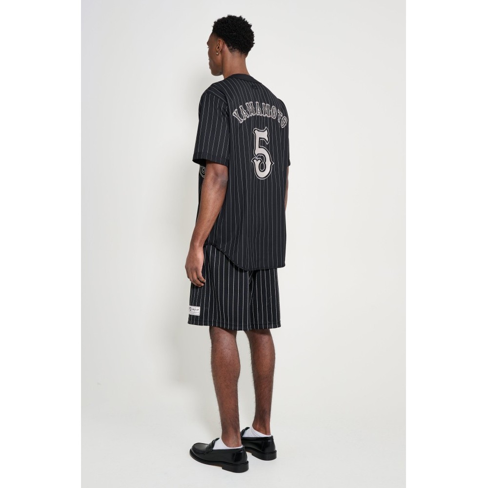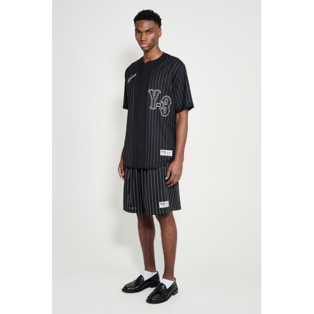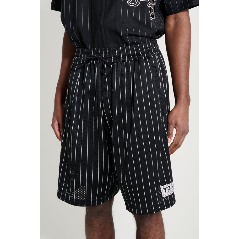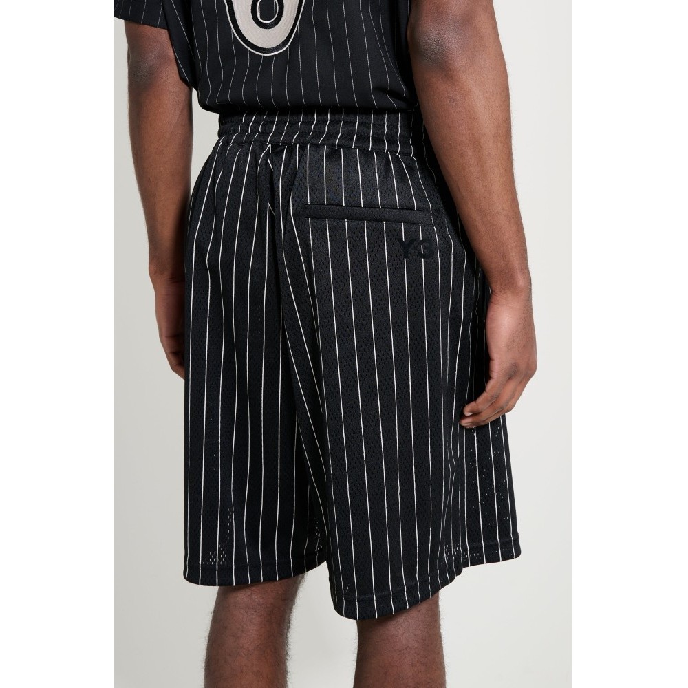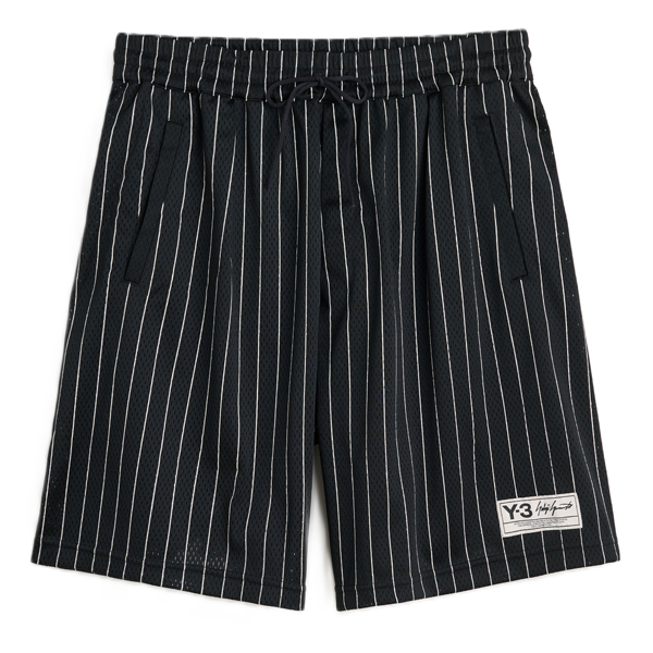 Mesh shorts from Y-3. Recycled polyester flatback mesh with a subtle vertical stripe structure and soft drape. Elastic waistband with an internal drawcord adjusts the rise. Front carries side-entry pockets and a woven patch at the hem, while the back includes a single welt pocket and tonal printed branding under the seat.