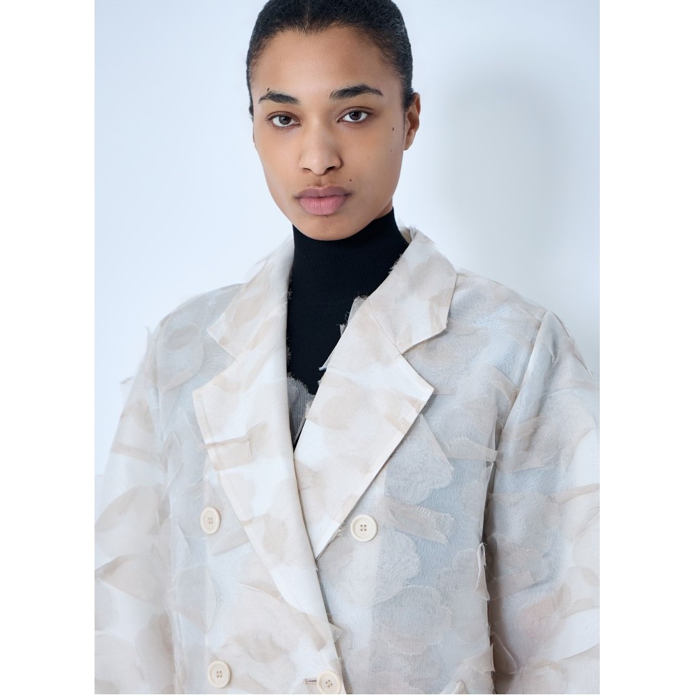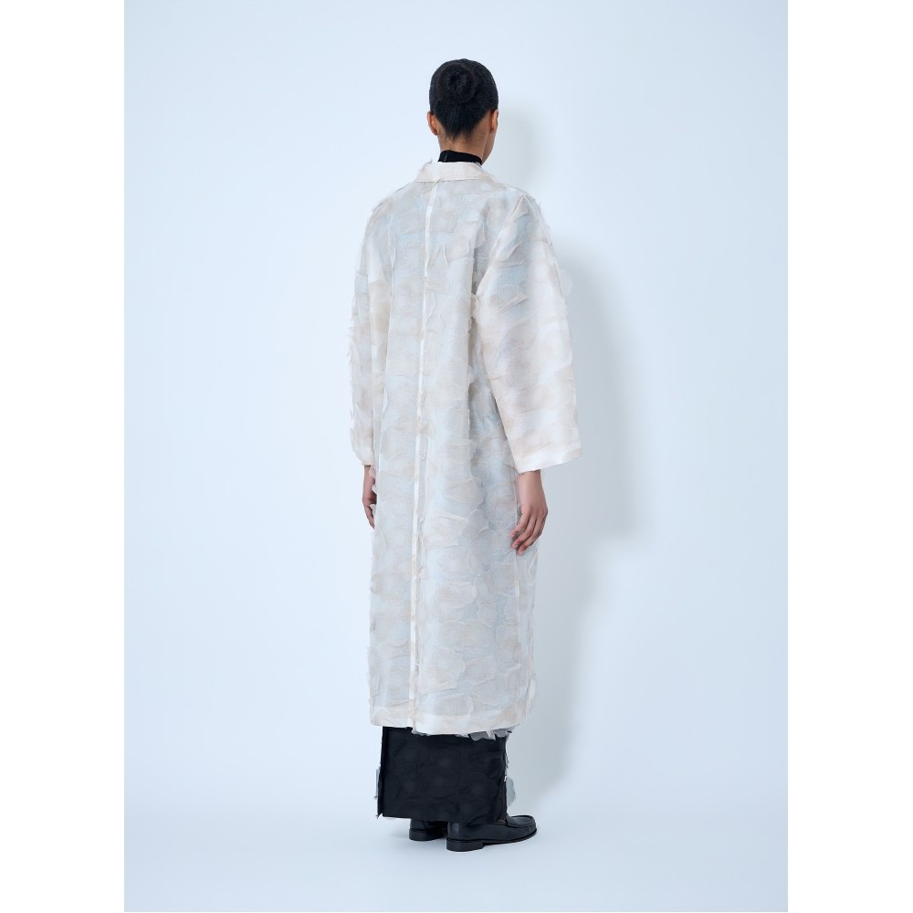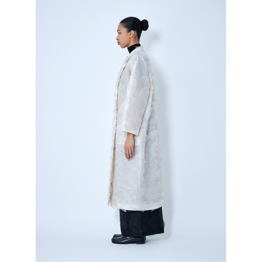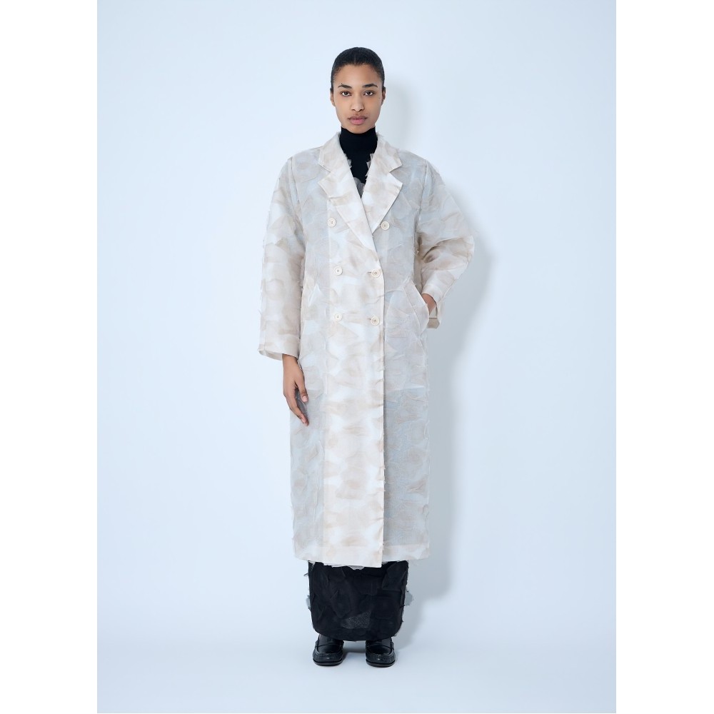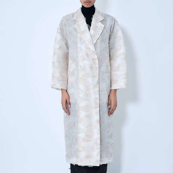 Double-breasted long coat with notched lapels.