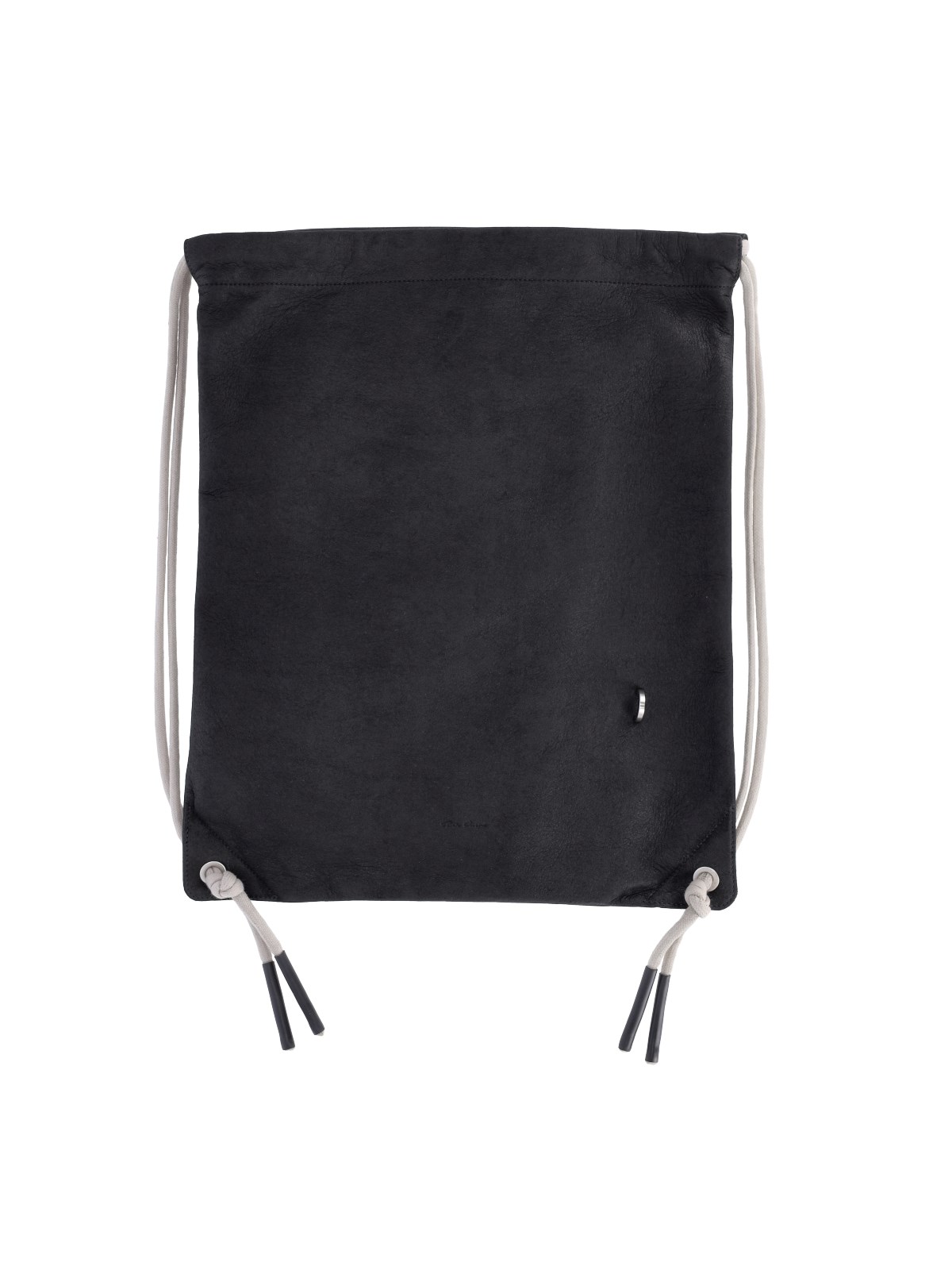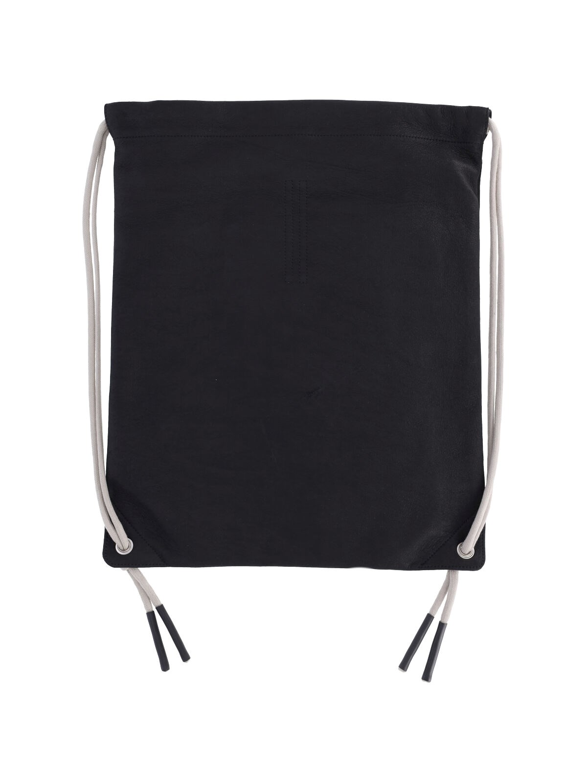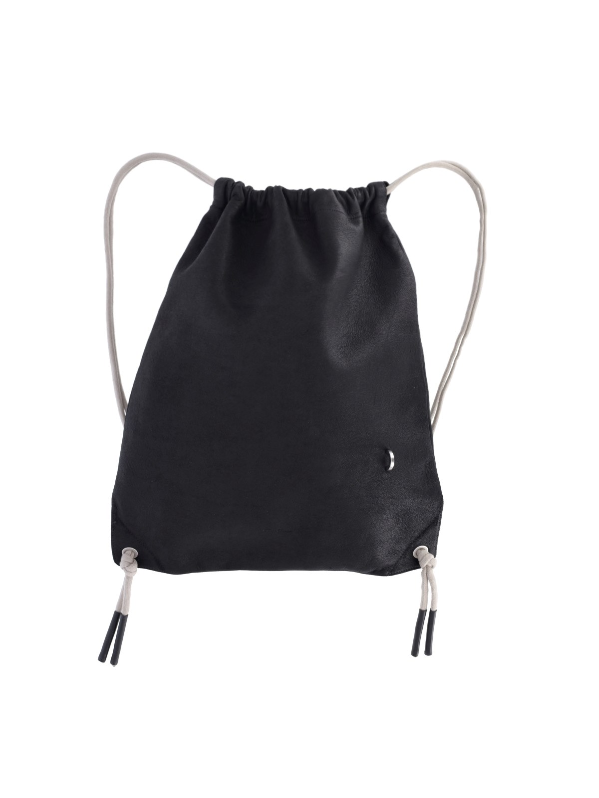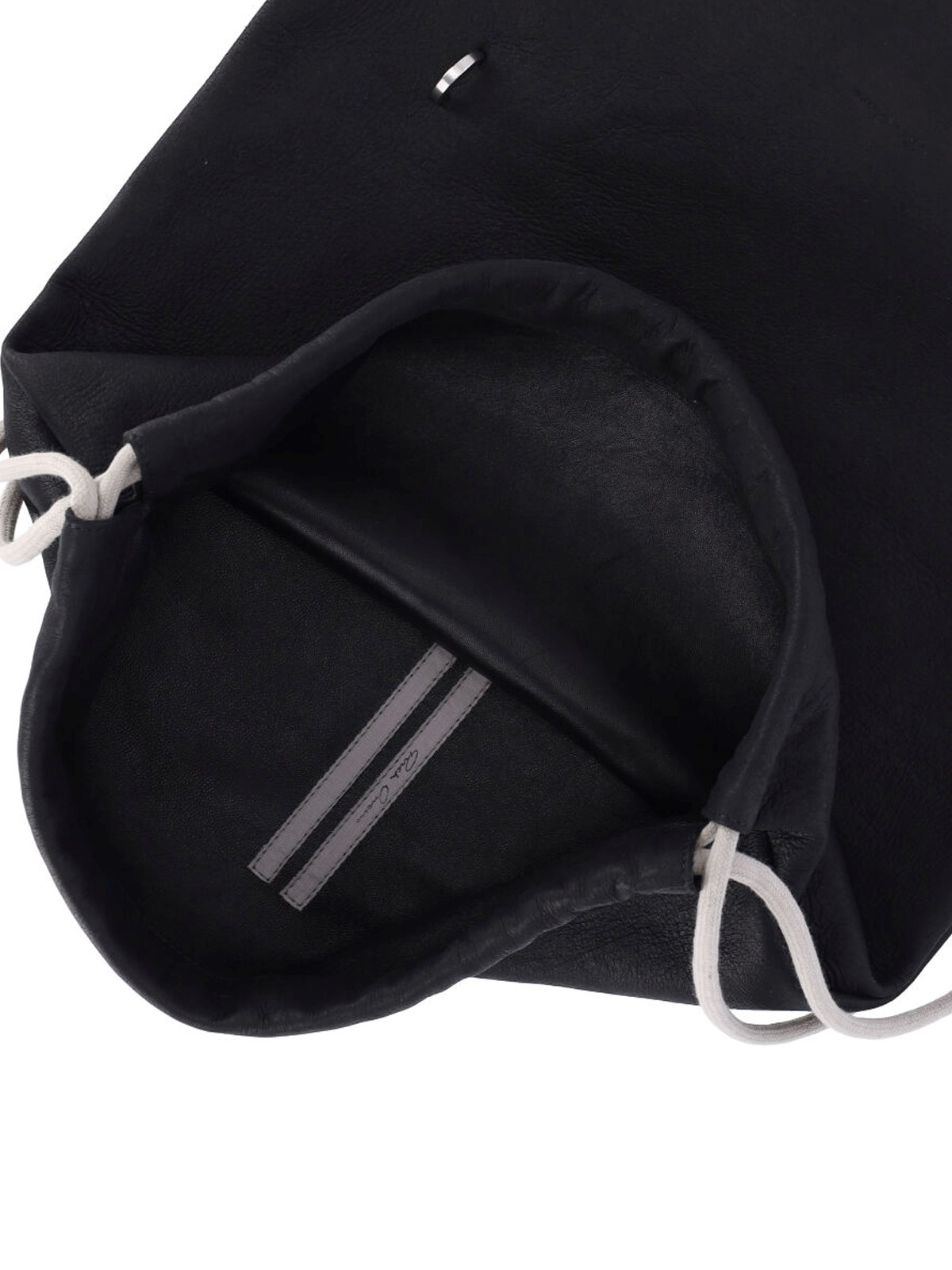 Rick Owens drawstring backpack in black lamb nappa leather, drawstring closure, rope shoulder straps on the back, silver metal detail on the front, single inner pocket.