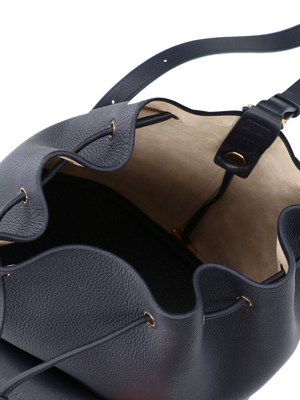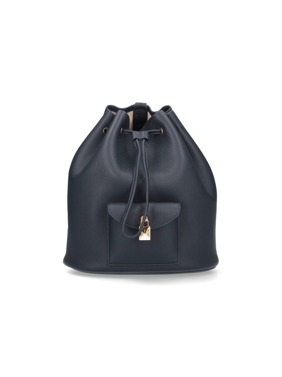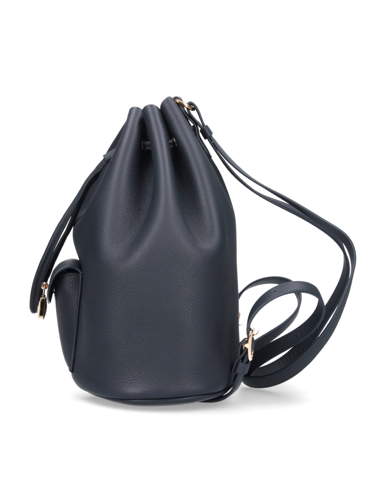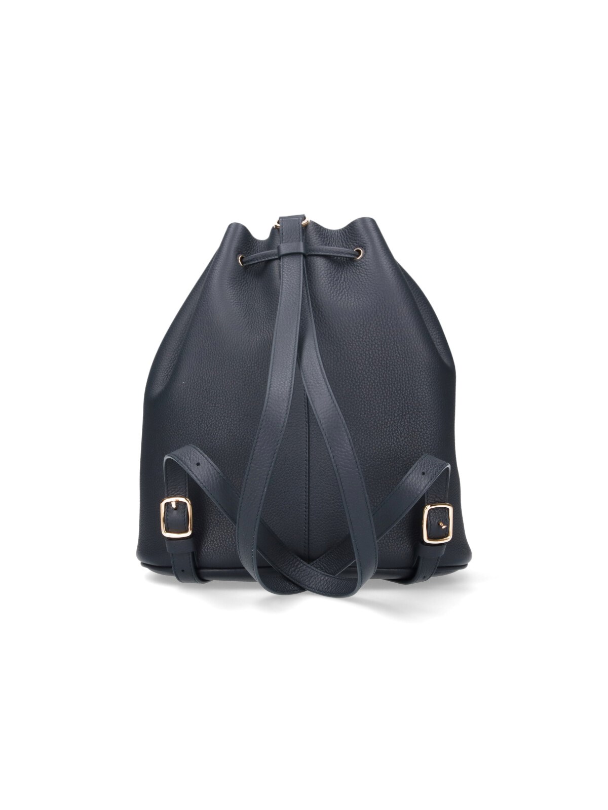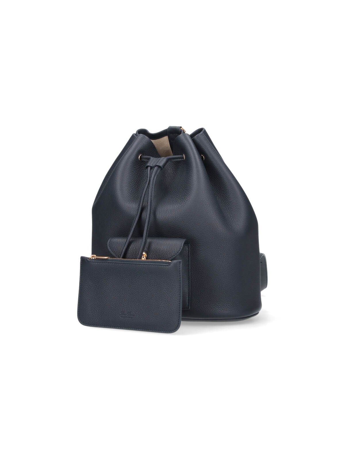 Loro Piana "Extra Drawstring" backpack, in black hammered calf leather, an adjustable shoulder strap, drawstring closure, a front pocket, gold metal detail, removable pouch, a main inner compartment.