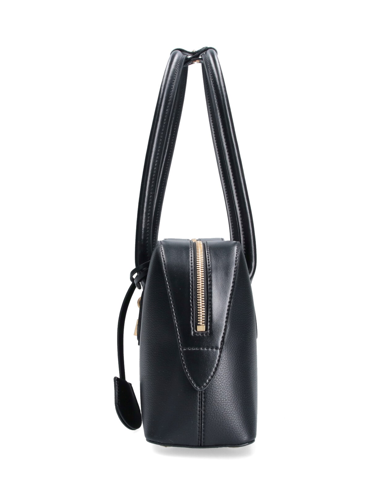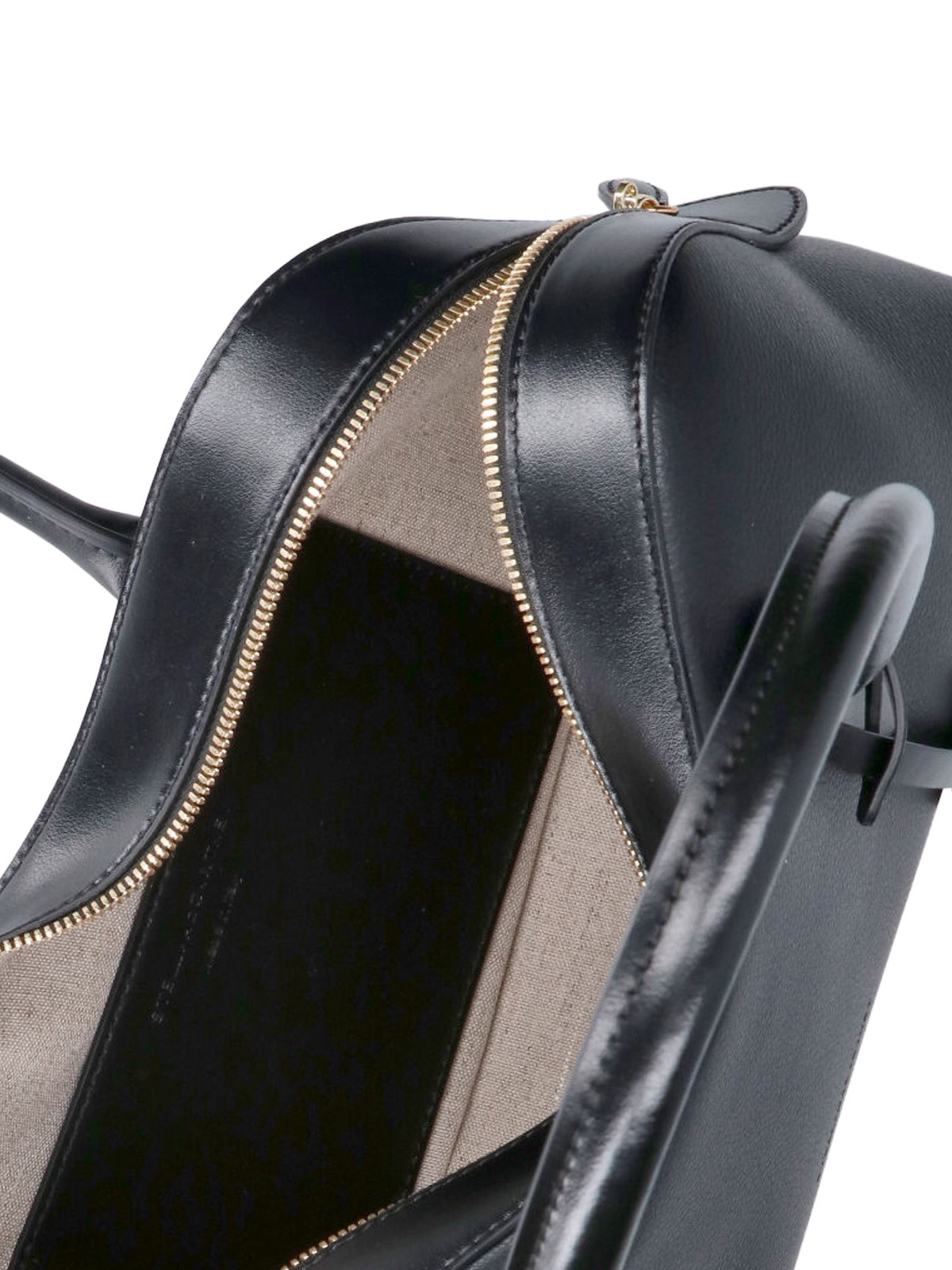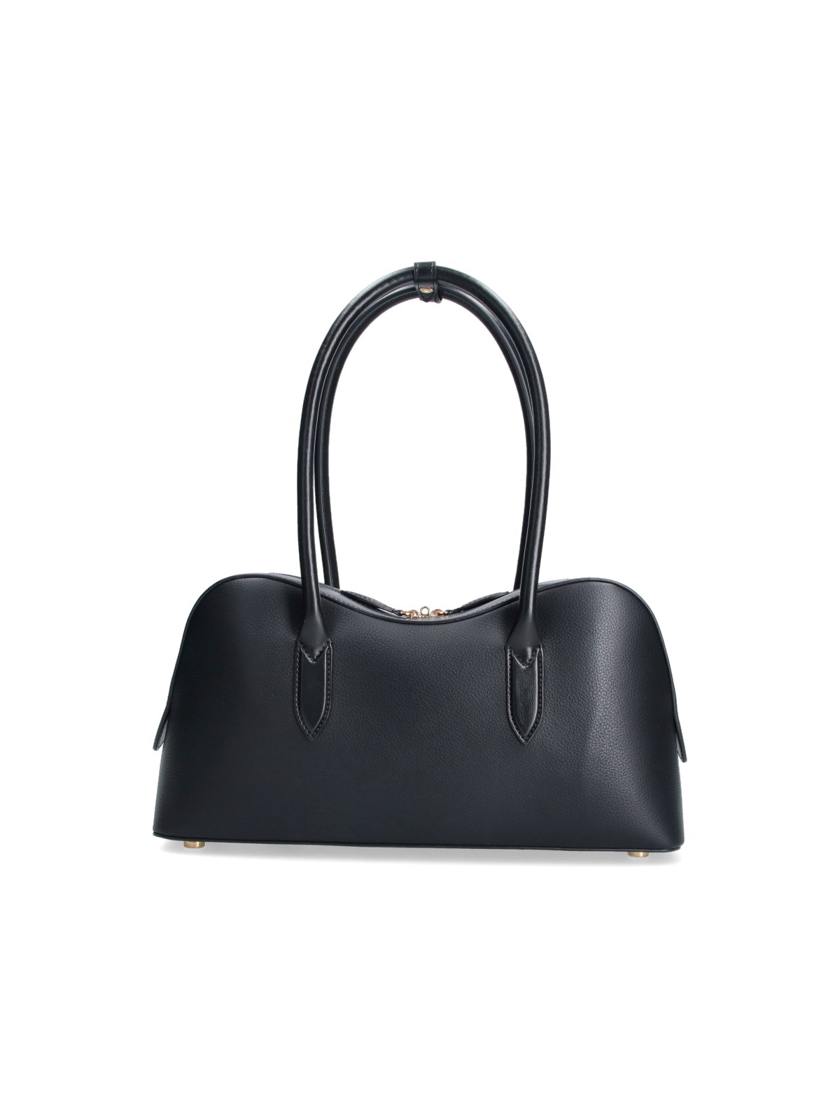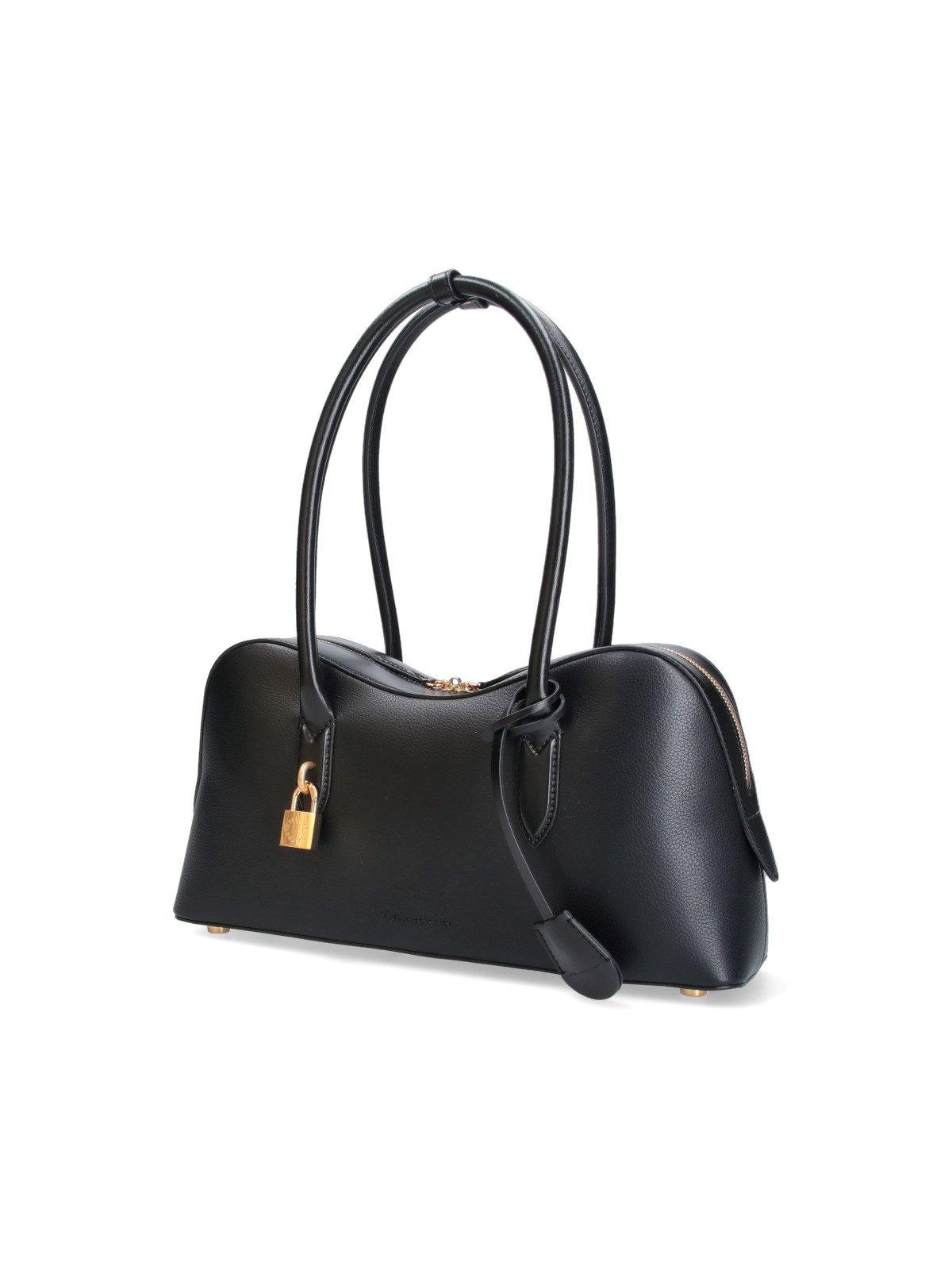 Shoulder Bag 'Stella Ryder' by Stella McCartney in black vegan leather, two top handles, double zip closure, gold metal lock on the front, one flat internal pocket, one main unique internal compartment.