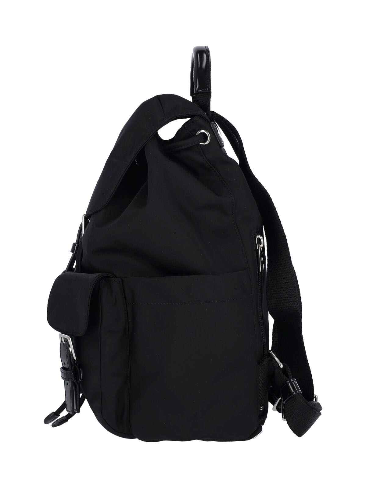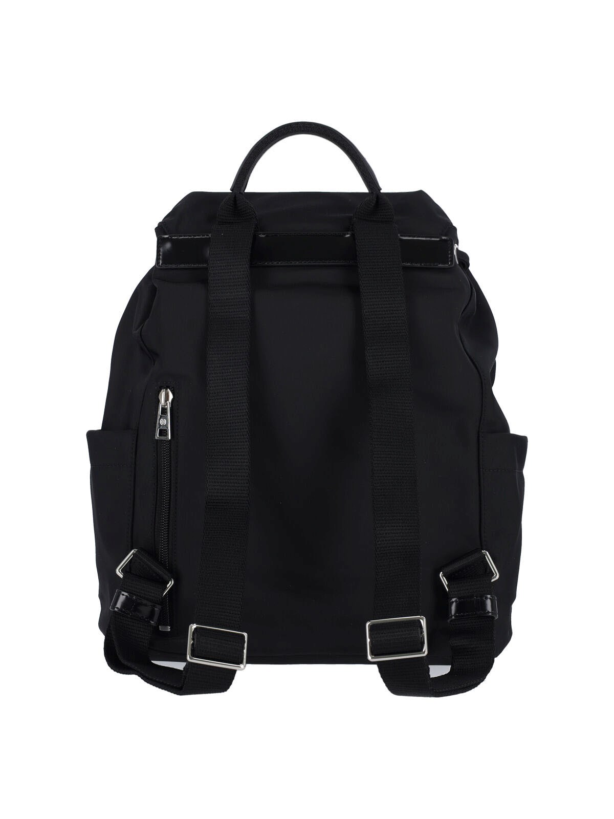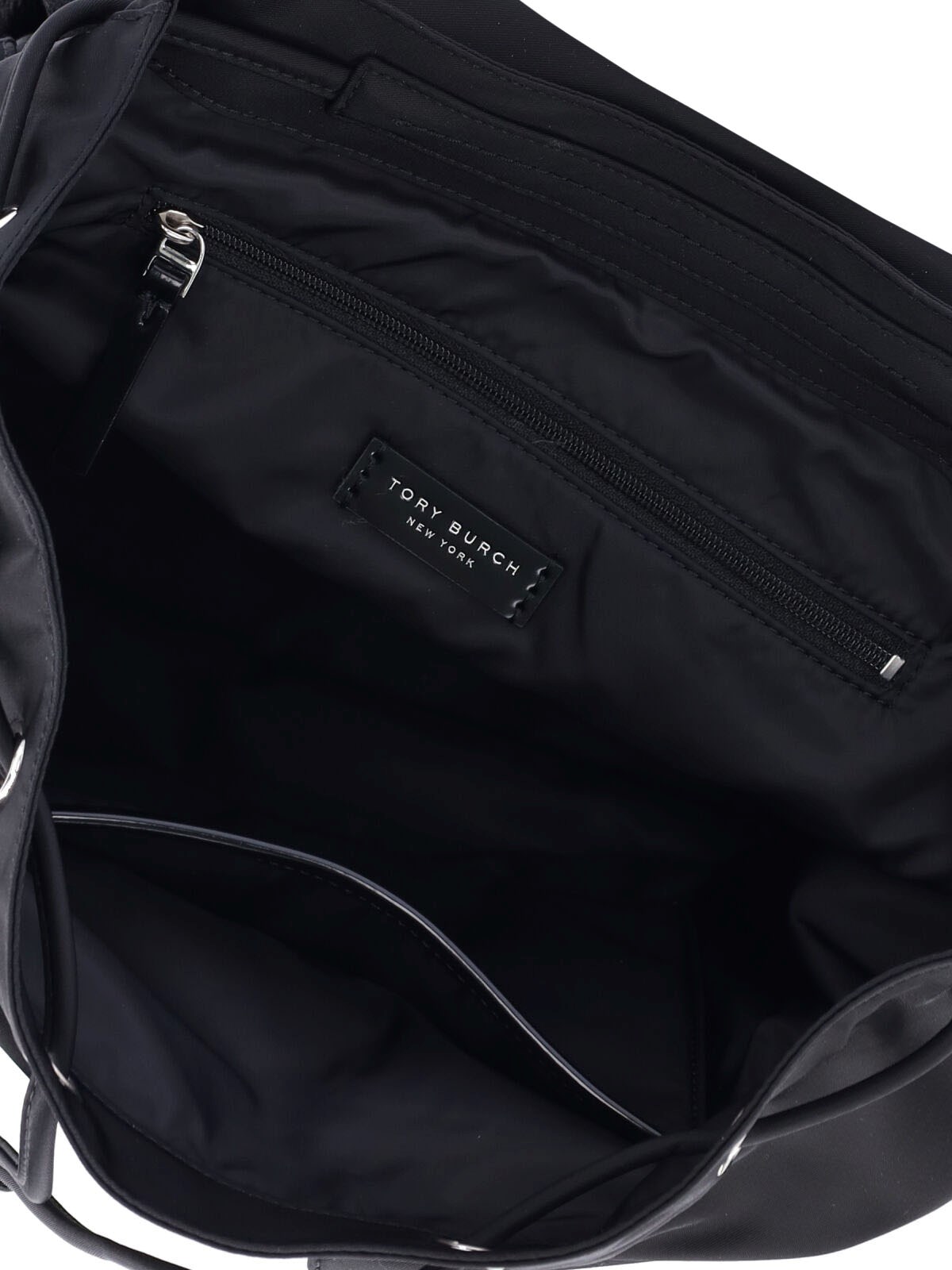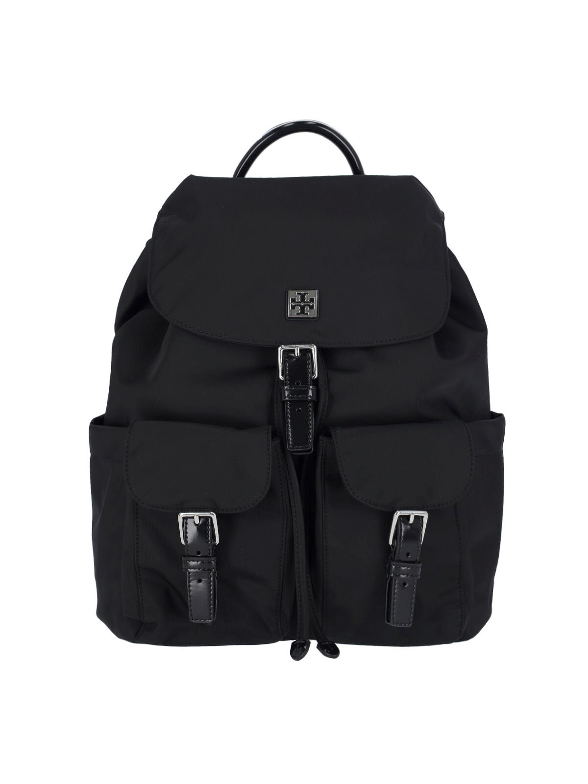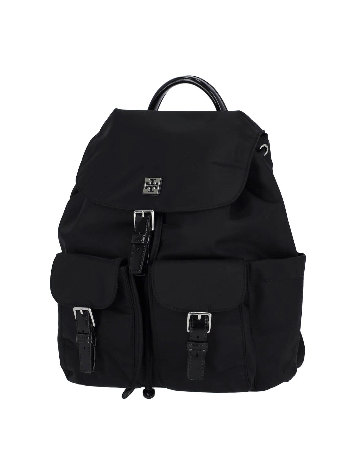 Tory Burch 'Virginia' backpack in black fabric with handle, two adjustable shoulder straps, strap closure, two front pockets, two side flat pockets, main inner compartment, inner zip flat pocket, back zip pocket.