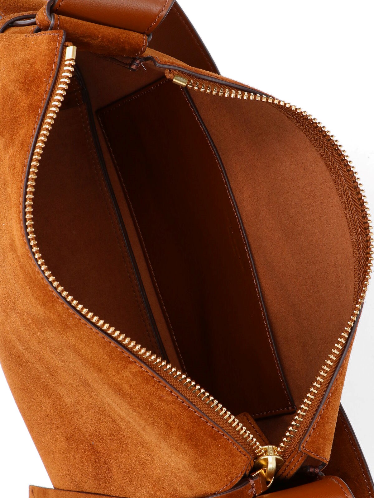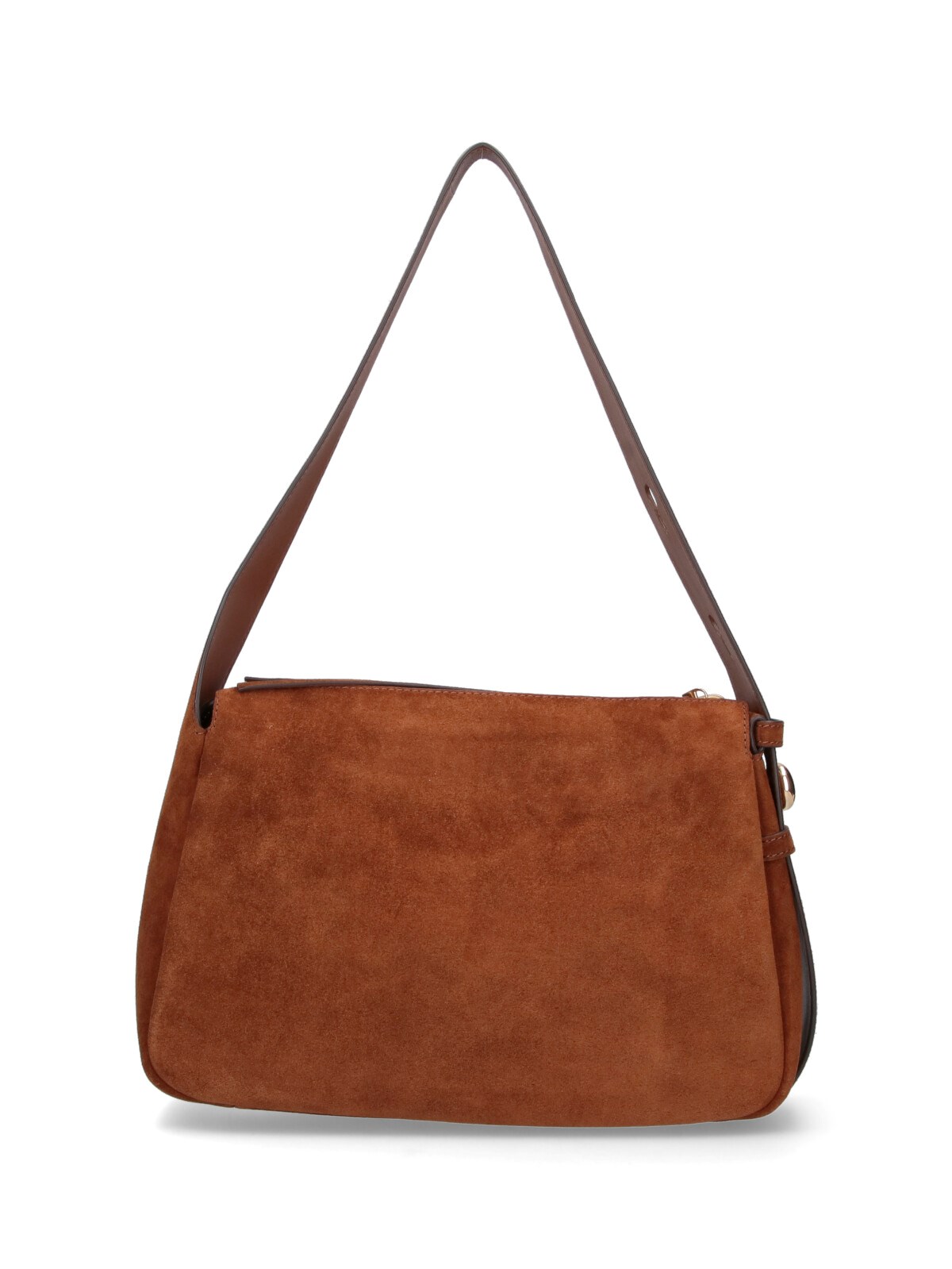 Shoulder bag 'Romy' by Tory Burch, made of brown calf suede, adjustable top handle, zip closure, zip pull, gold metal logo detail on handle, one internal flat pocket, one main internal compartment.