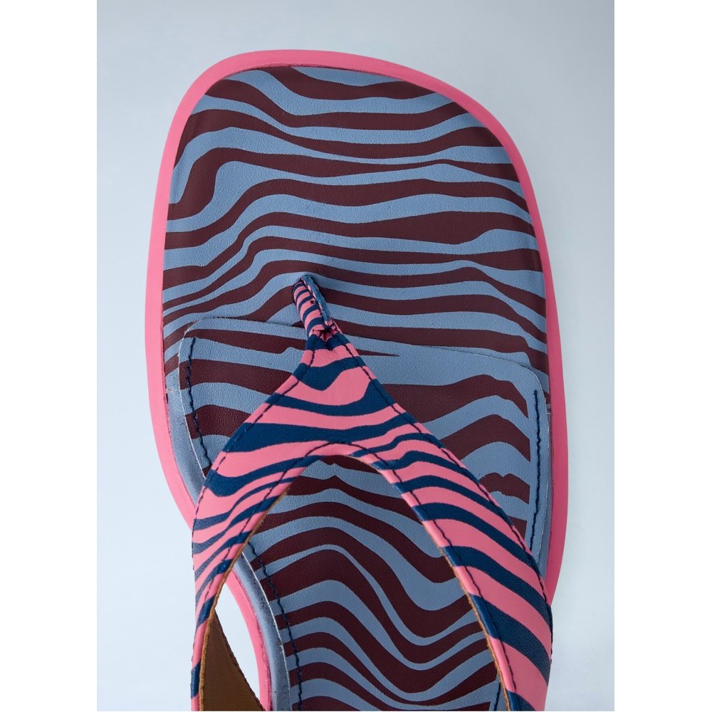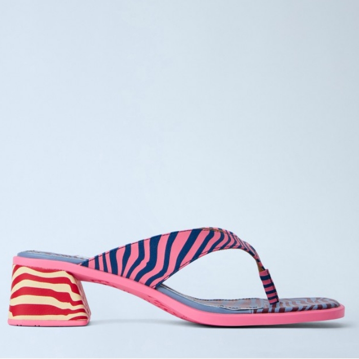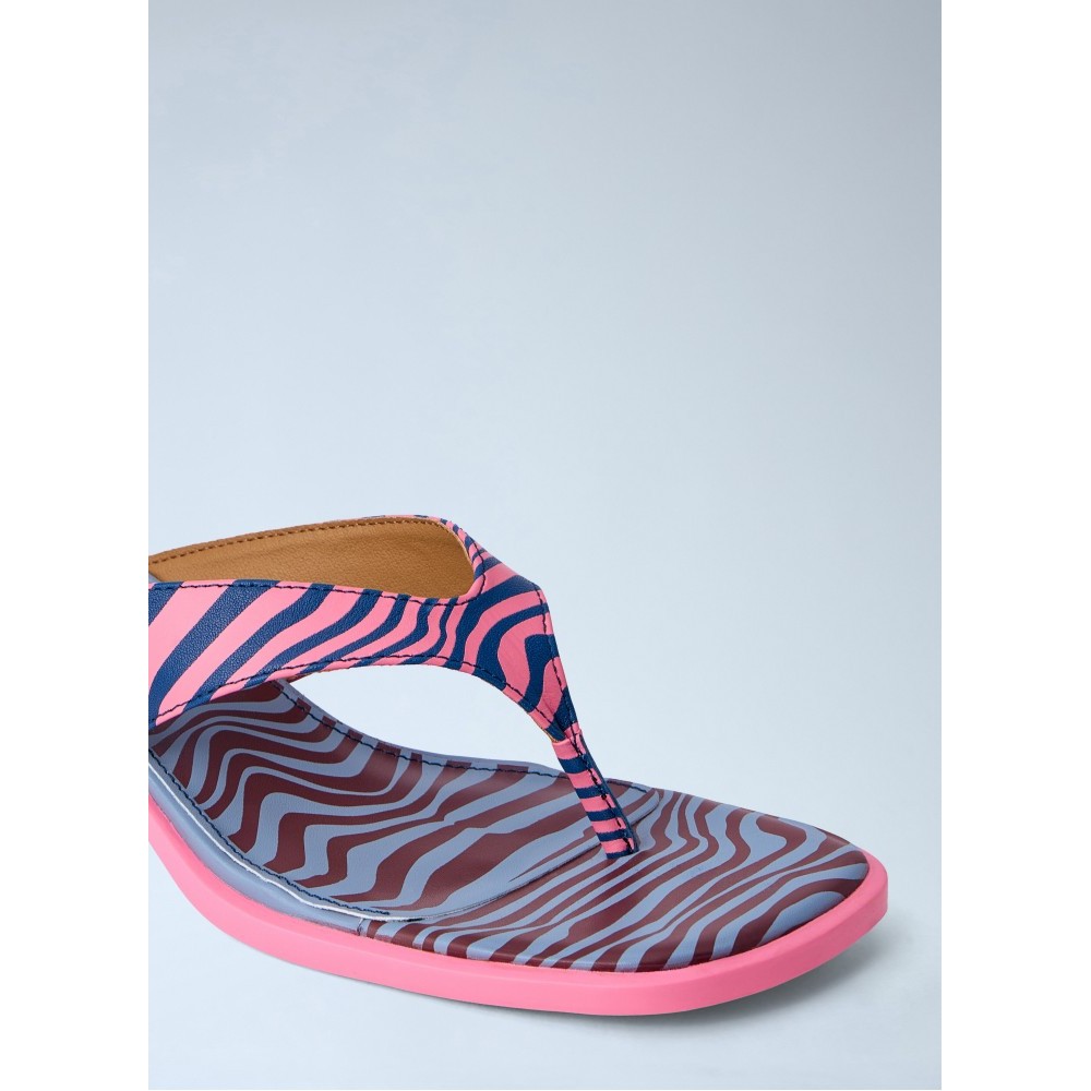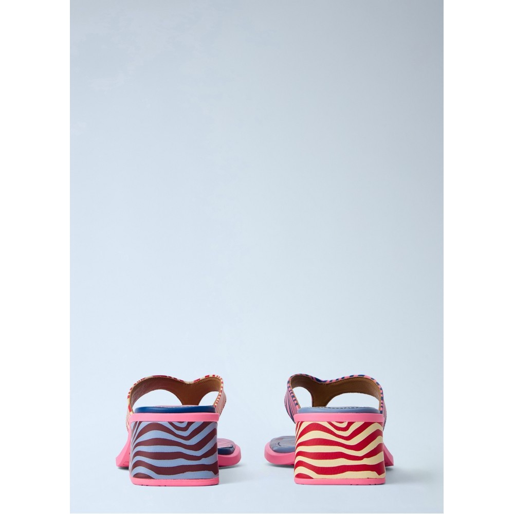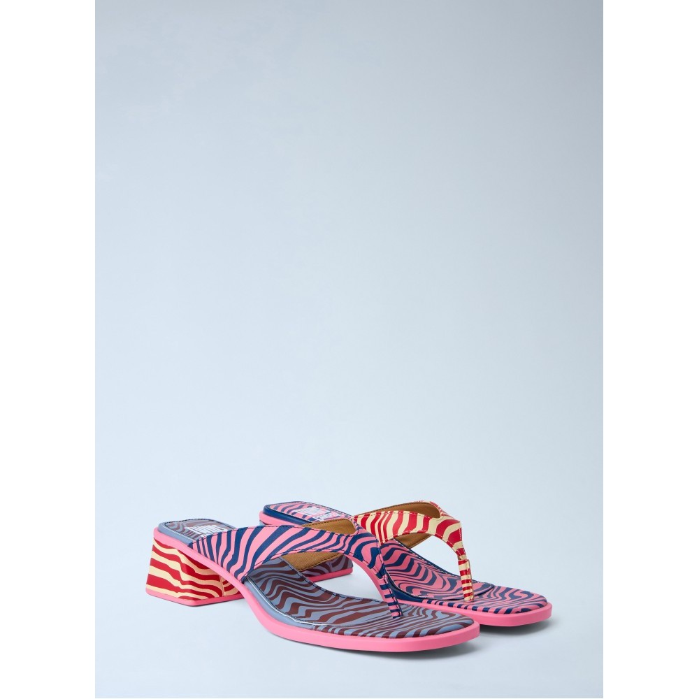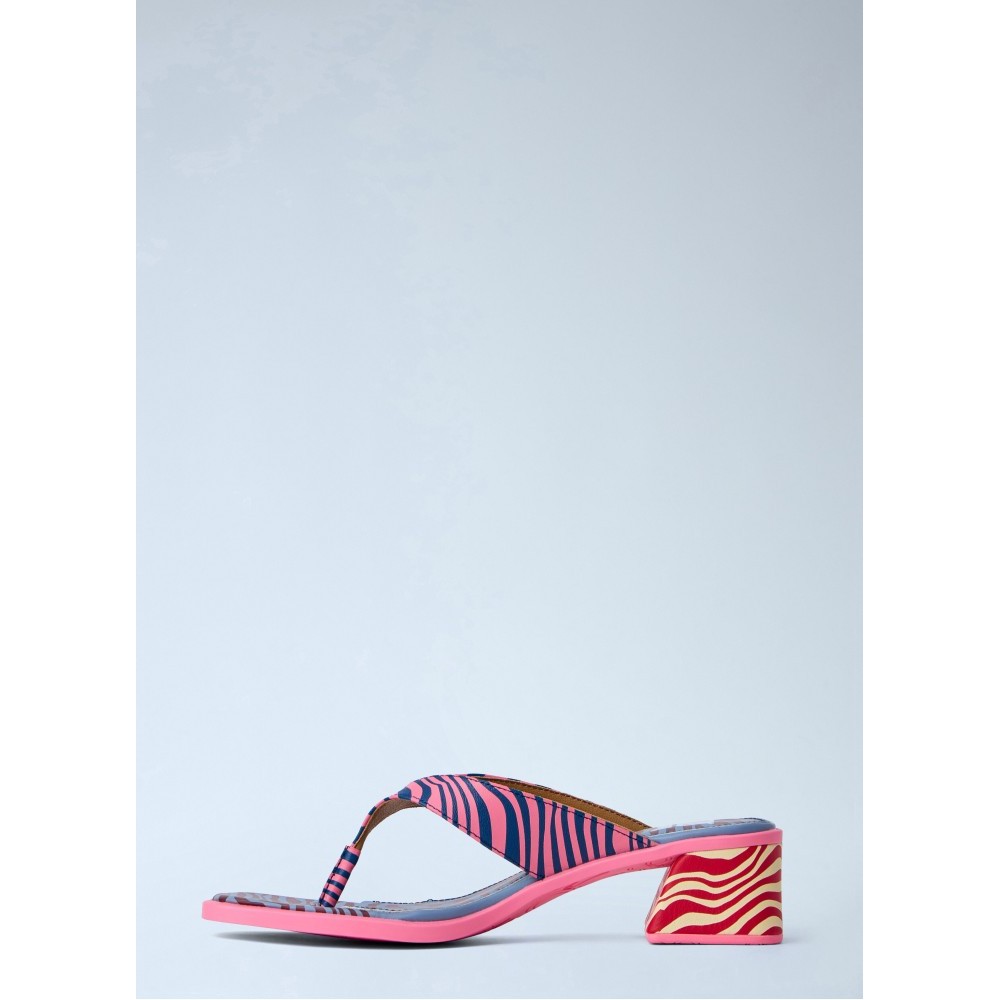 Open-toe sandals with block heel and patterned straps.