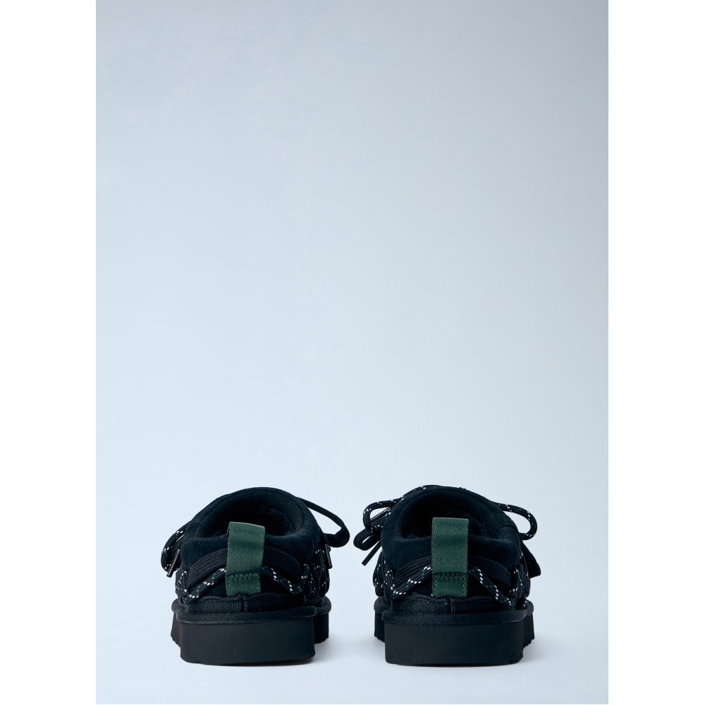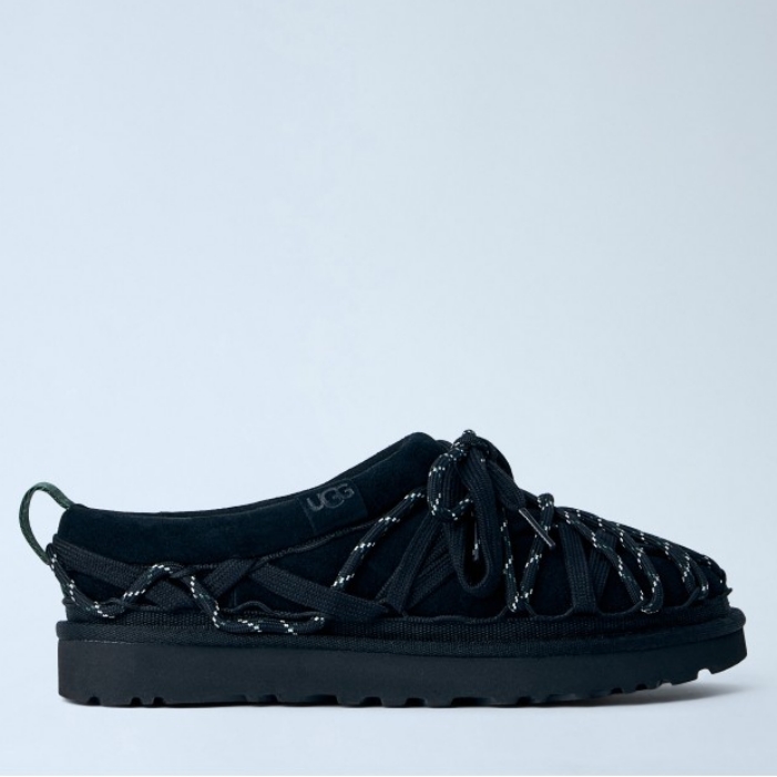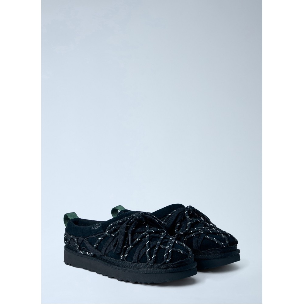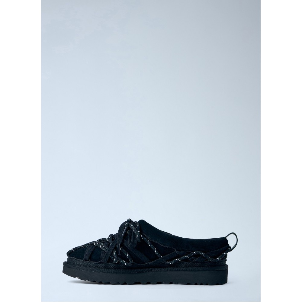 Mesh lace-up slippers with rubber sole and woven straps.