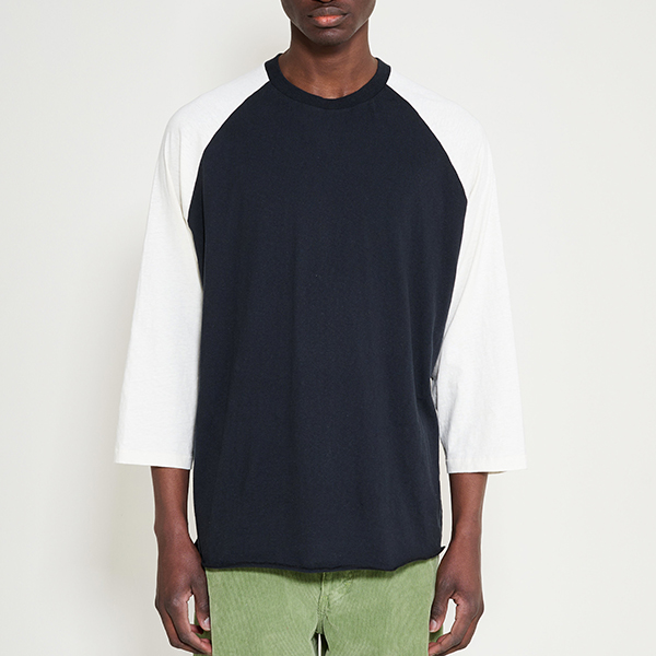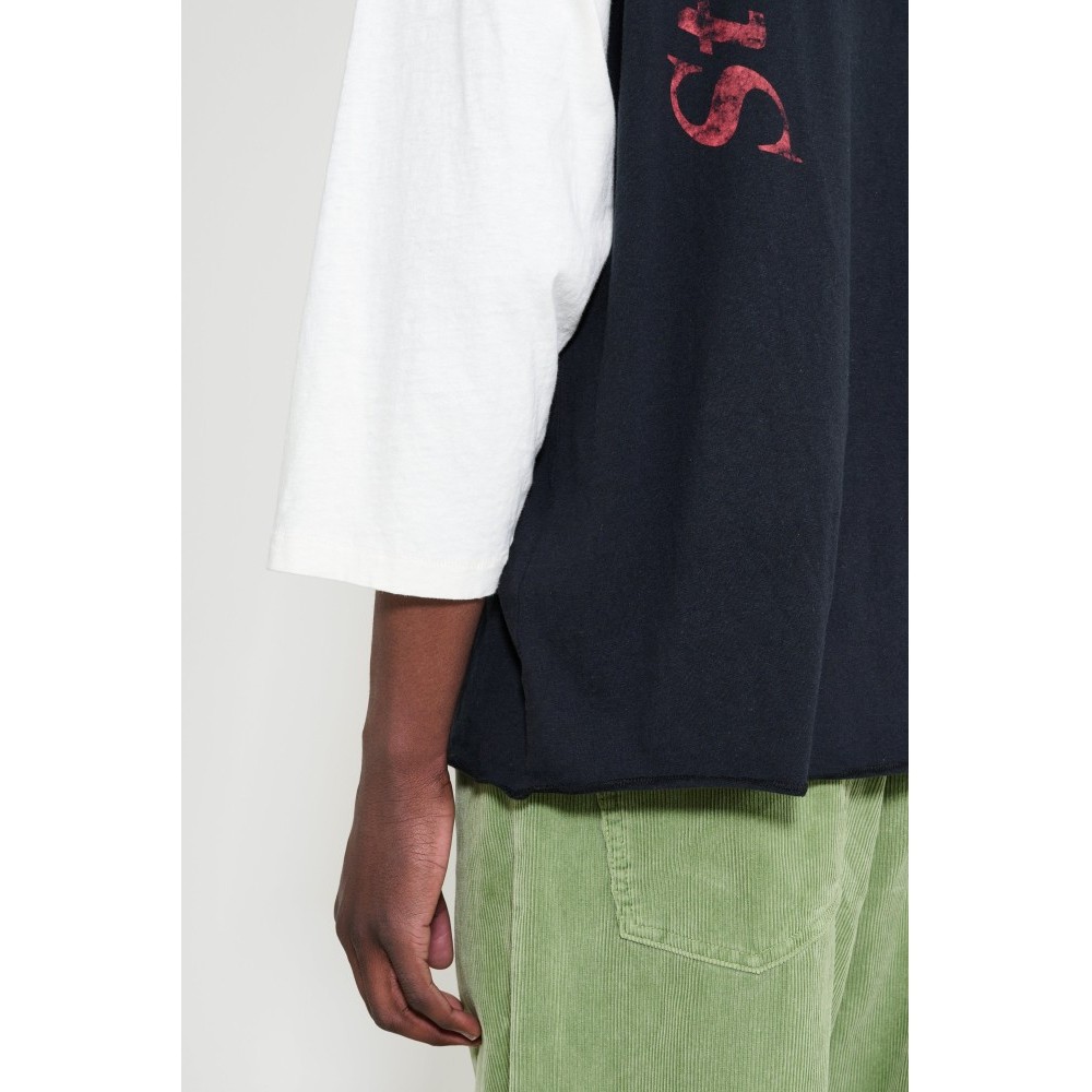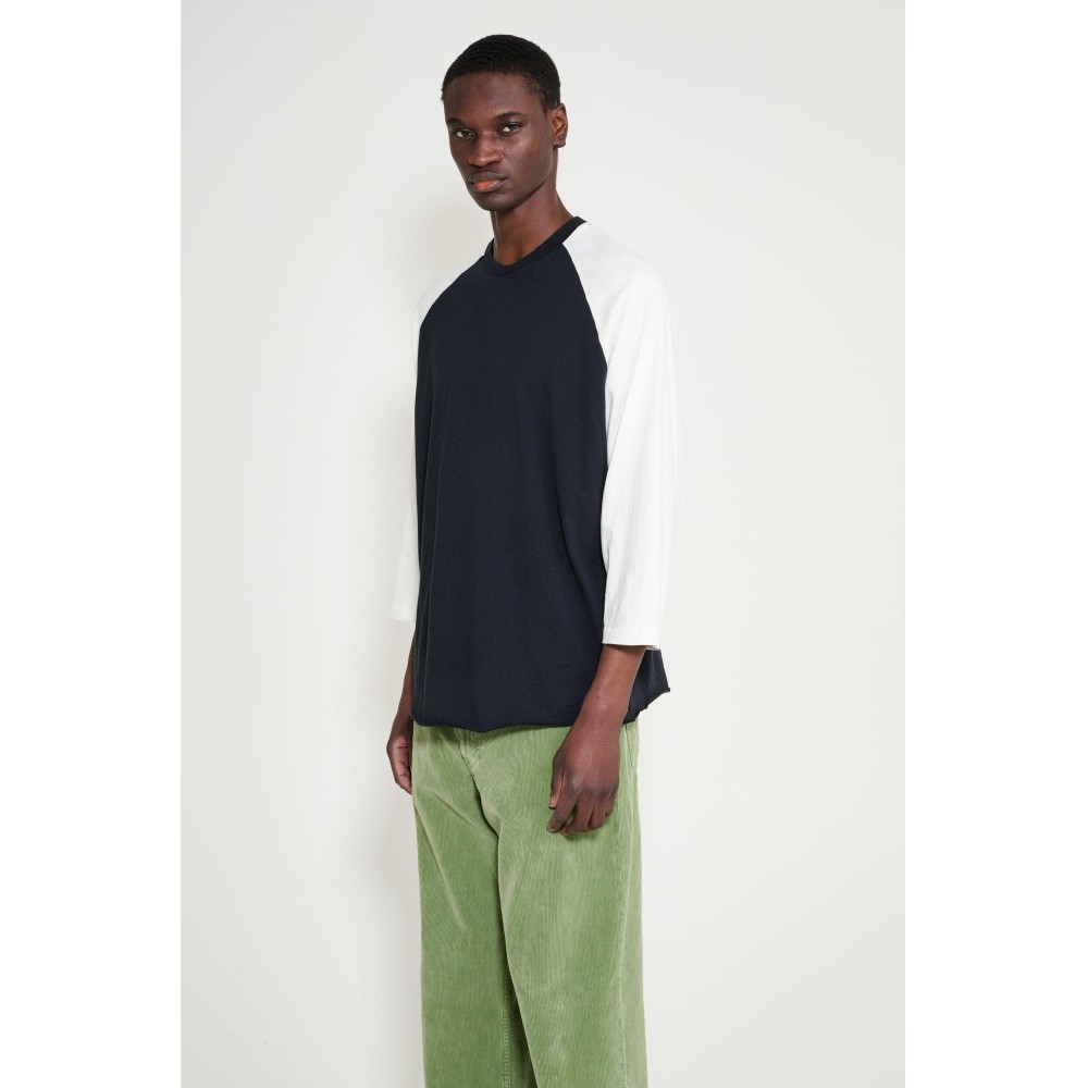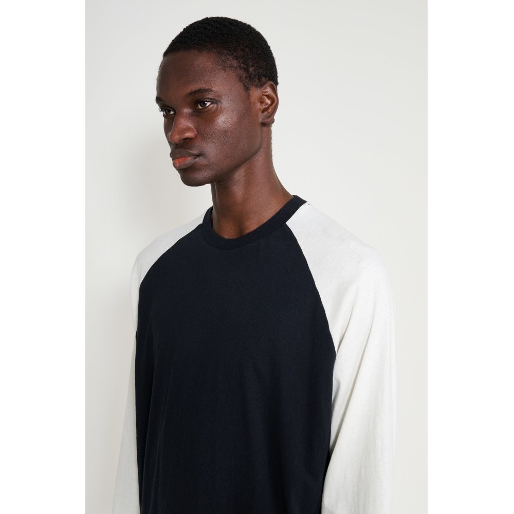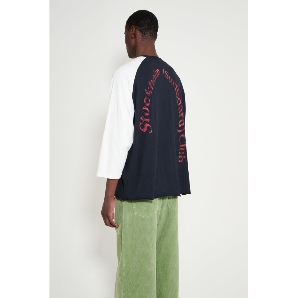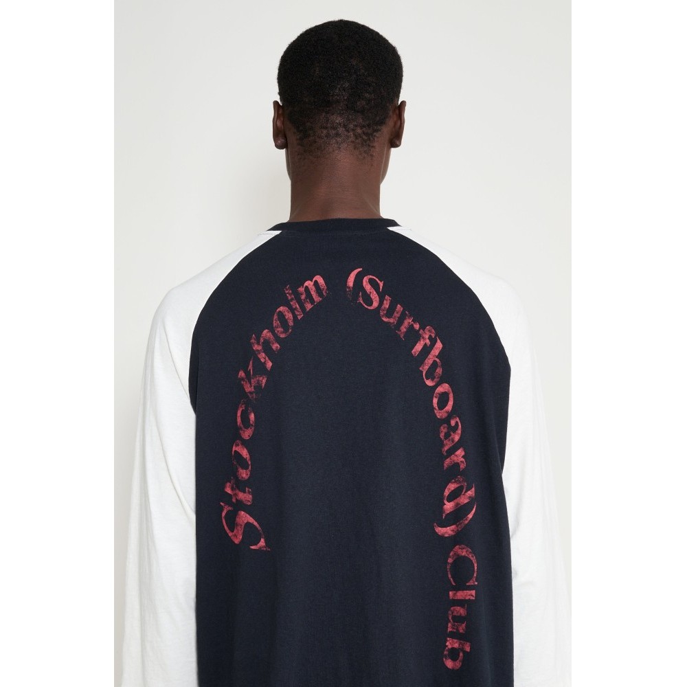 Raglan top from Stockholm Surfboard Club. Constructed from organic cotton jersey with a vintage wash and waist-length cut. The round neck and three-quarter sleeves appear in contrasting white against a black body. A logo print spans the upper back, while seams remain tonal.