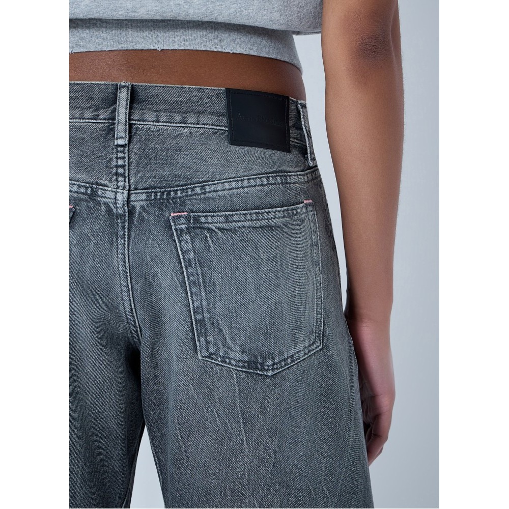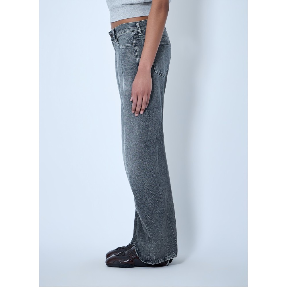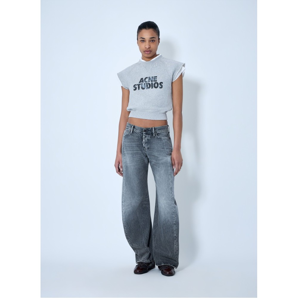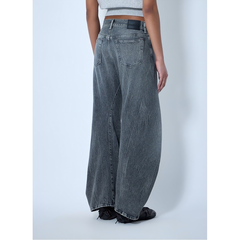 Wide-leg denim trousers in distressed finish.