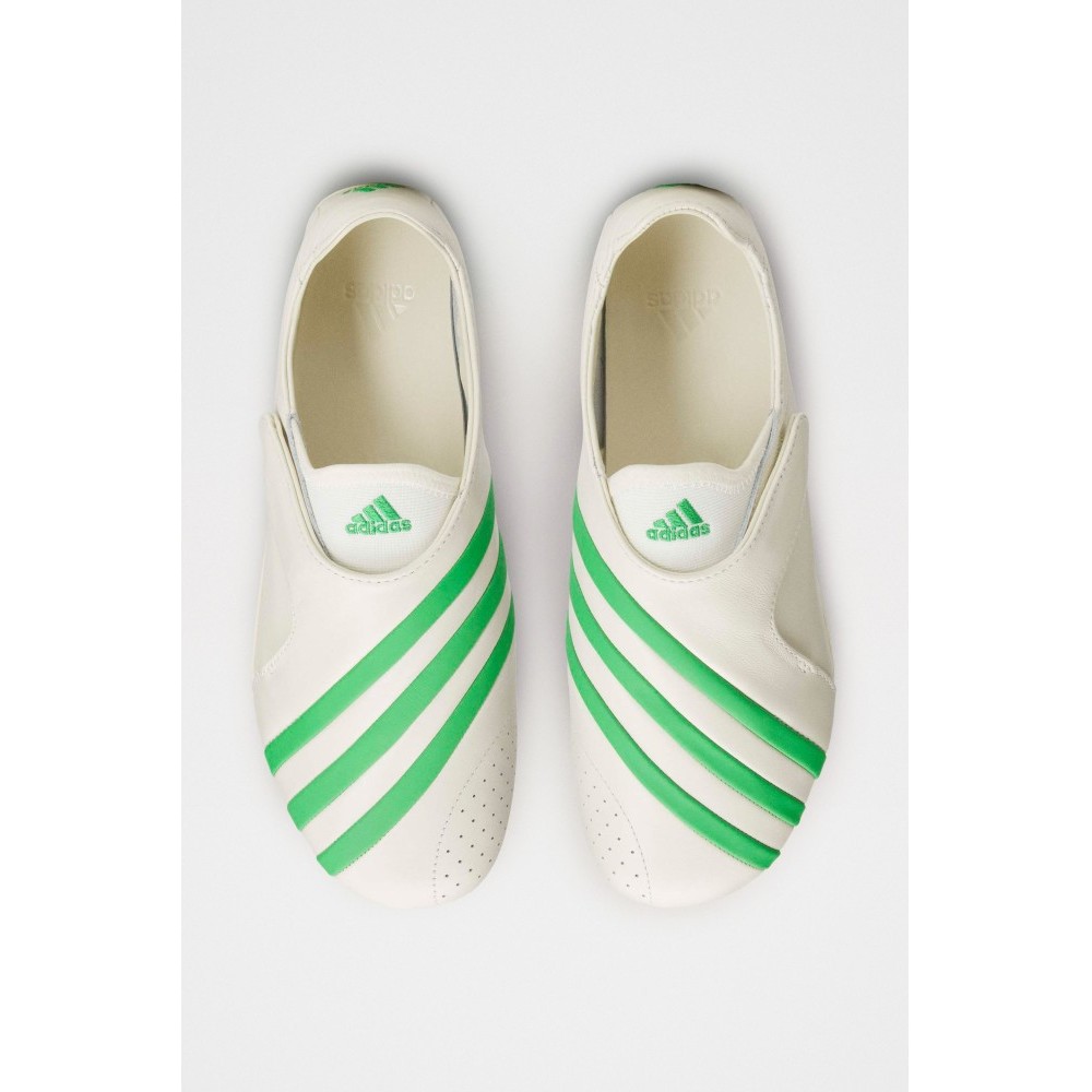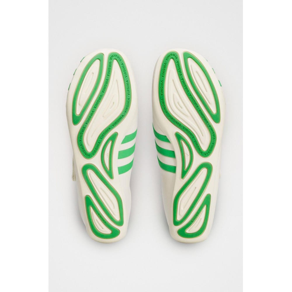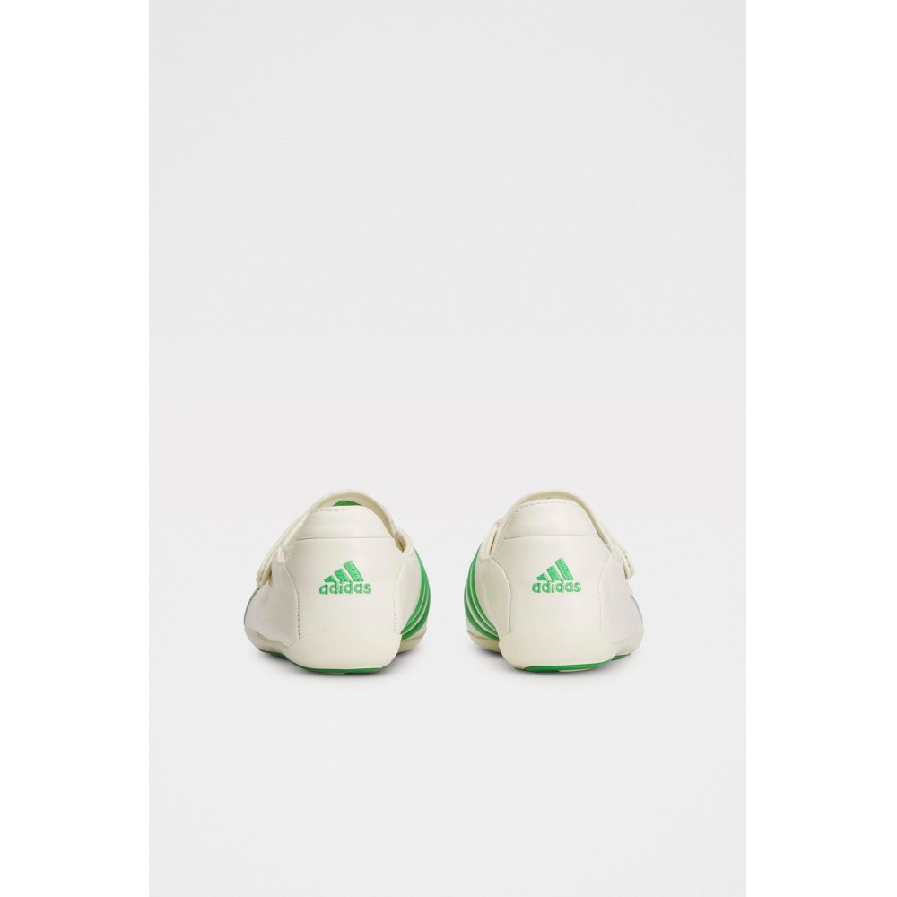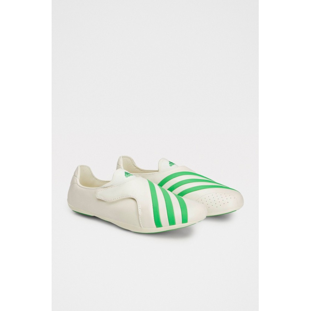 Laceless sneakers from adidas Originals x Pharrell. Full grain leather upper in off-white with green Three Stripes wrapping across the toe. Low-profile collar with a strap closure over the instep. Leather lining with EVA insole for underfoot comfort. Direct-injected rubber outsole with a streamlined profile.