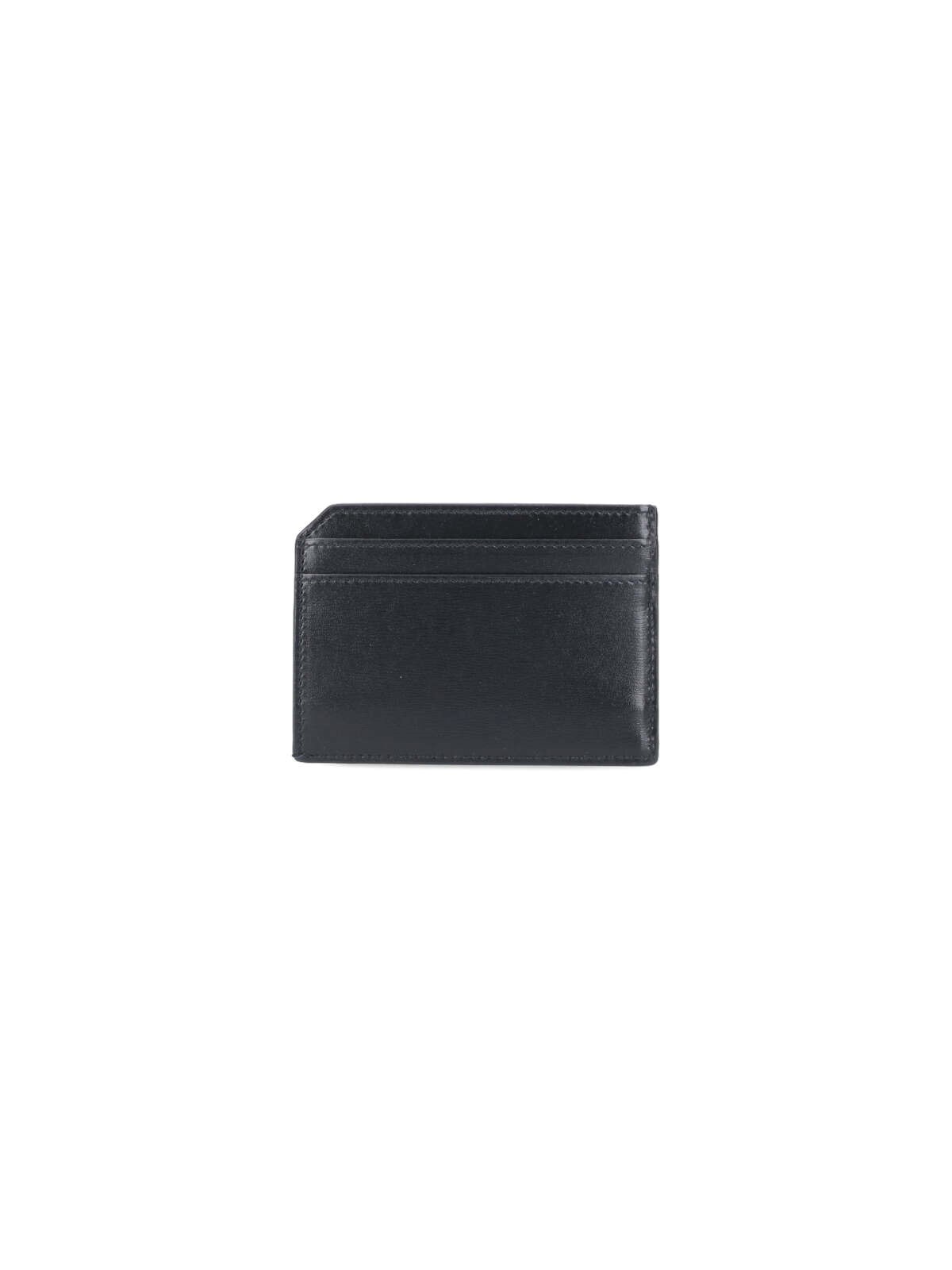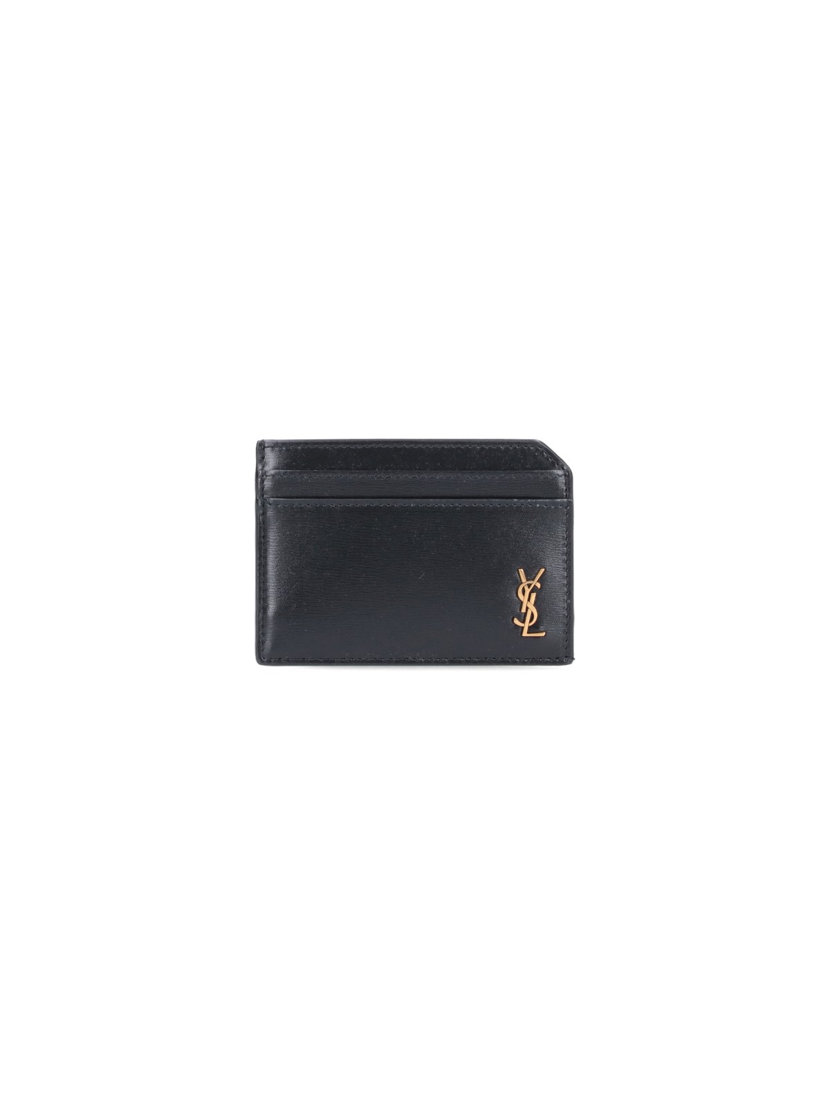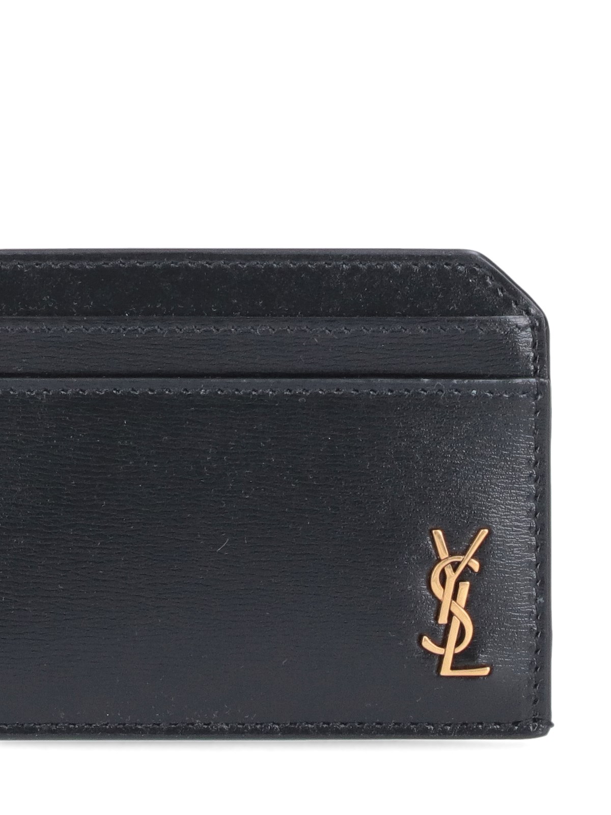 Saint Laurent Tiny Cassandre card holder in black leather, gold metal logo patch detail, and seven card slots.