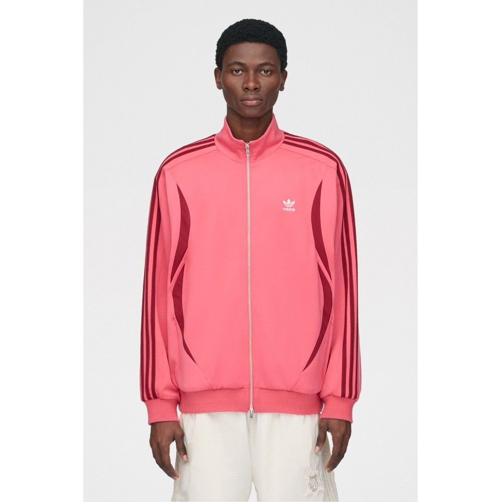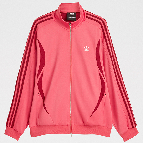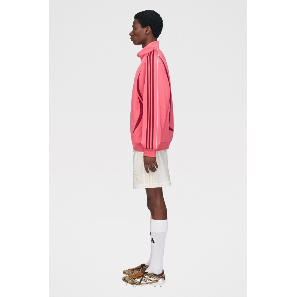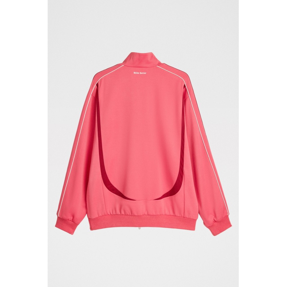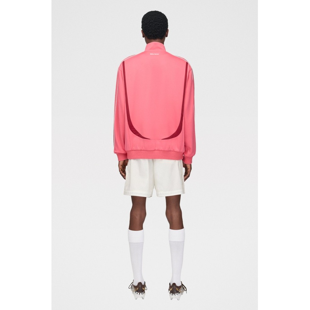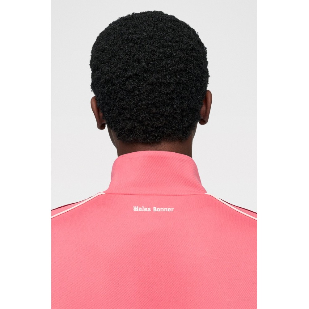 Track top from adidas by Wales Bonner. Fine-knit acrylic body in craft pink with a contrast band running across the chest. Tall funnel neck with a two-way zip extending to the hem. Ribbed cuffs and waistband shaping the silhouette. Front welt pockets and small embroidered branding at chest and back neck.