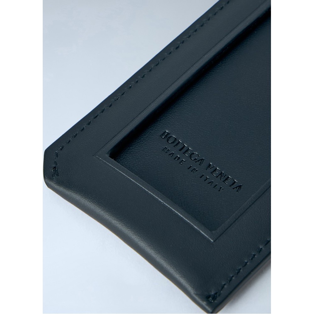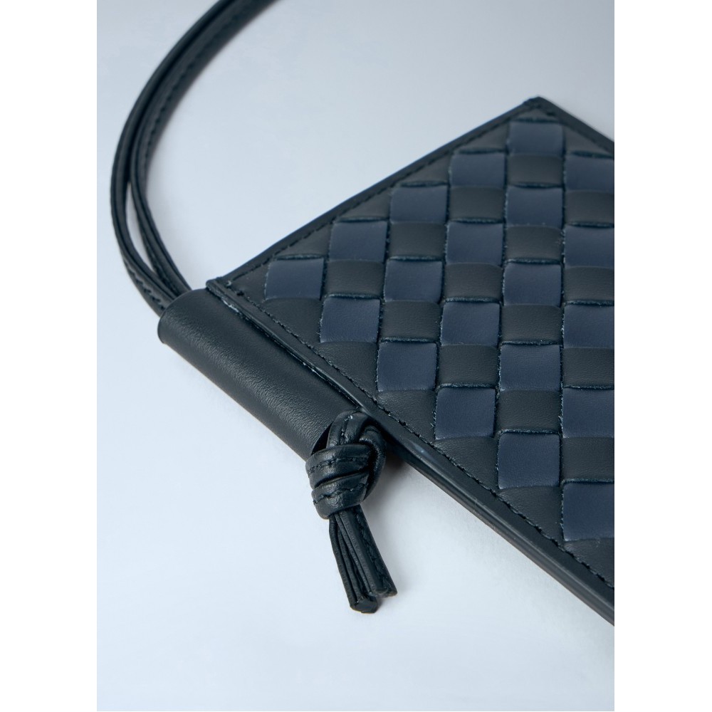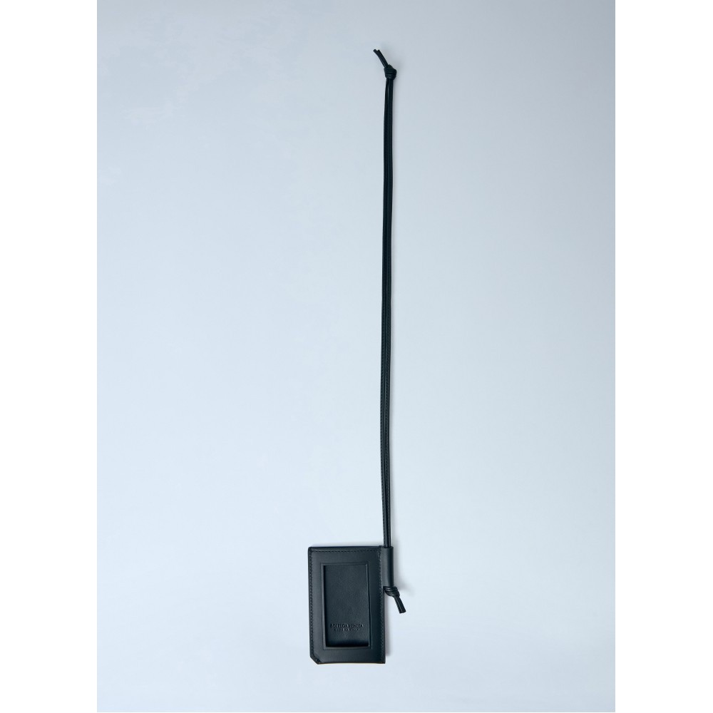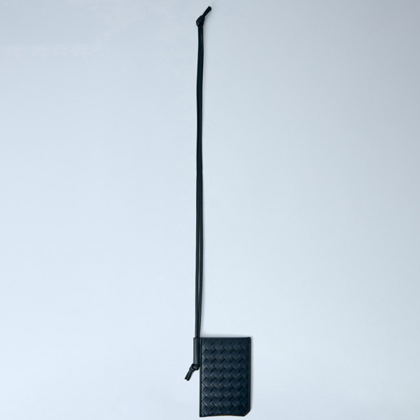Cardholder in woven leather with adjustable neck strap.