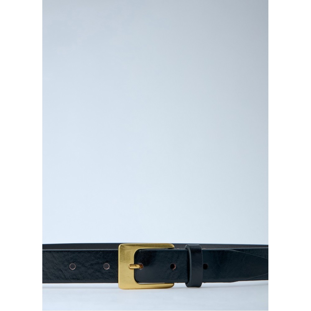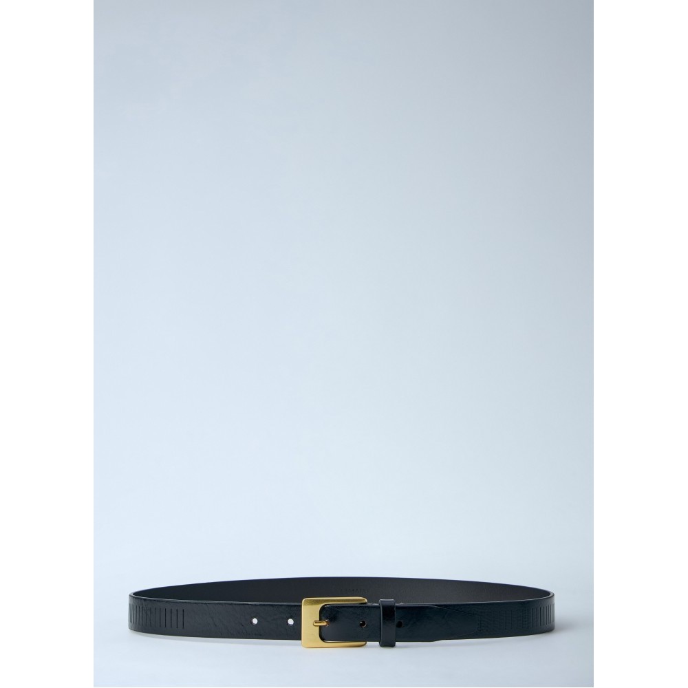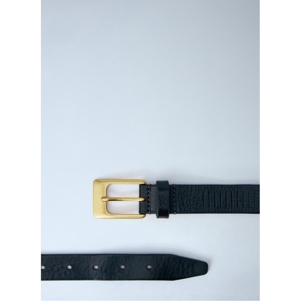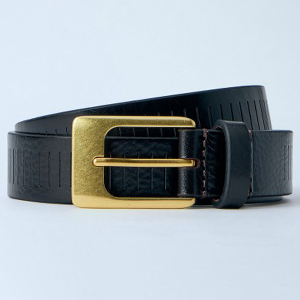Embossed leather belt with polished brass buckle fastening.