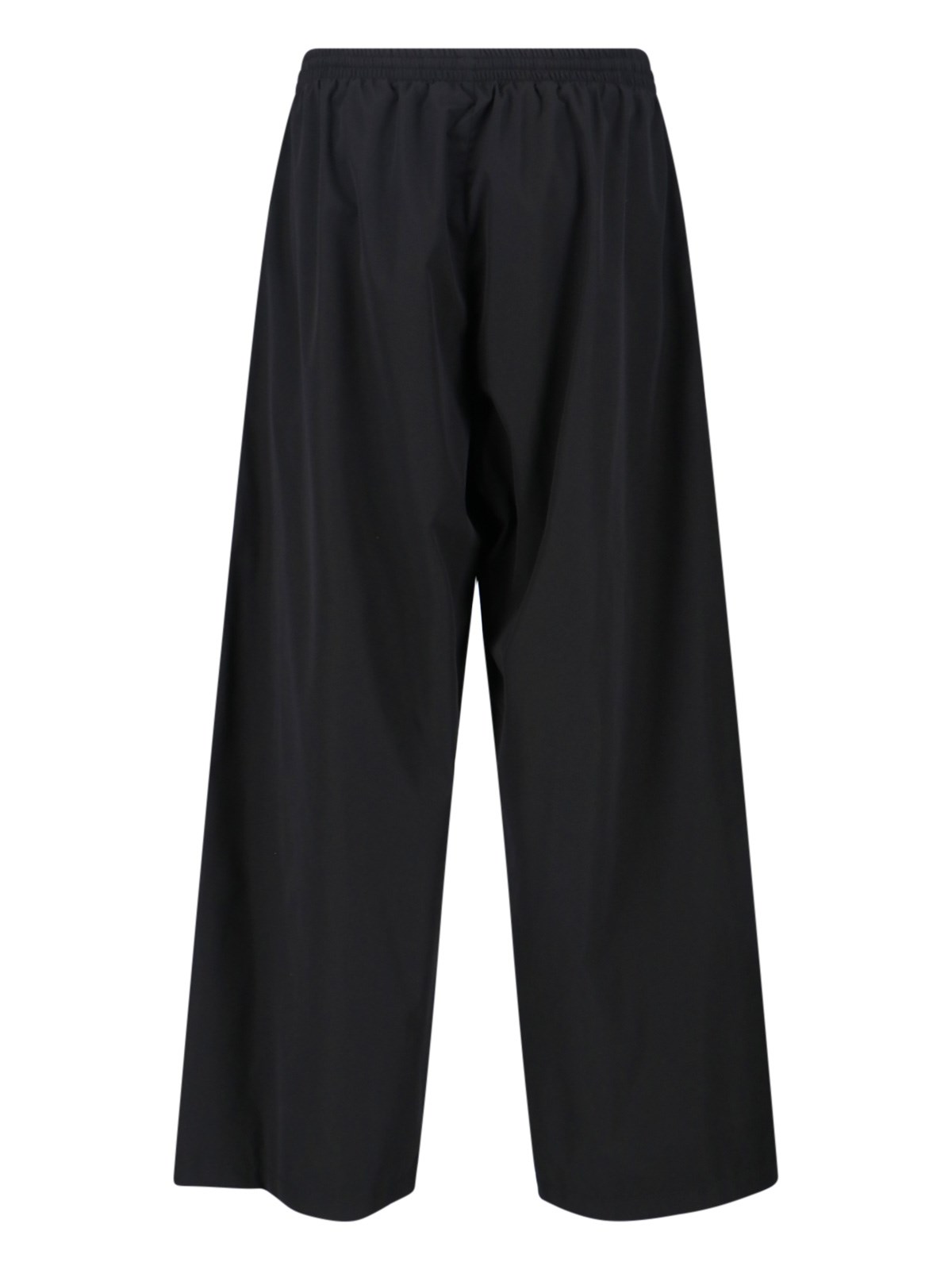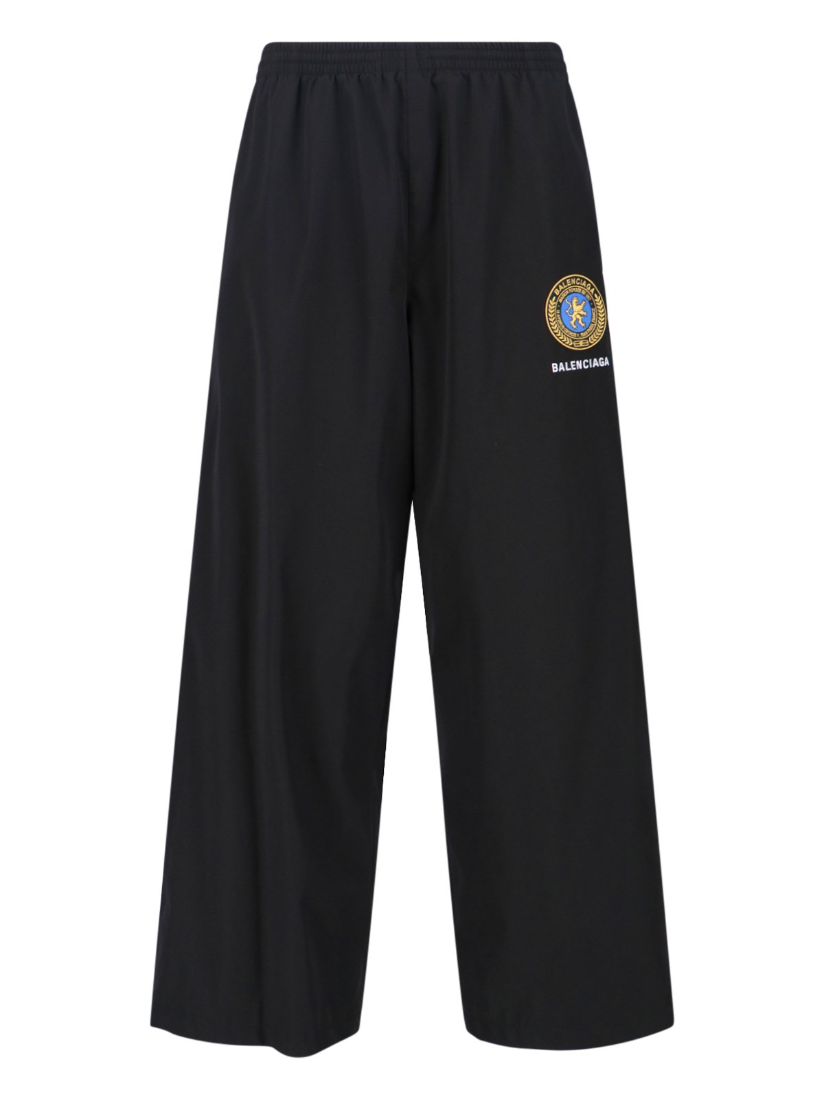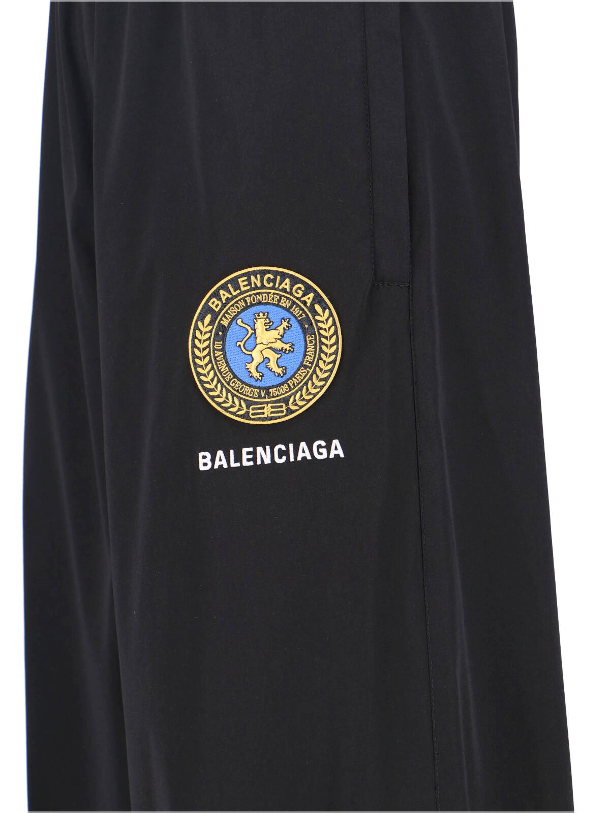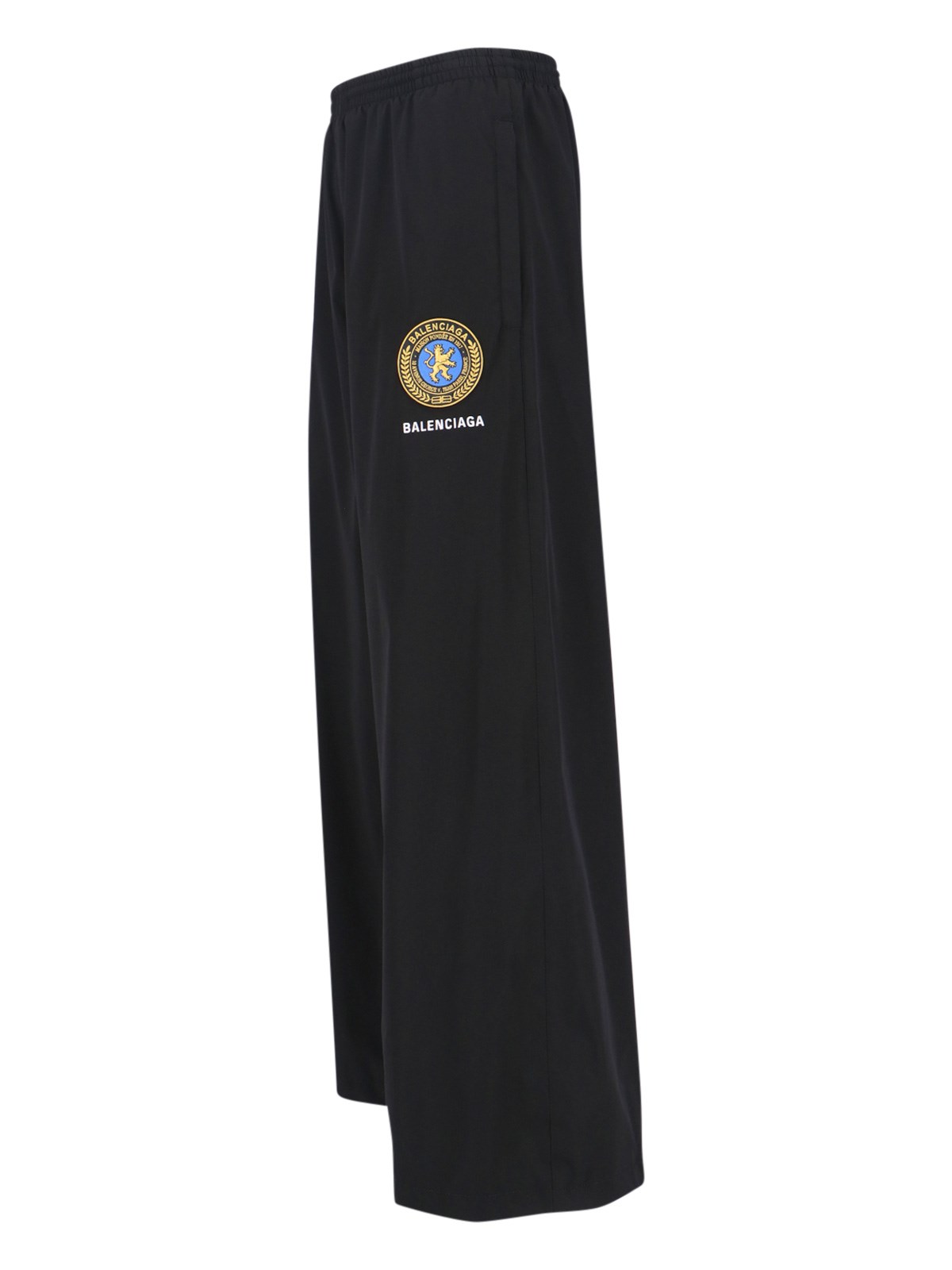 Balenciaga logo sports pants in black fabric with medium elastic waistband, two side pockets, contrasting logo print on the side, straight leg.