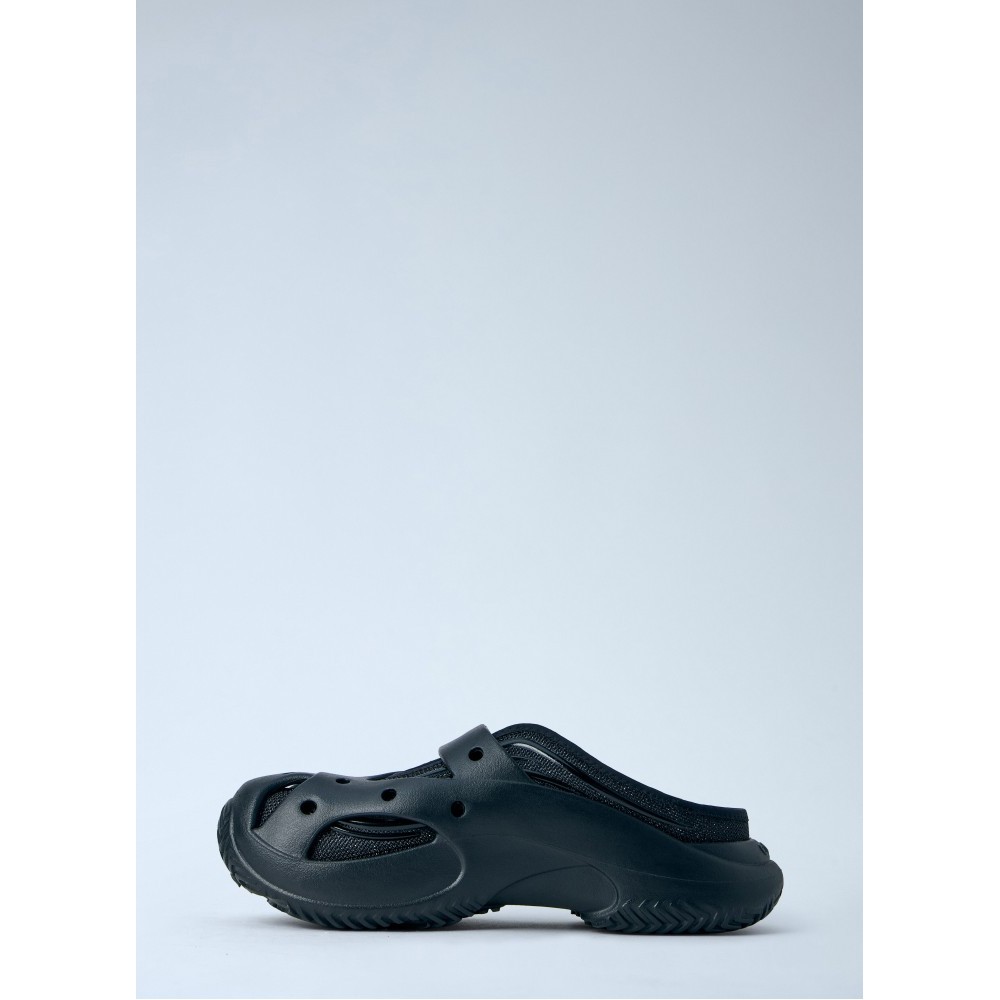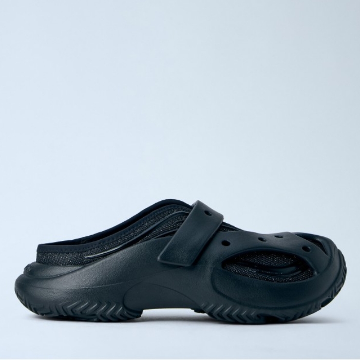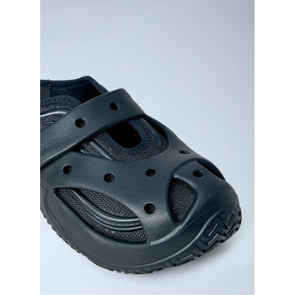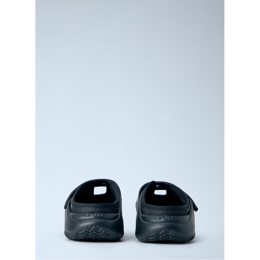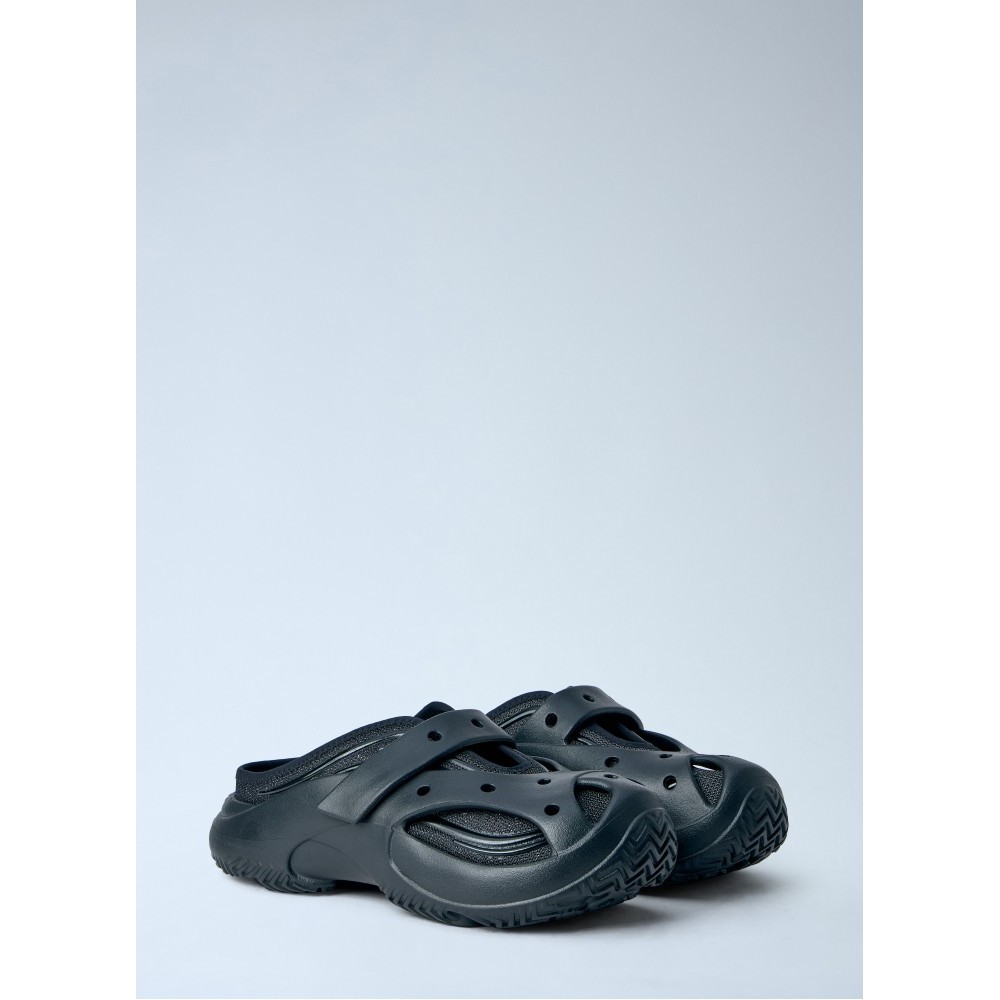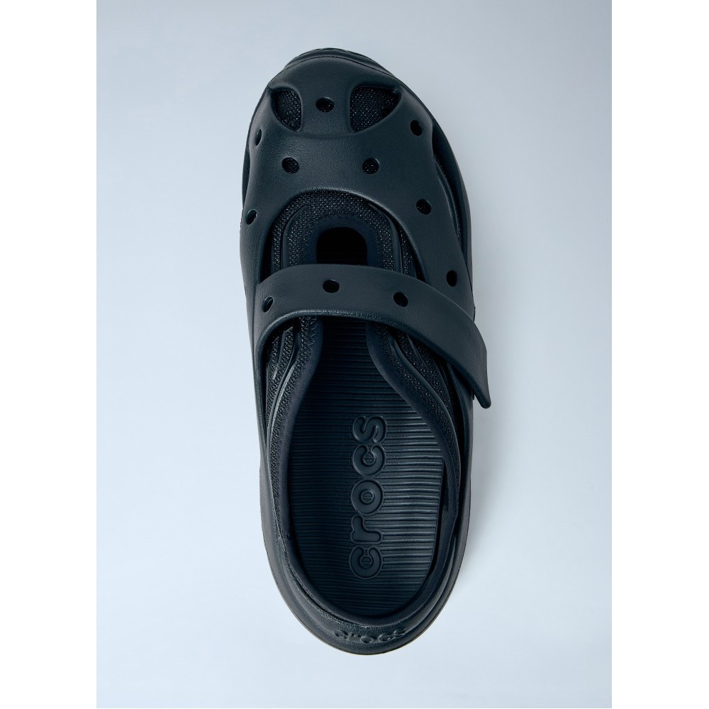 Perforated slip-on clogs with adjustable strap.