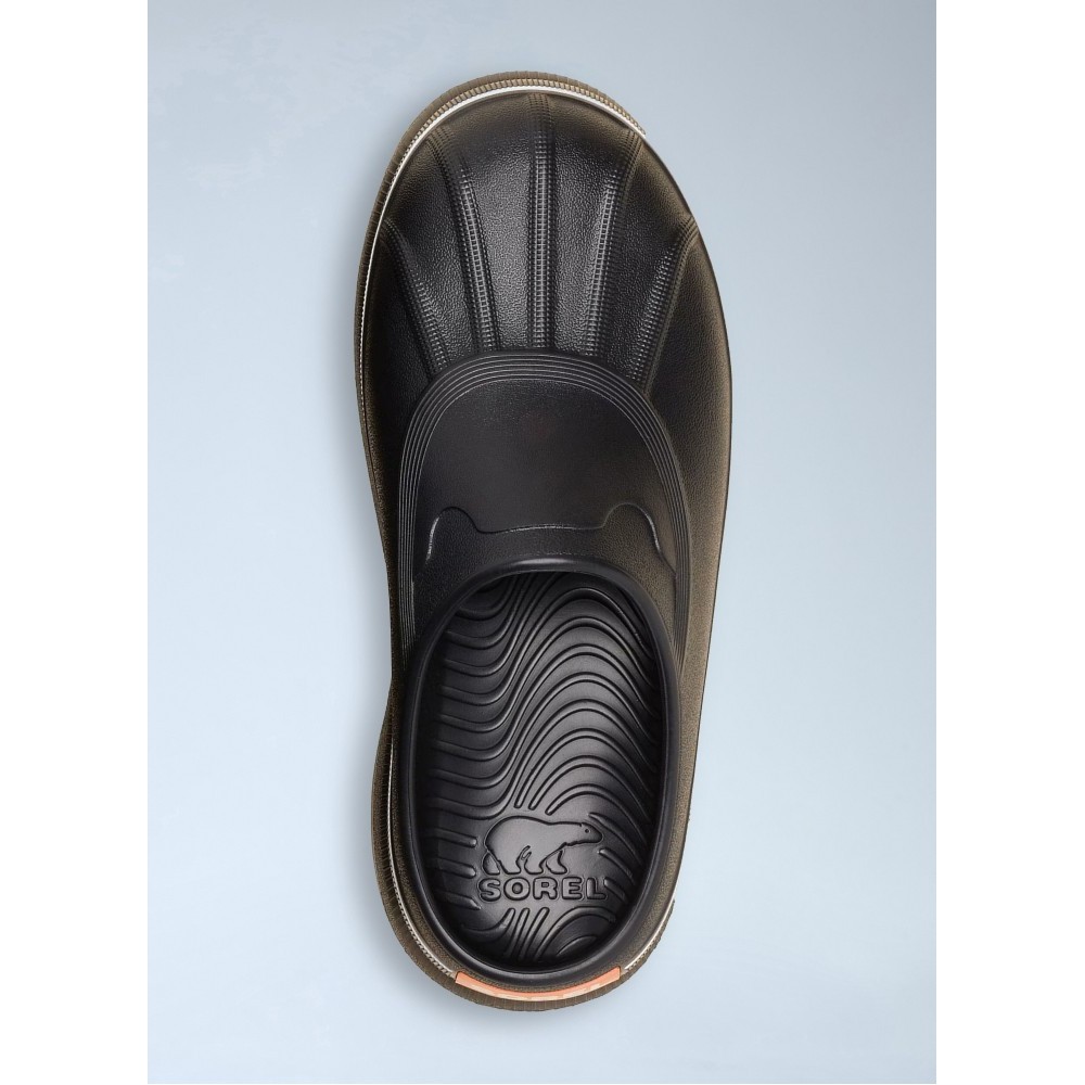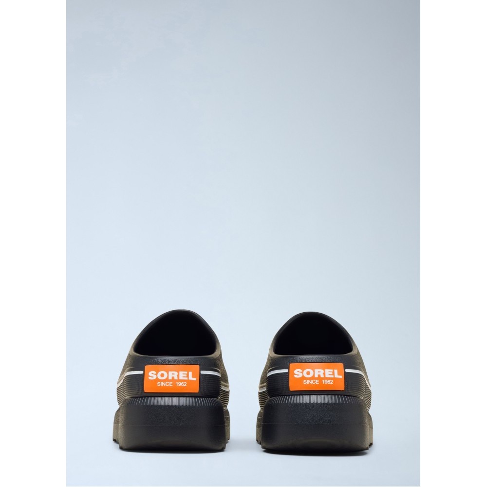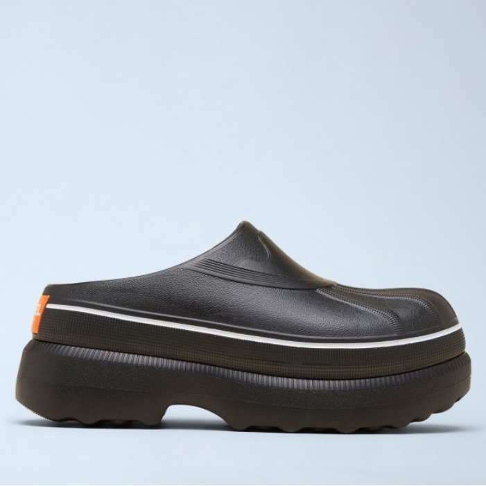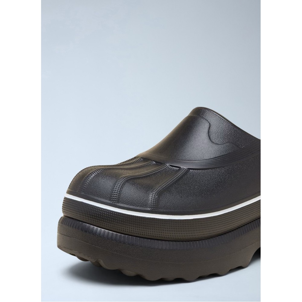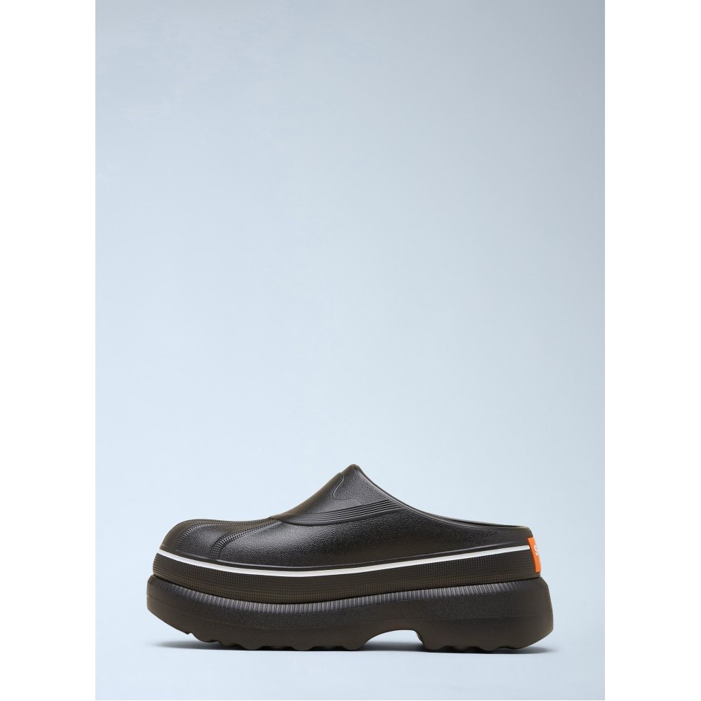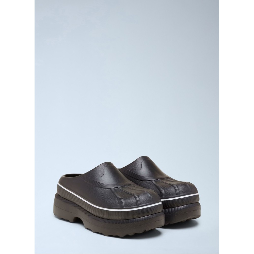 Platform slip-on clogs with textured rubber upper.