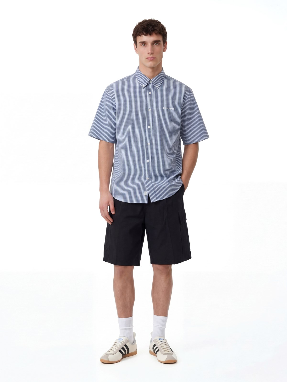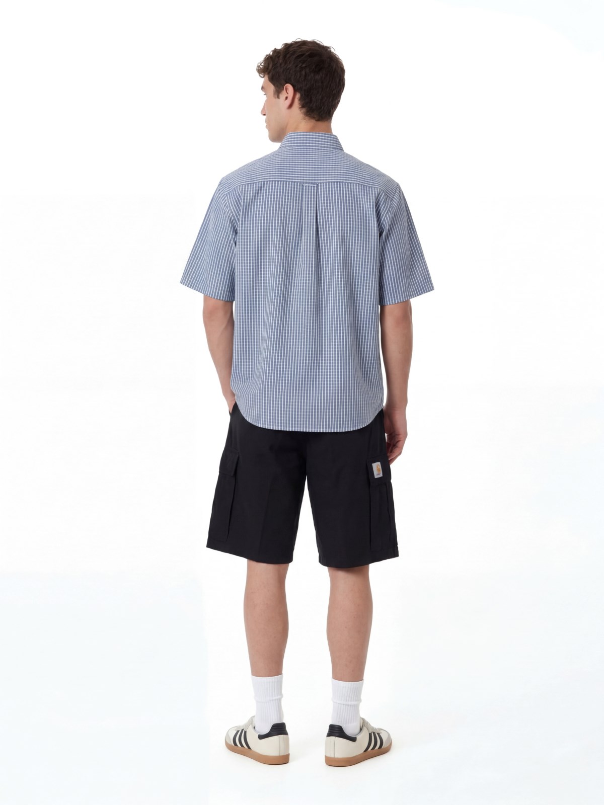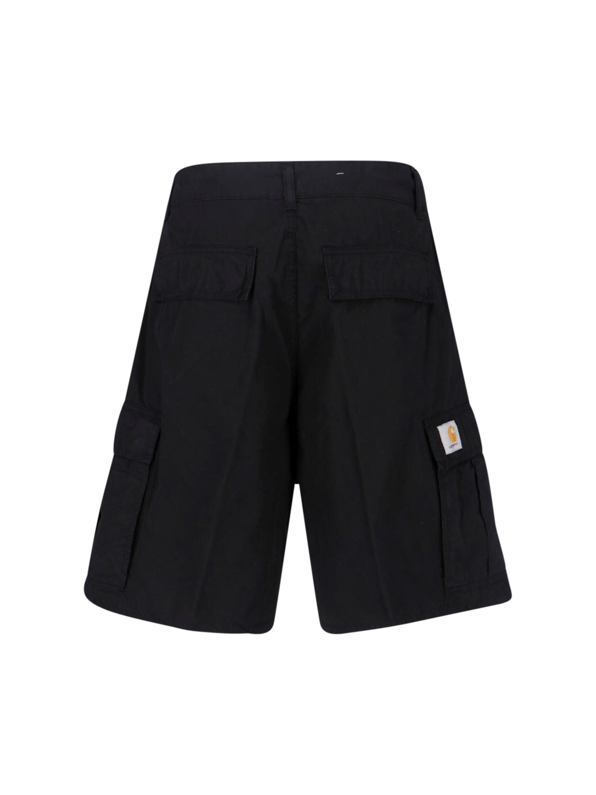Carhartt WIP cargo shorts in black cotton, mid-rise, button and zip closure, belt loops, two side pockets, two side cargo pockets, side logo patch, straight leg.