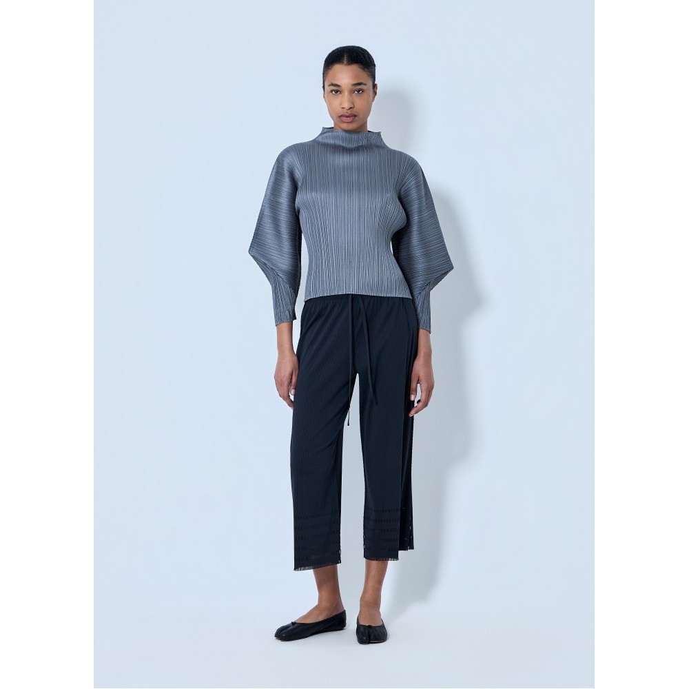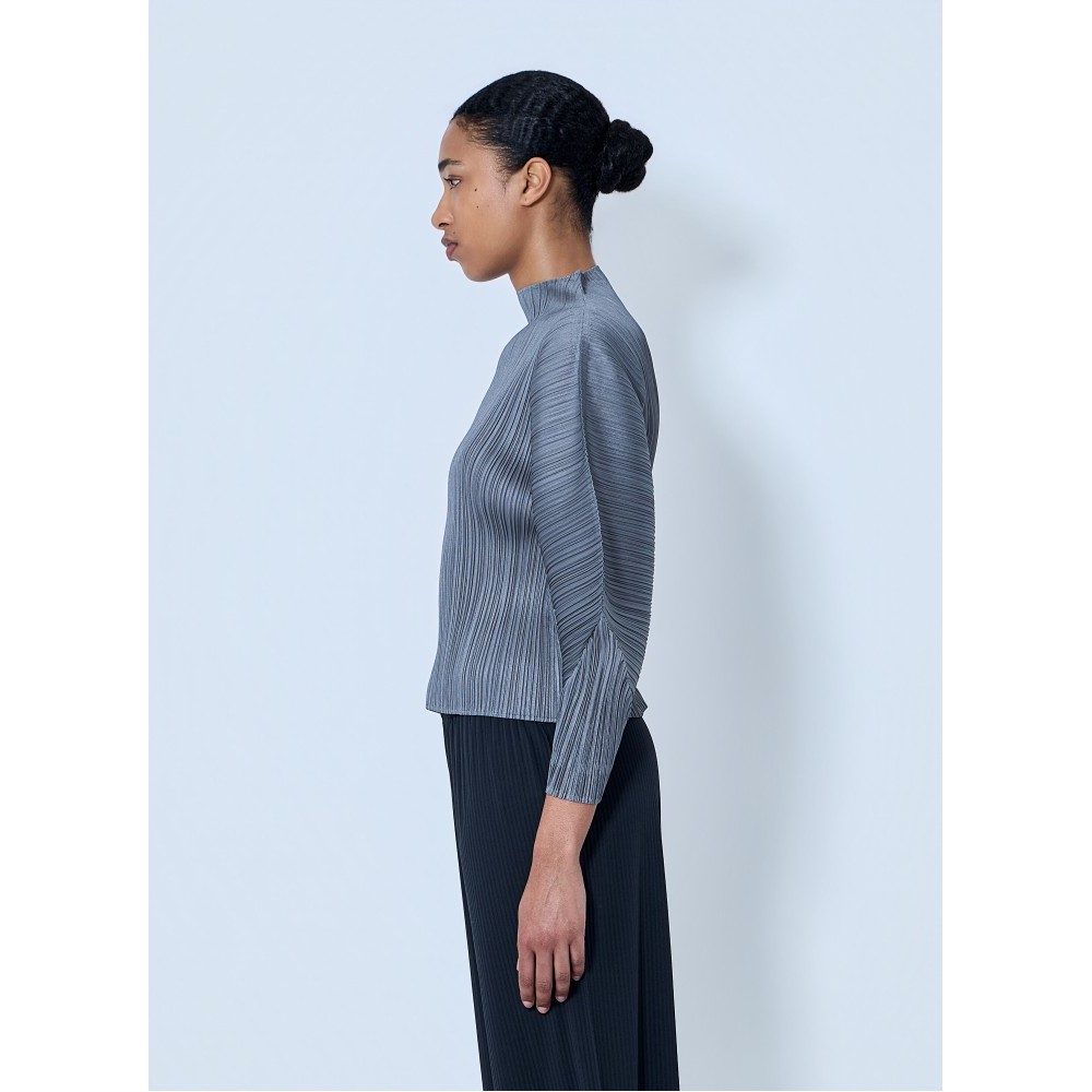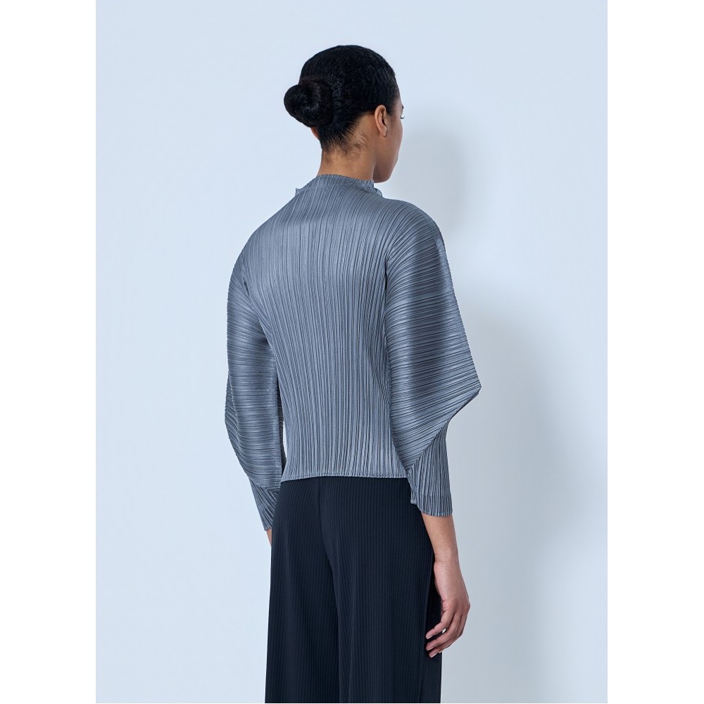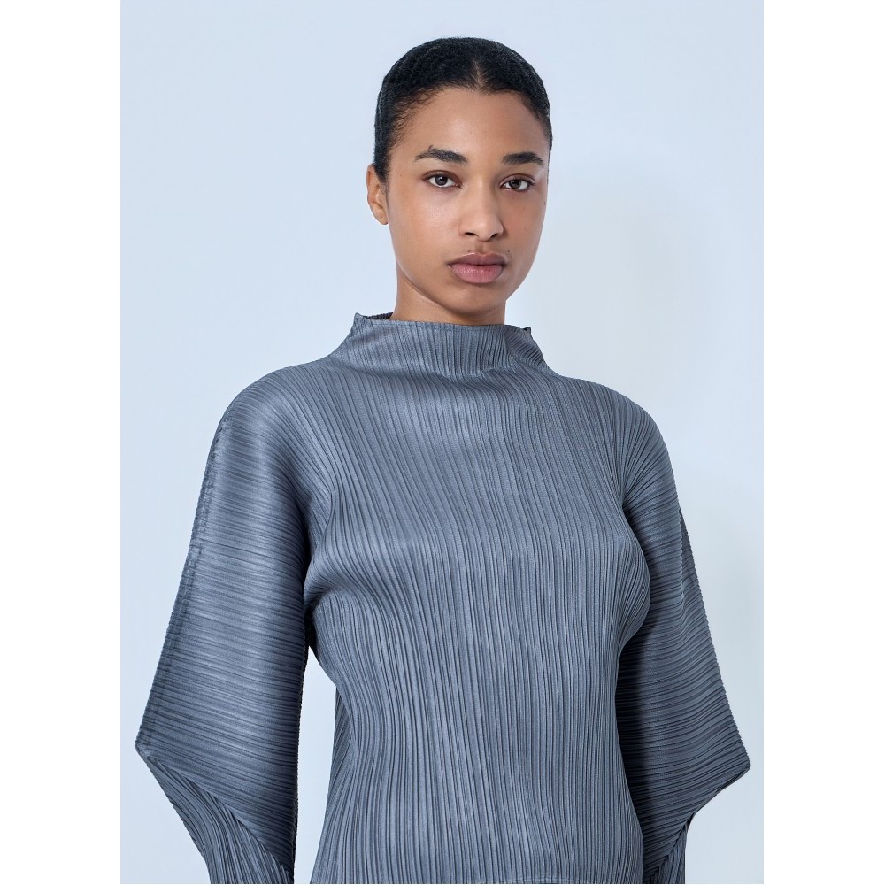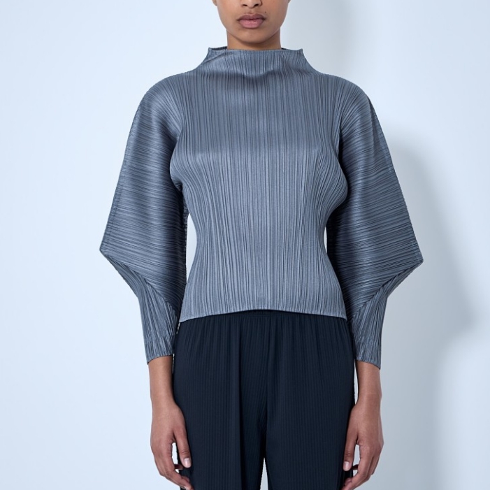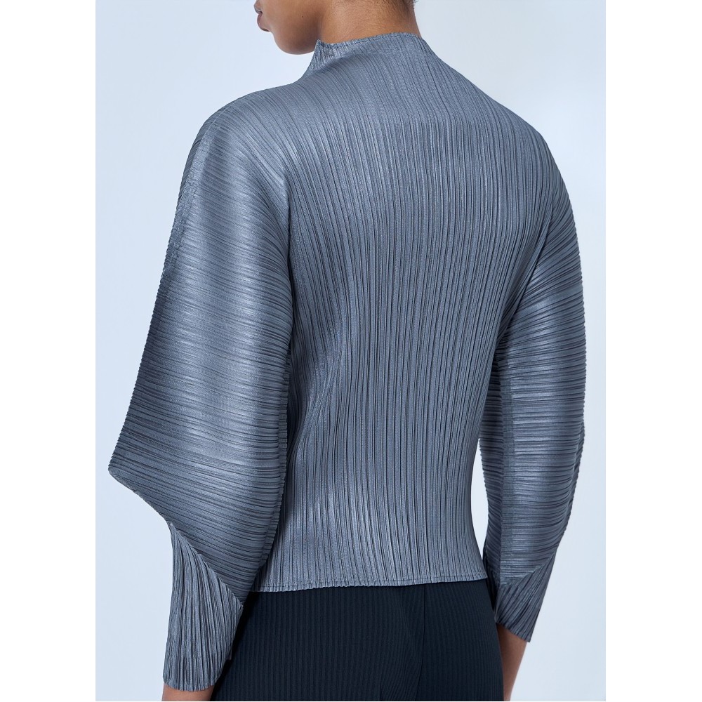 High-neck top with pleated construction and sculptural sleeves.