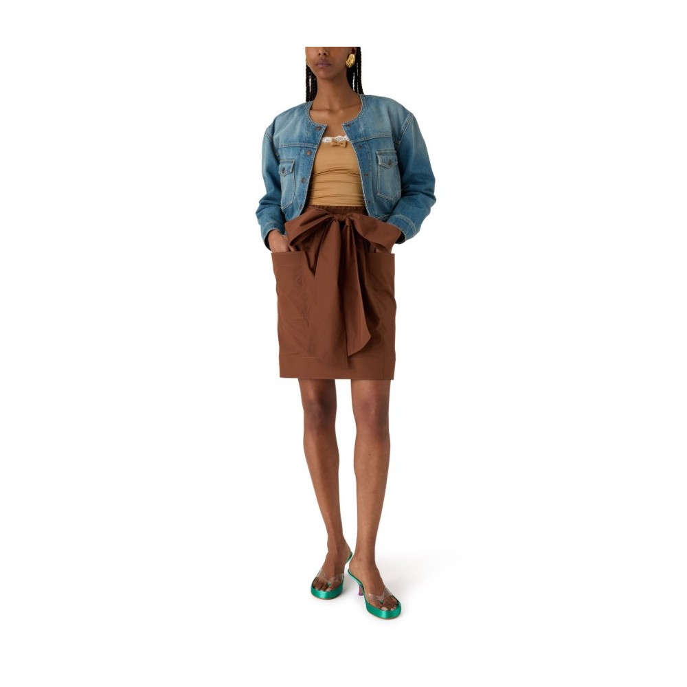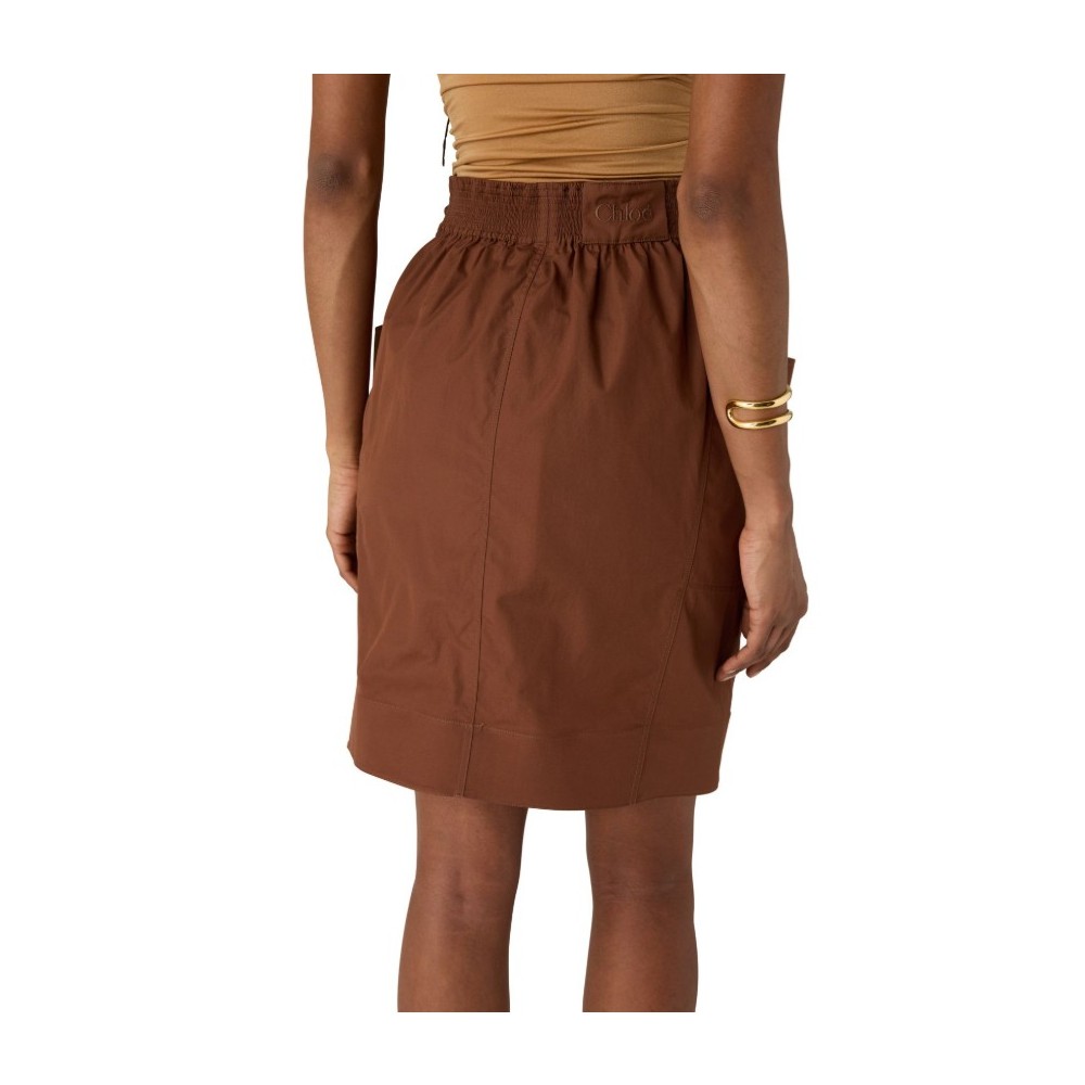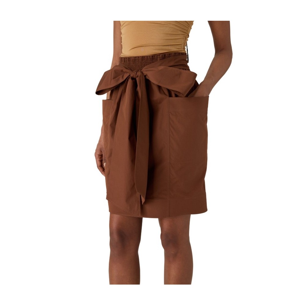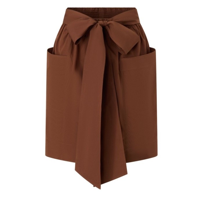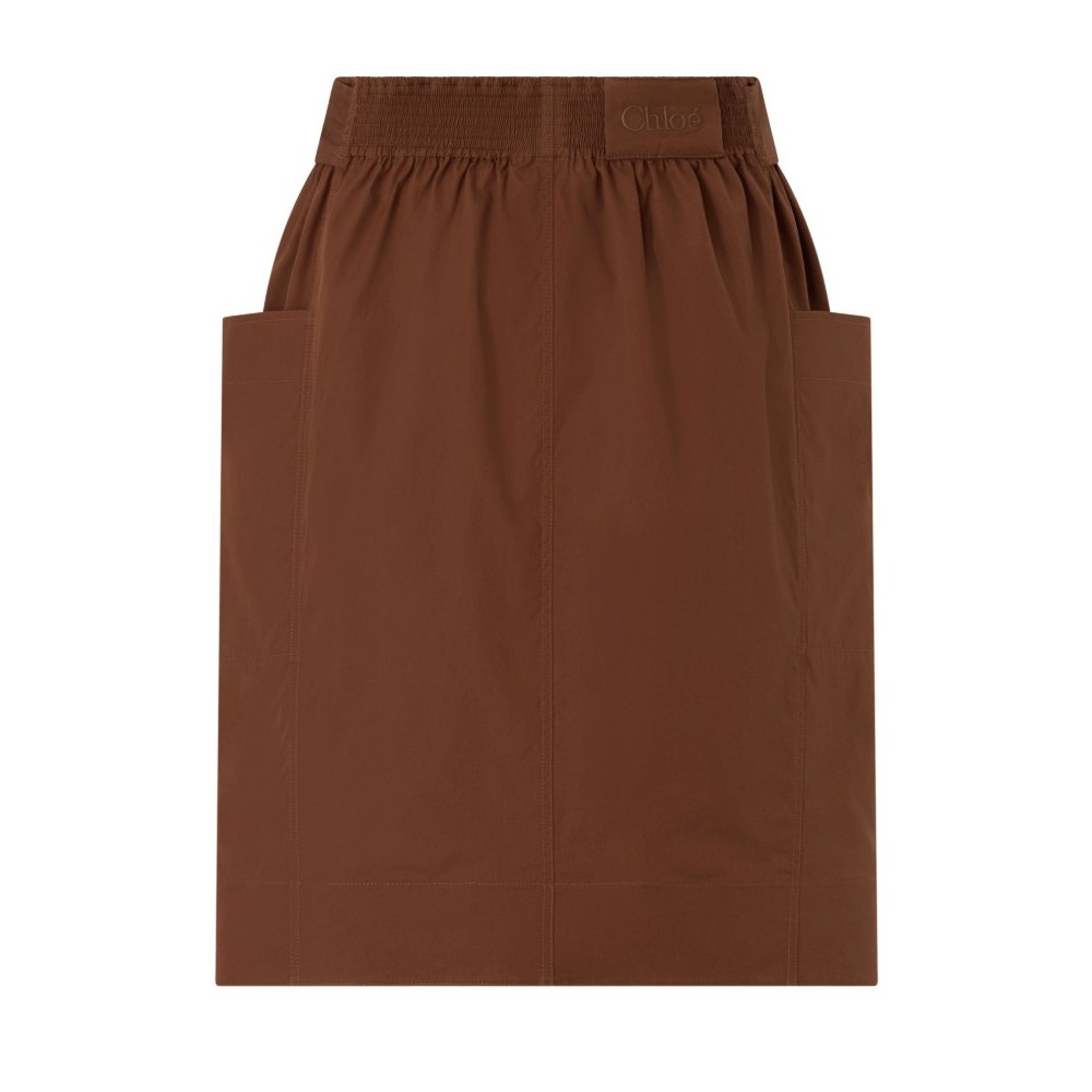 Description : Logo at the back, embossed logo, knee length, patch pockets, two front pockets, front panel / front paneling, back panel, elasticated waist, gathered at the waist, straight skirt.