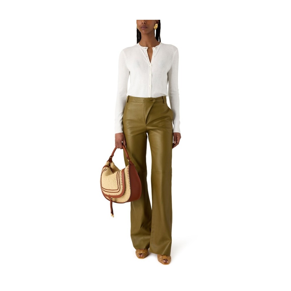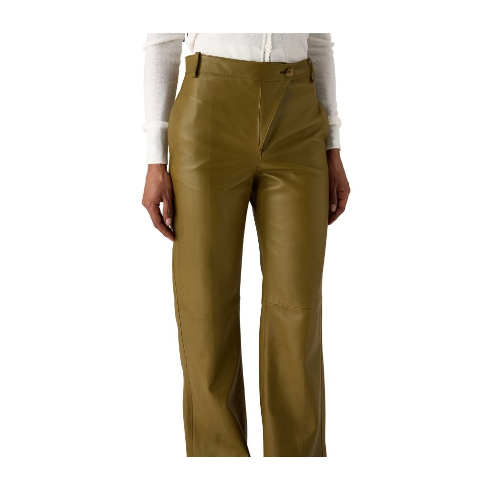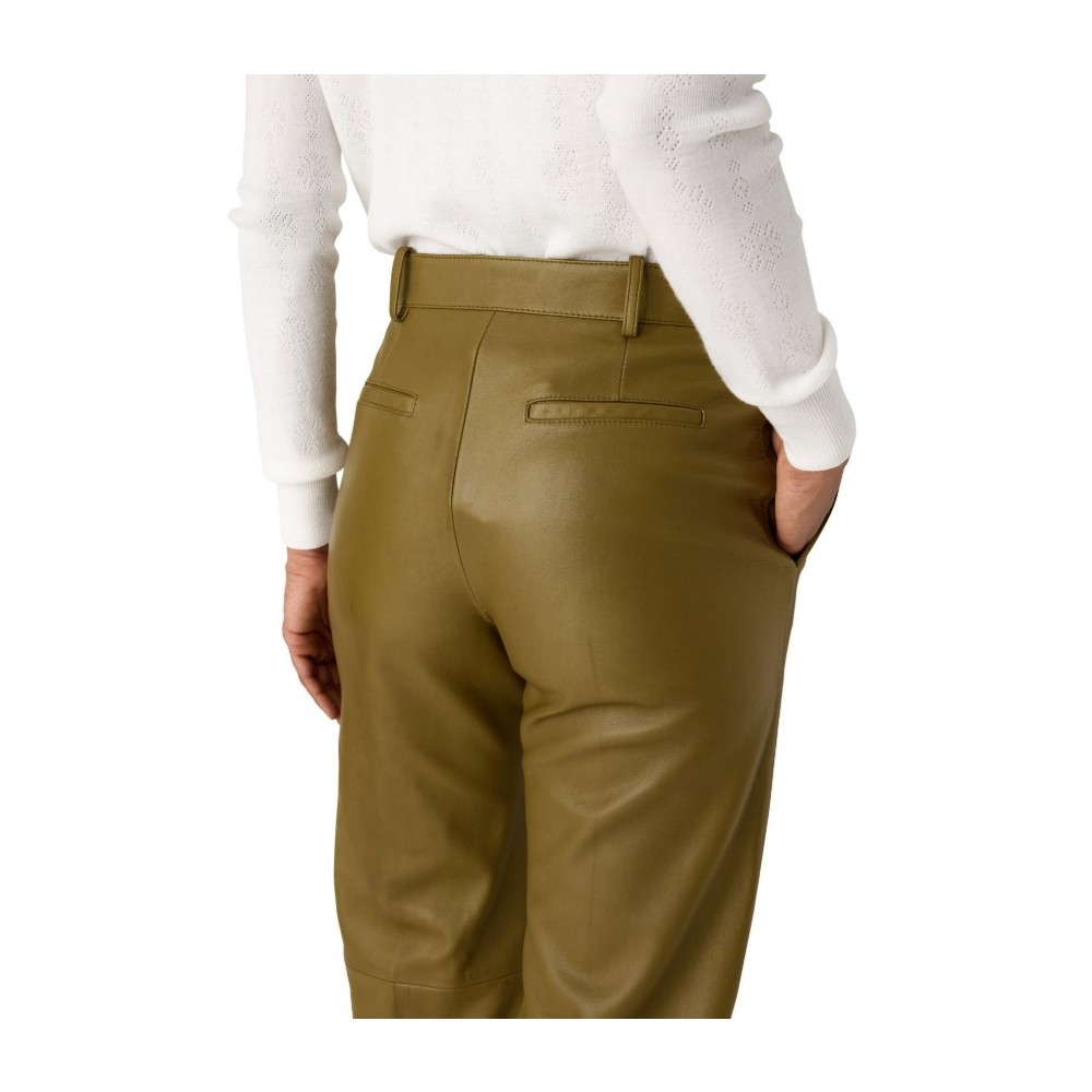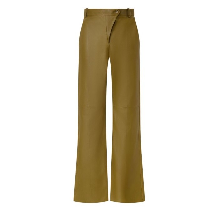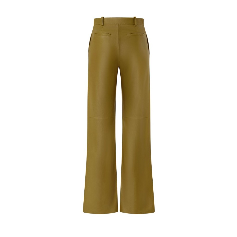 Description : Front and back pockets, welt pockets, front panel / front paneling, buttoned zipper closure, topstitched edges, belt loops.Material : Outer shell: 100% leather, main lining: 100% cupro, button: 100% horn