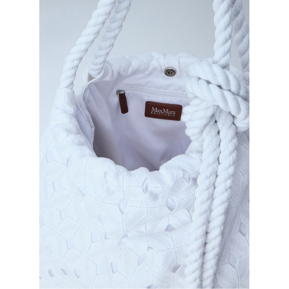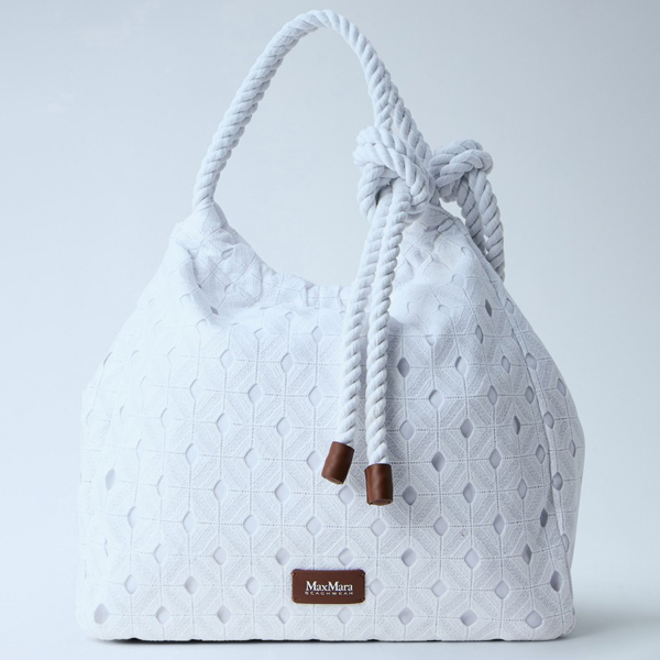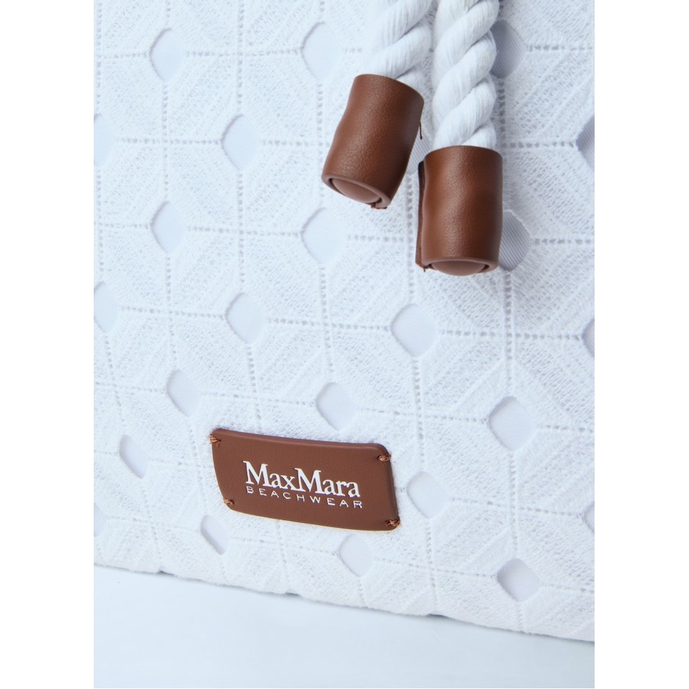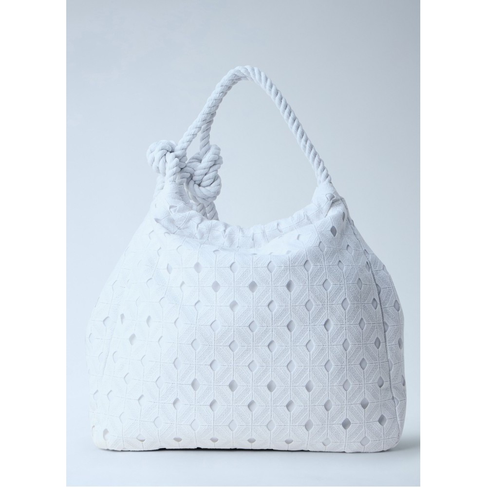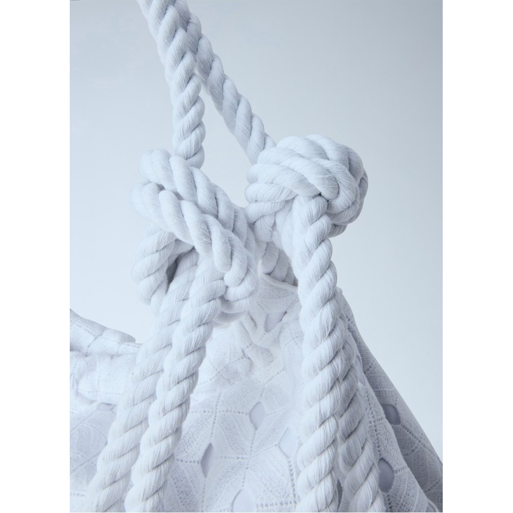 Textured tote bag with rope handle and knot detail.