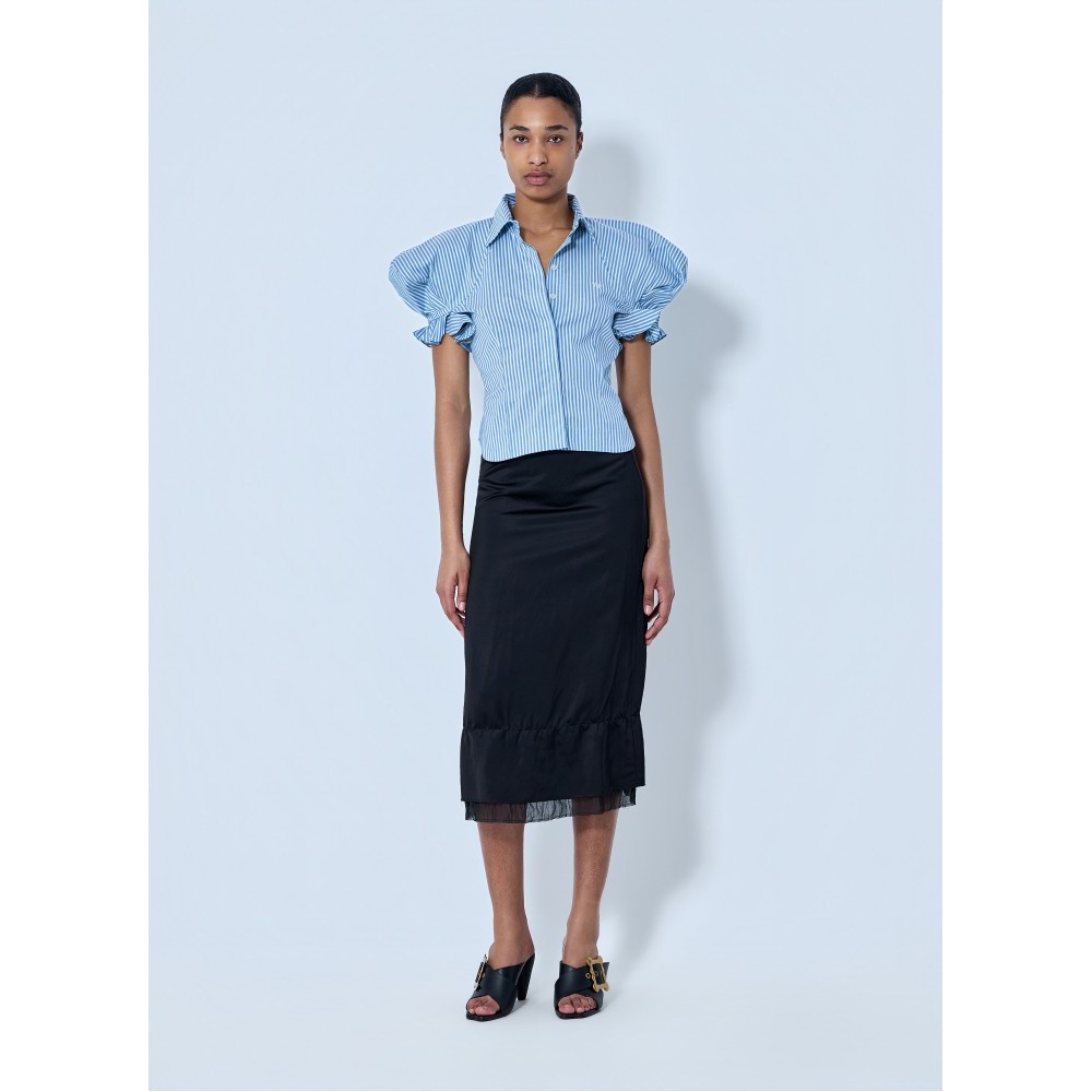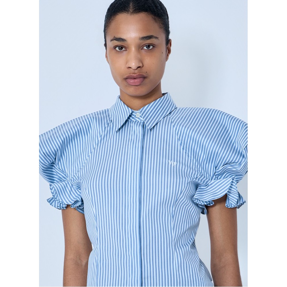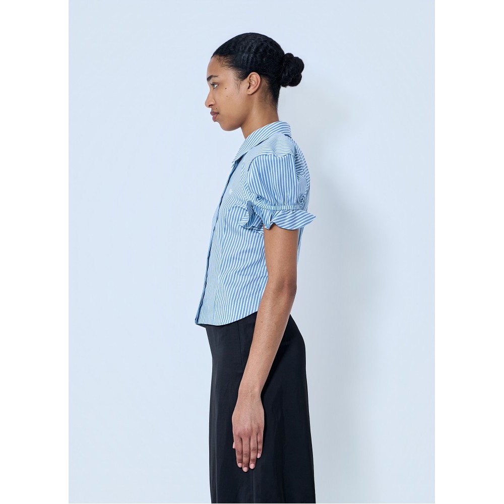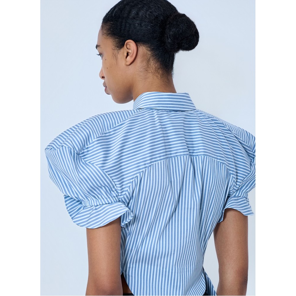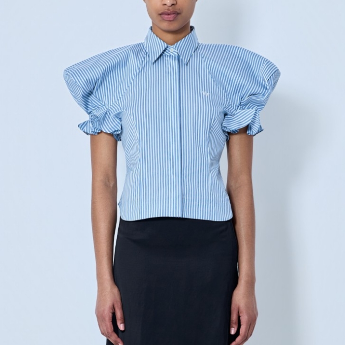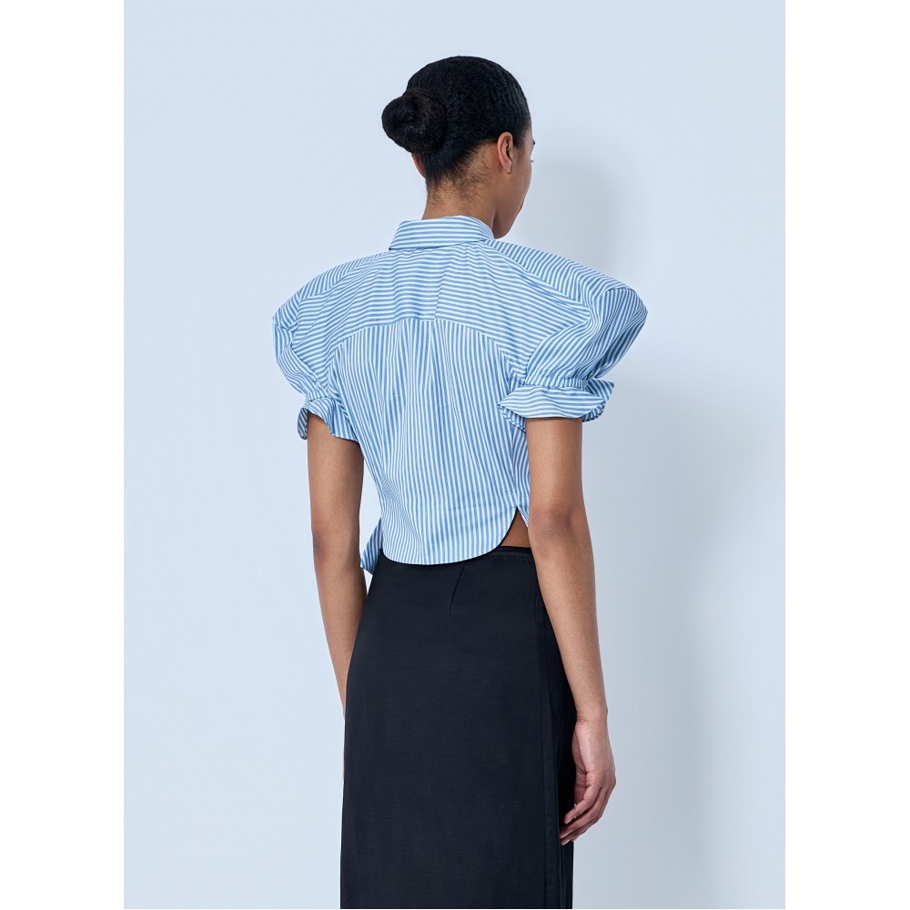 Button-down blouse with structured puff sleeves.