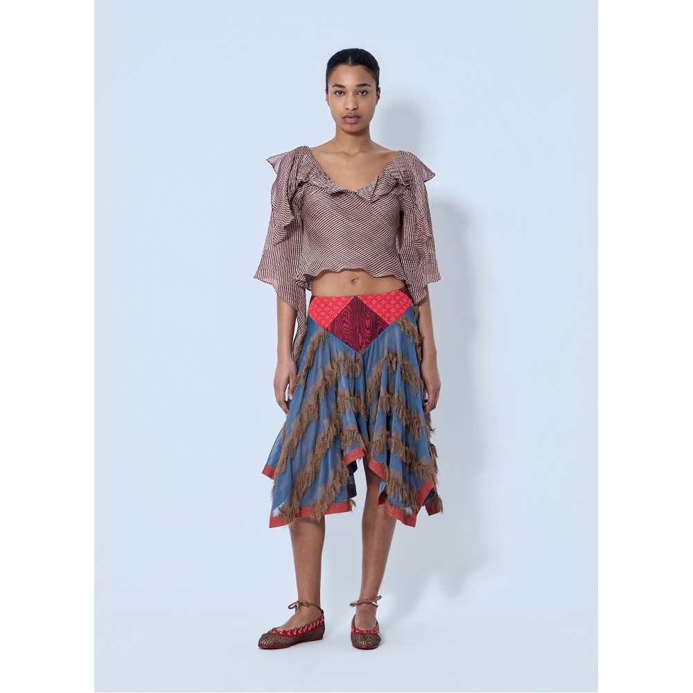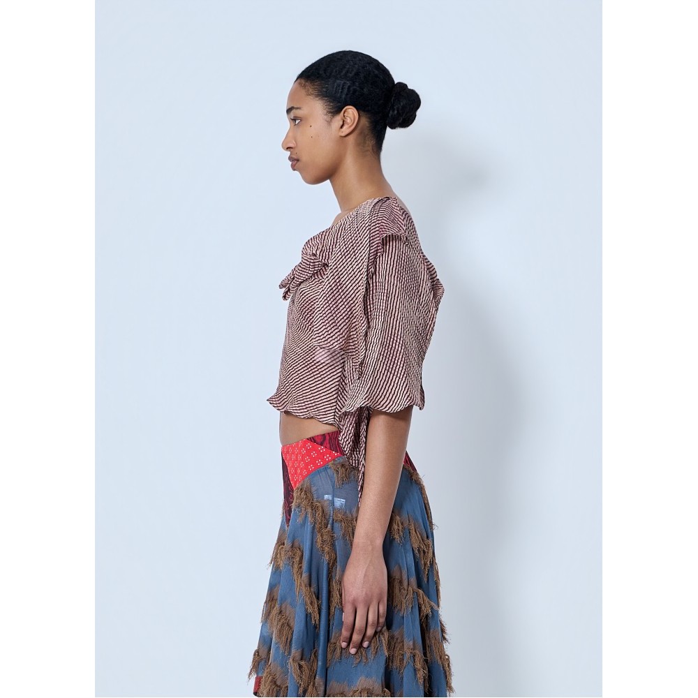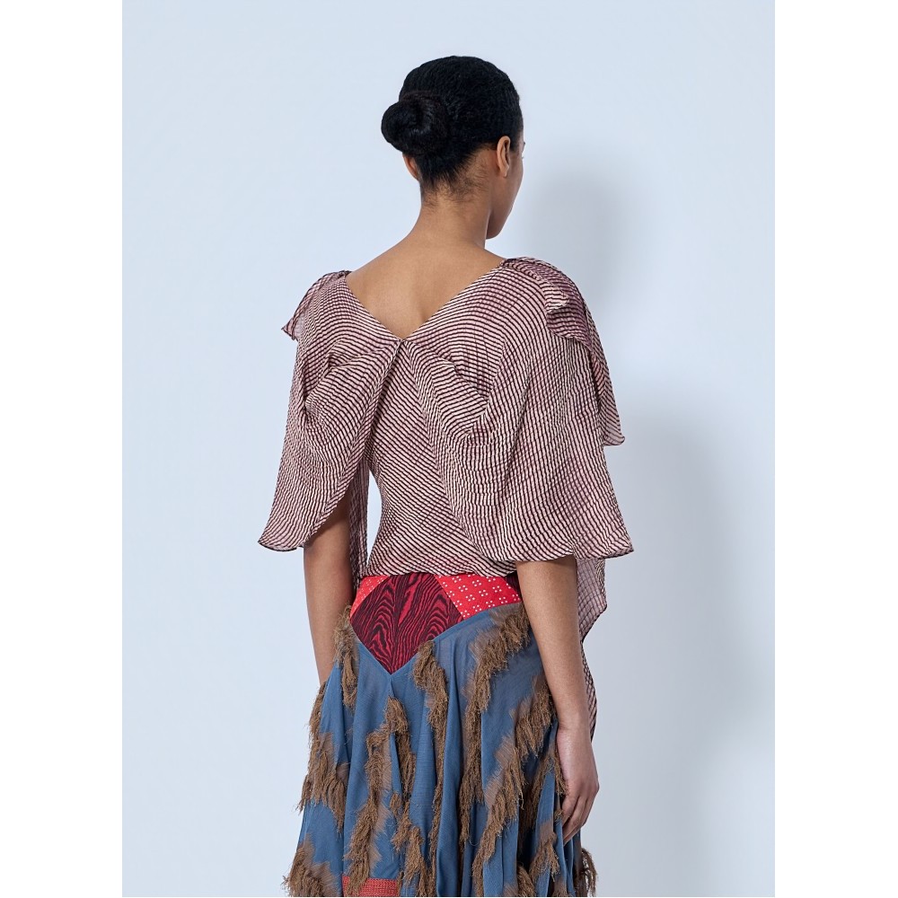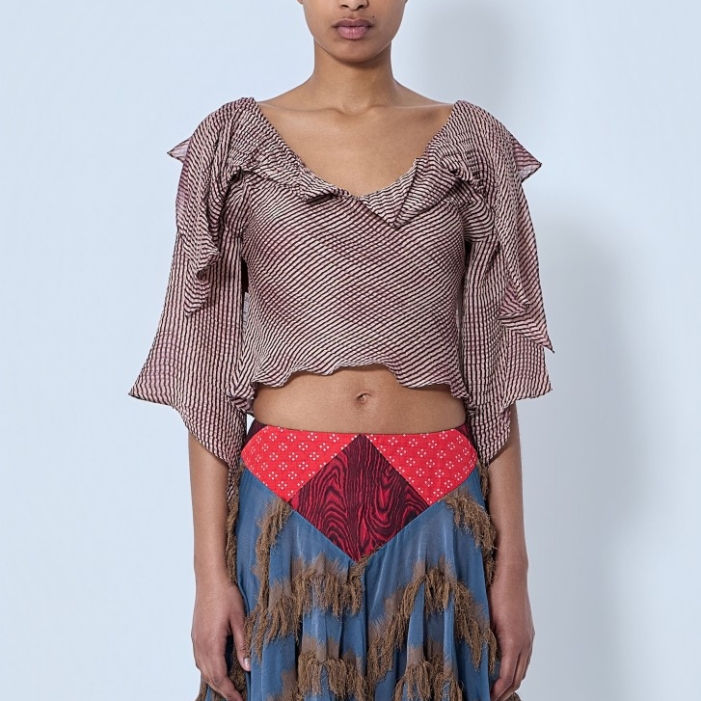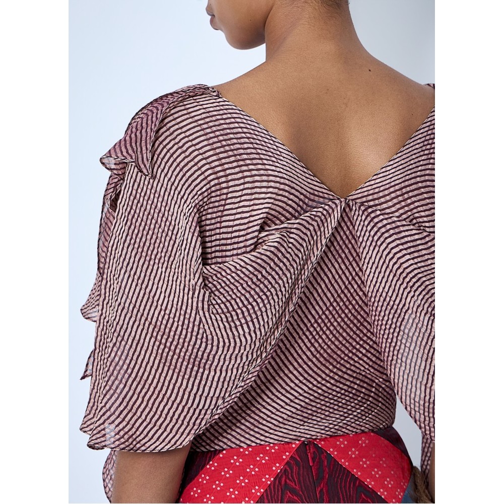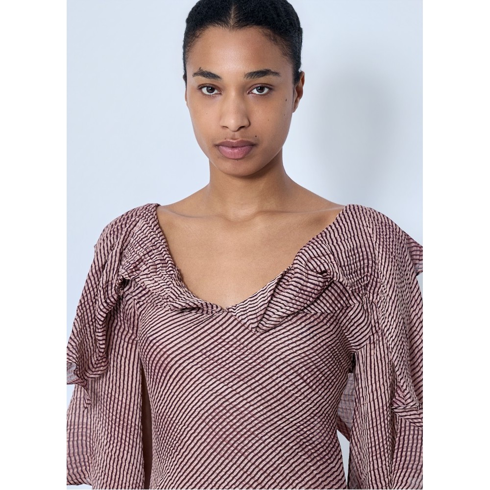 Blouse with ruffled neckline and draped sleeves.