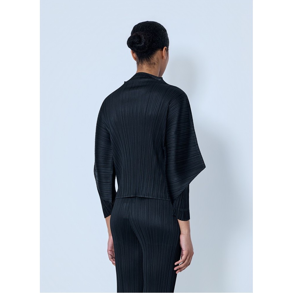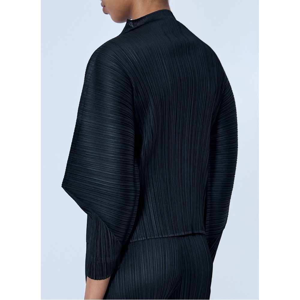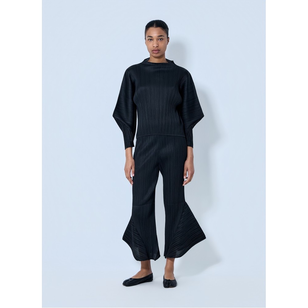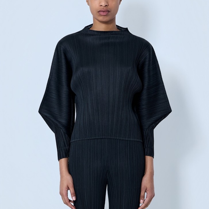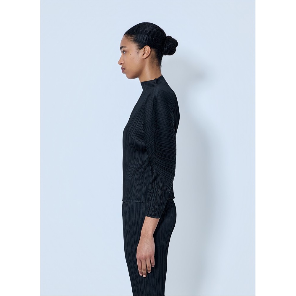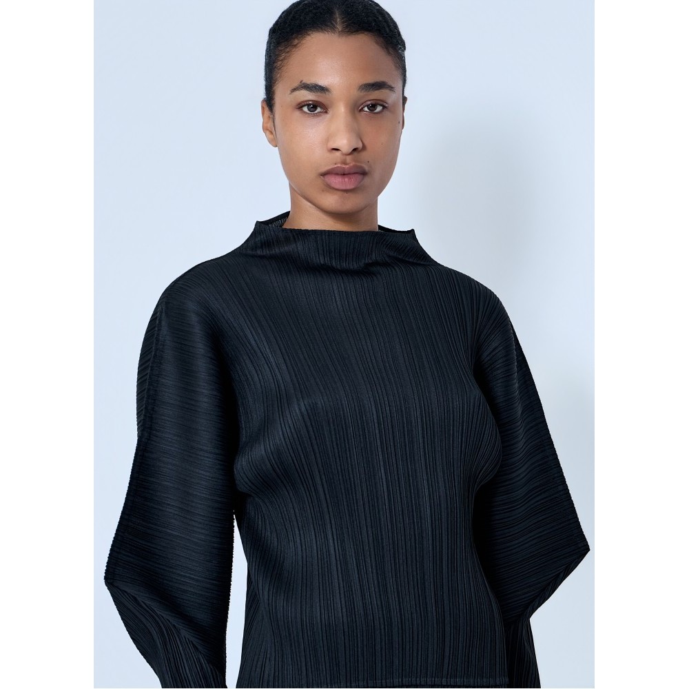 Boat neck top in textured pleated knit construction.