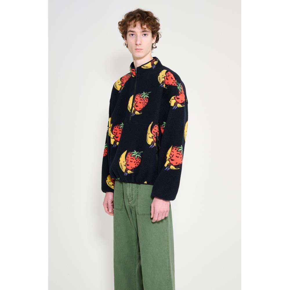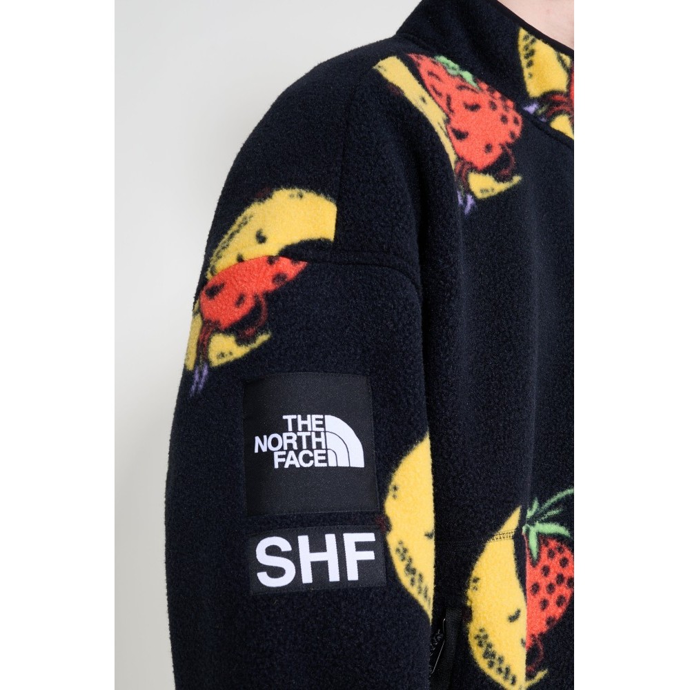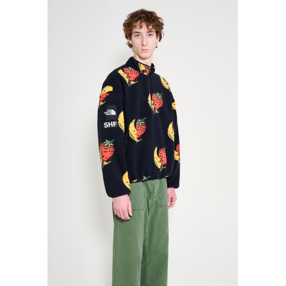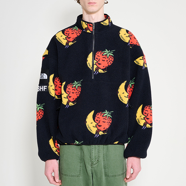 Fleece half-zip from The North Face x Sky High Farm. Cut from soft polyester fleece with a high stand collar and short front zipper. The surface carries strawberry and moon artwork with a logo patch on the sleeve. Finished with long sleeves, twin zippered side pockets, and elastic binding at the cuffs and hem.