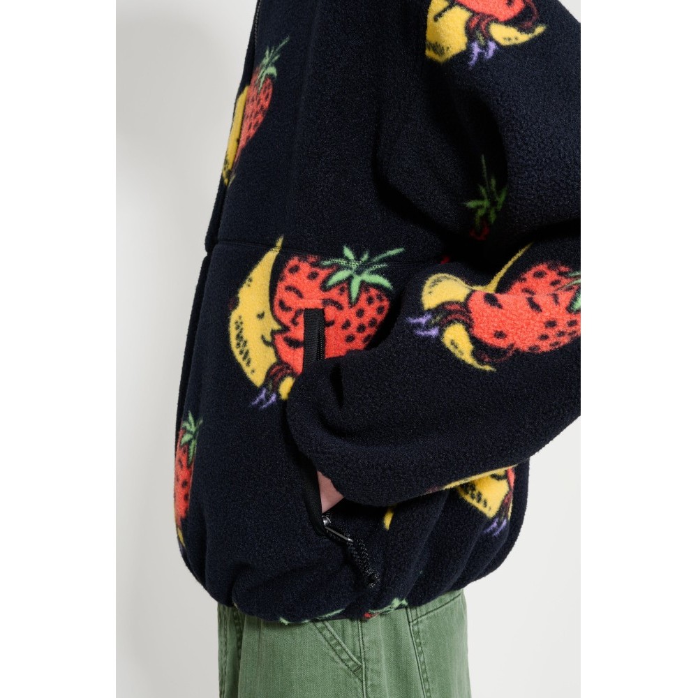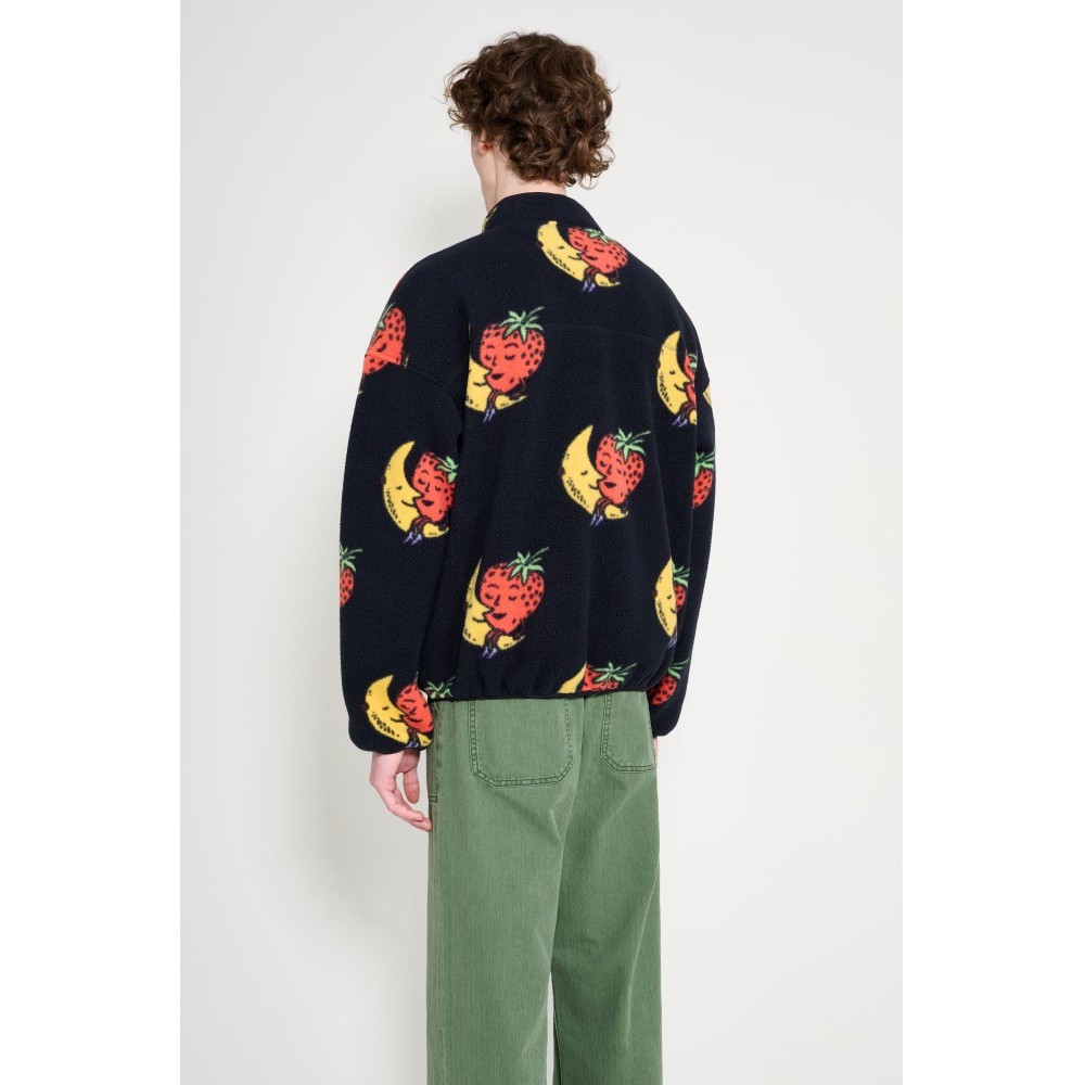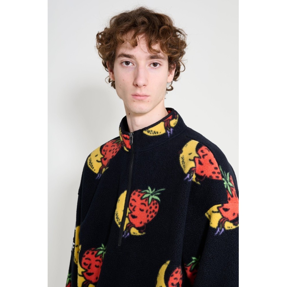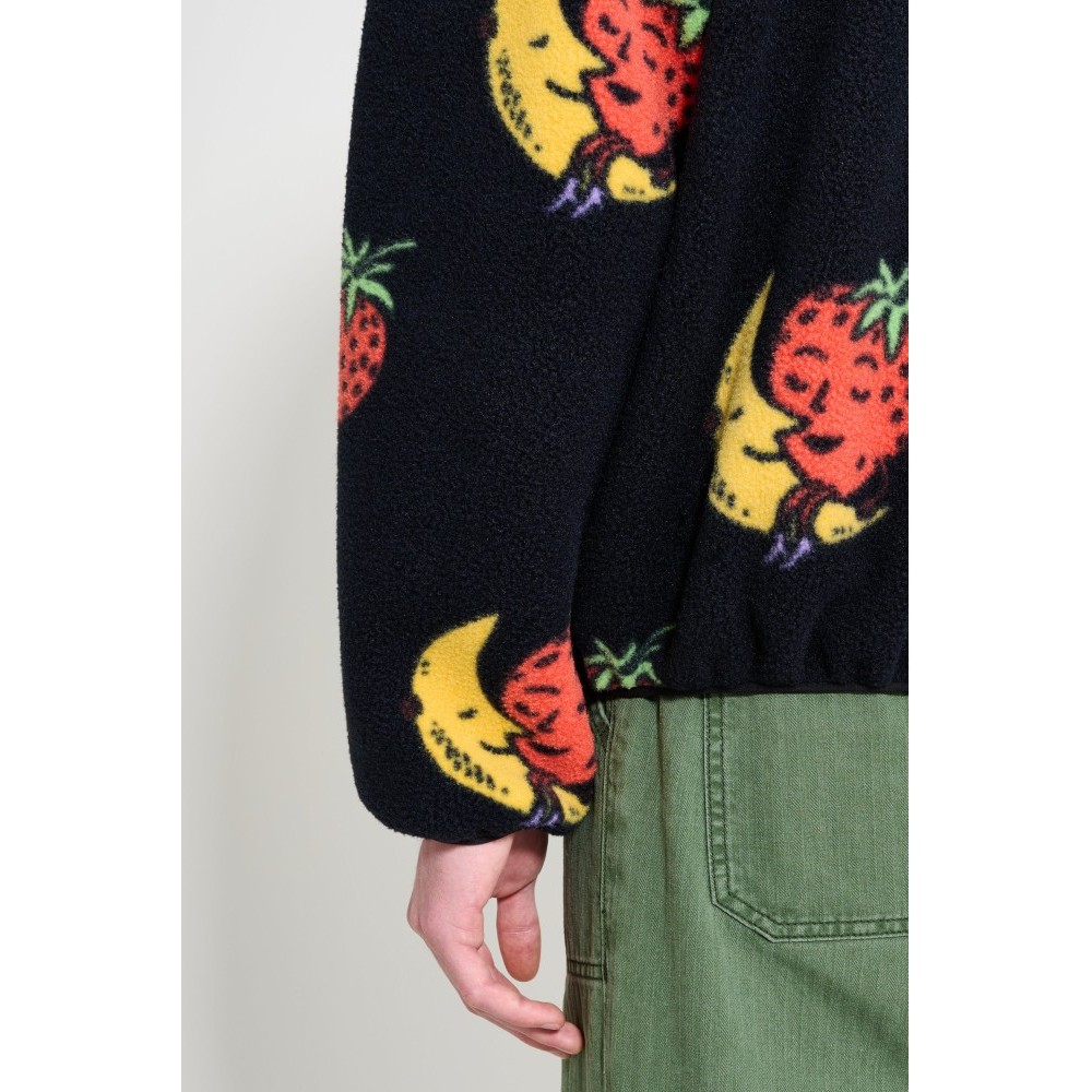Fleece half-zip from The North Face x Sky High Farm. Cut from soft polyester fleece with a high stand collar and short front zipper. The surface carries strawberry and moon artwork with a logo patch on the sleeve. Finished with long sleeves, twin zippered side pockets, and elastic binding at the cuffs and hem.