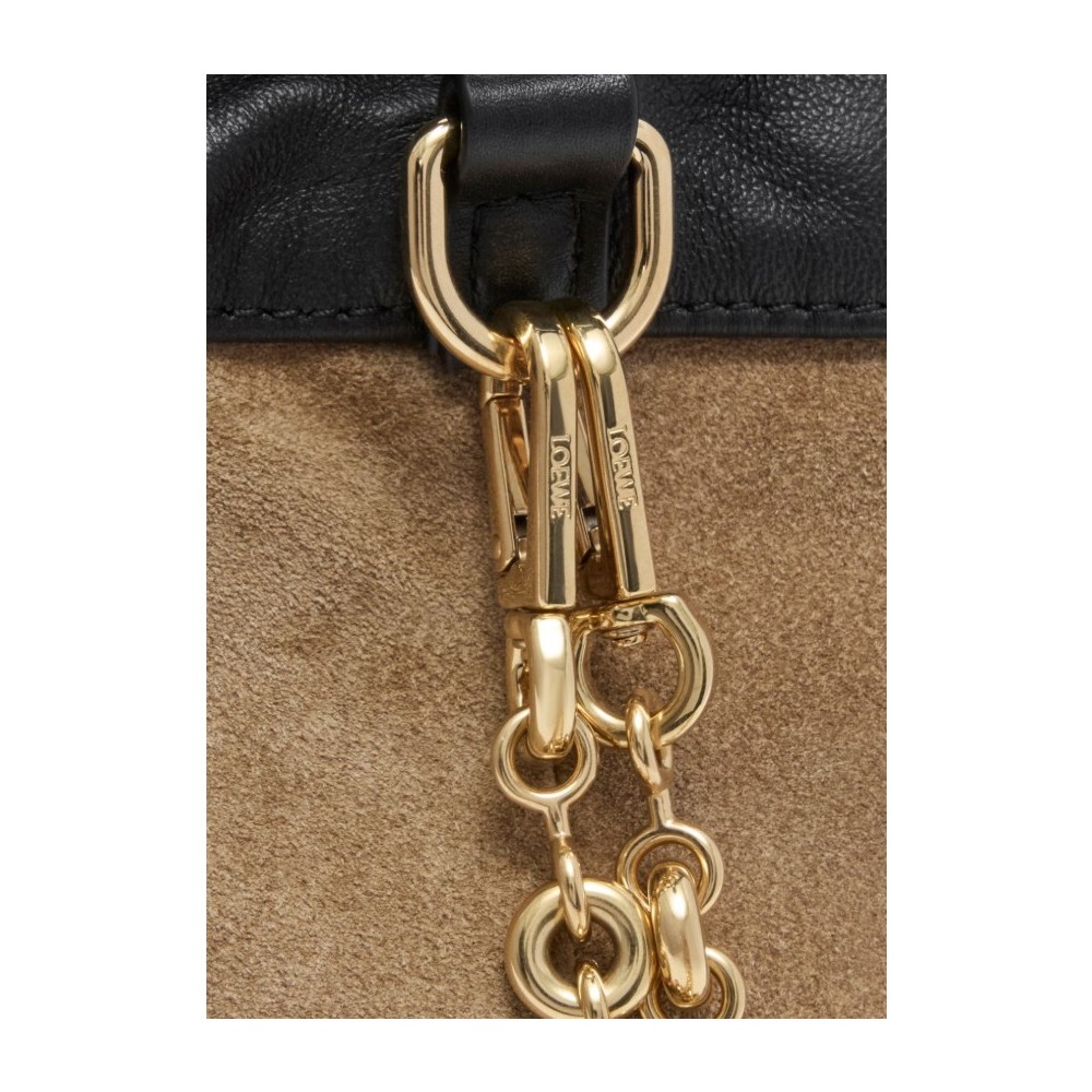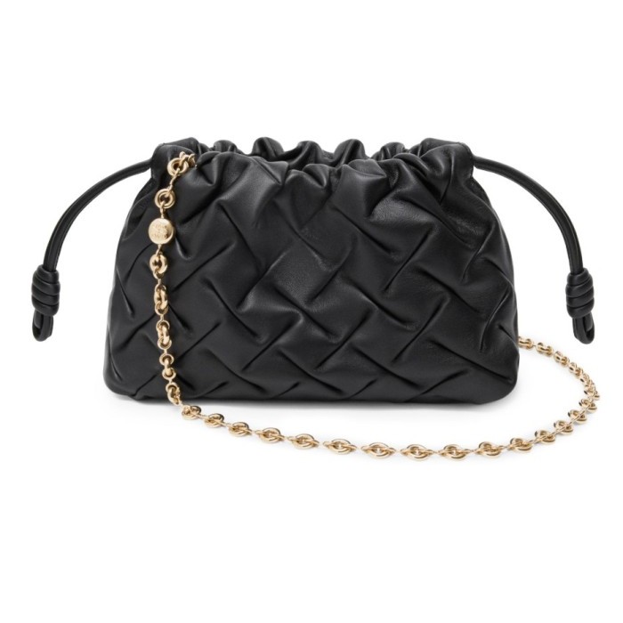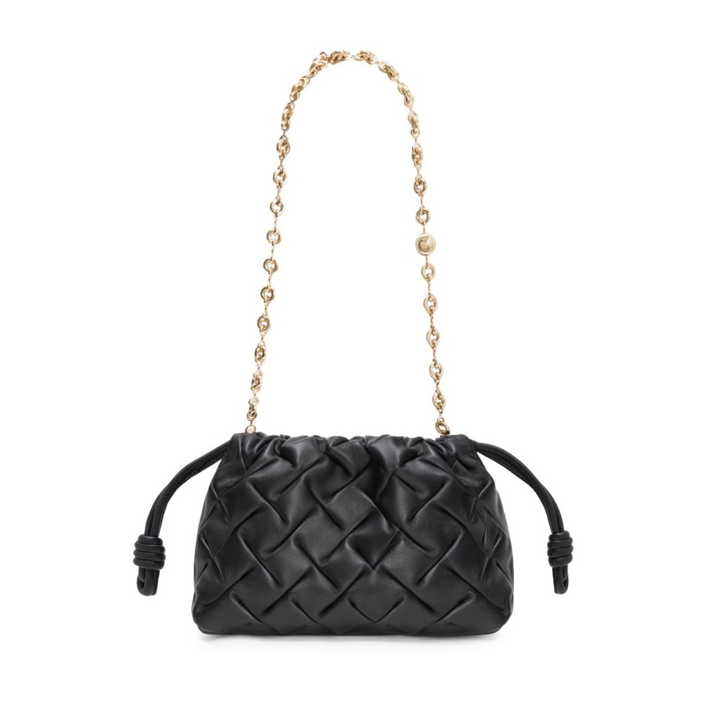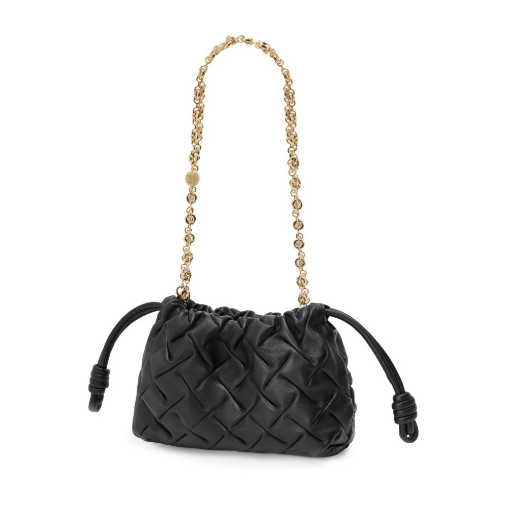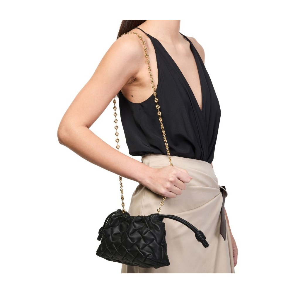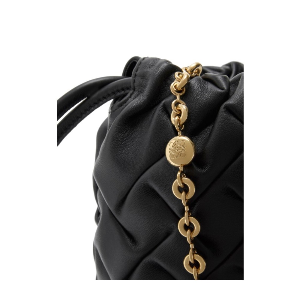 ¼³¸í :Small bucket bag,shoulder bag,chain strap,geometric details,smooth leather,drawstring closure,gold finish,padded texture.