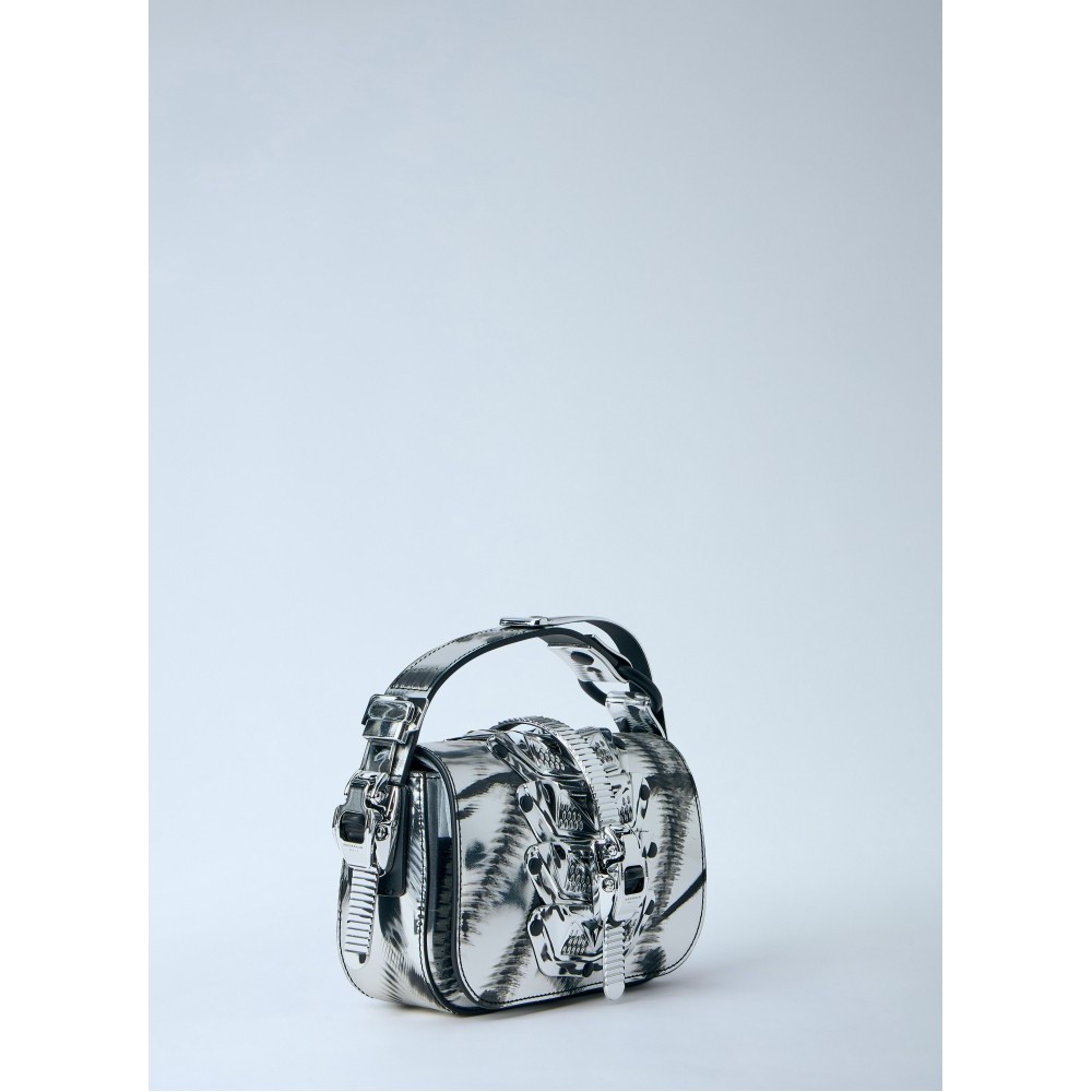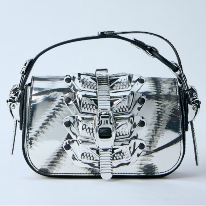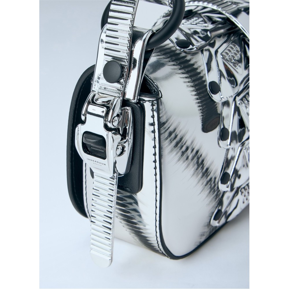 Handbag with geometric metallic embellishments and adjustable strap.