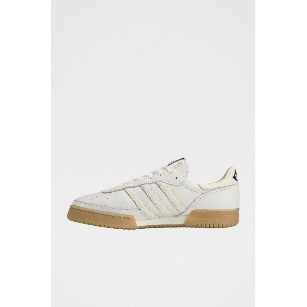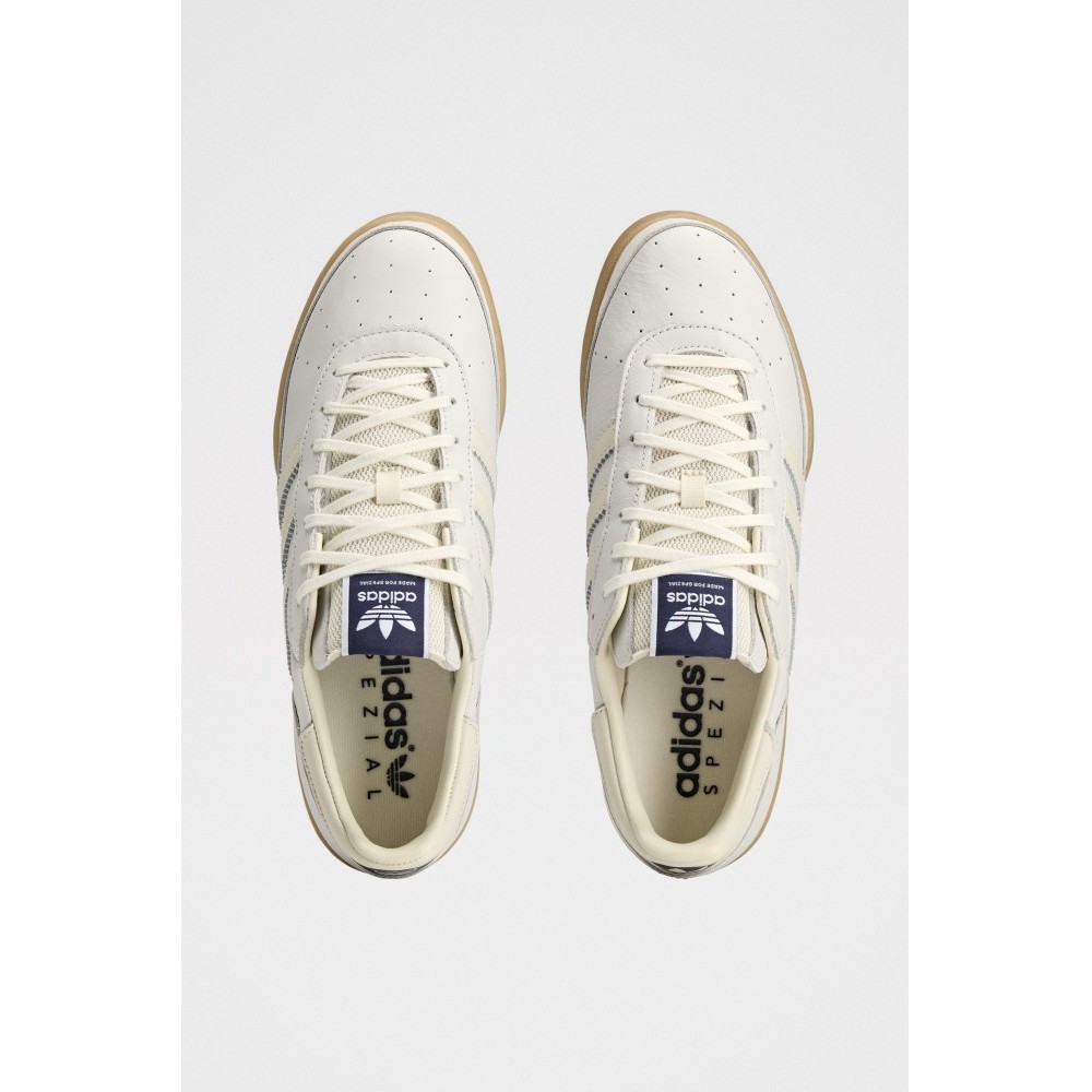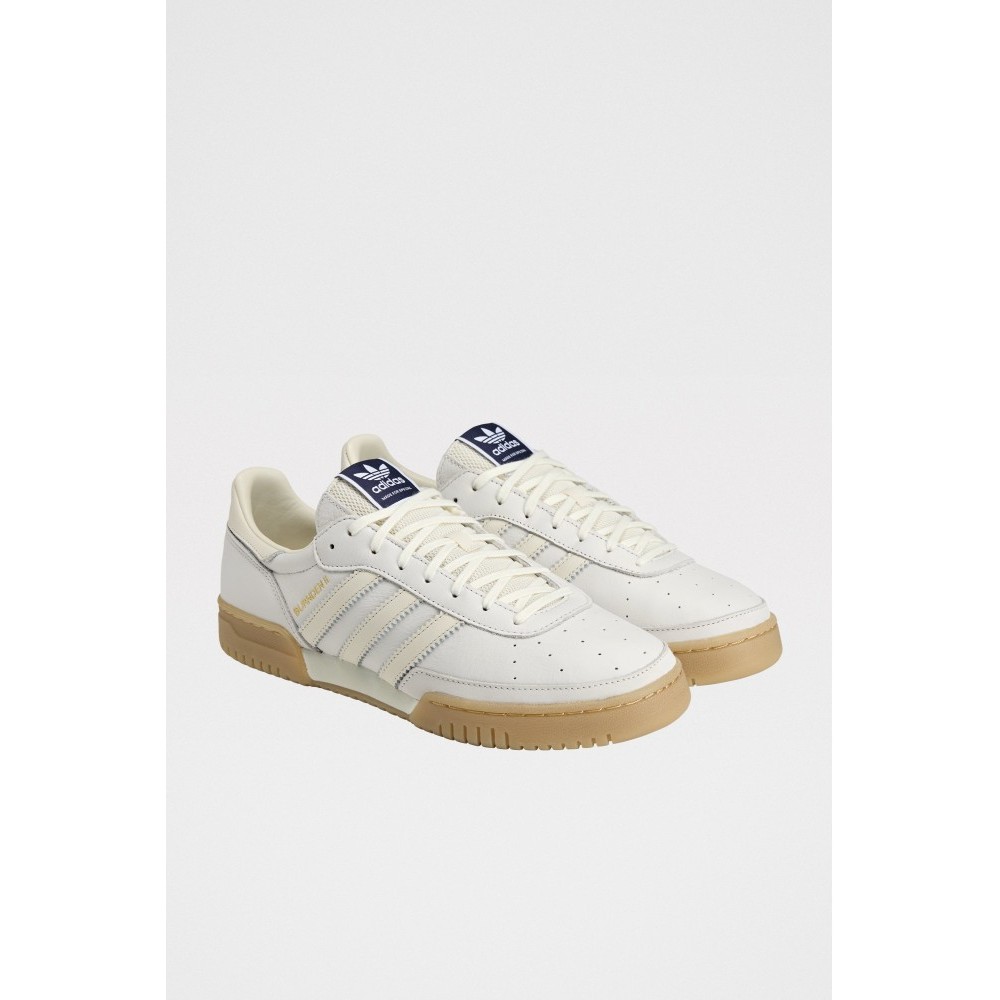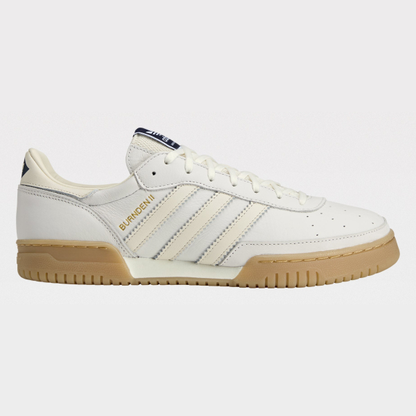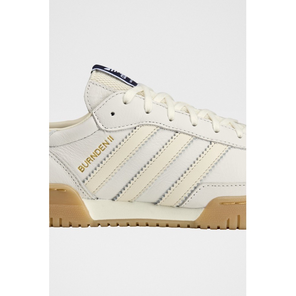 Low-top sneakers from adidas. The Burnden II SPZL features an all-white upper with layered panels and tonal 3-Stripes. A padded collar and tongue frame the lace-up front. Perforation details punctuate the vamp, while Spezial wordmark hits sit near the lateral stripes. A textured gum rubber outsole and slightly raised sidewall complete the terrace-inspired shape.
