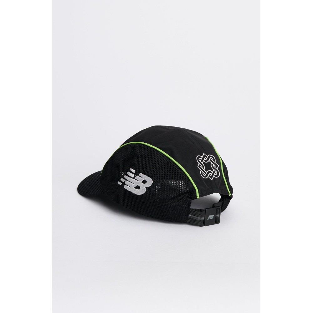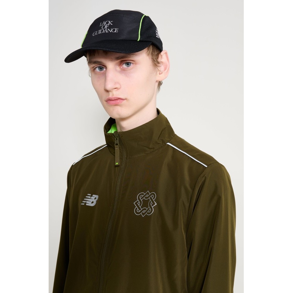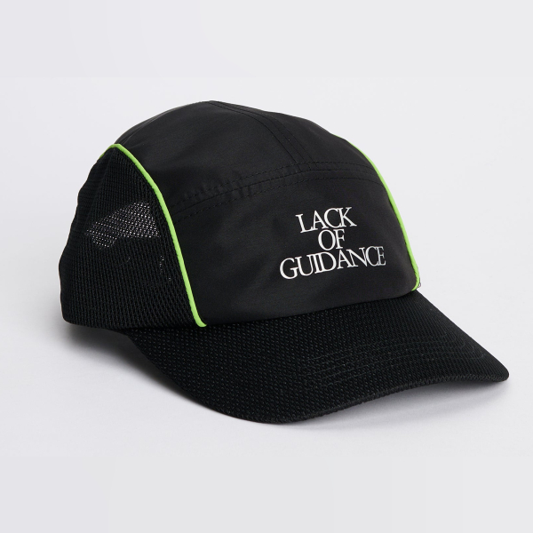5 panel cap from New Balance x Lack Of Guidance. Black crown with white and neon green color accents. Five-panel construction with flat peak and mesh panels on each side. Front, side and back logos referencing both collaborators. Adjustable fastening at the back for personalized sizing.