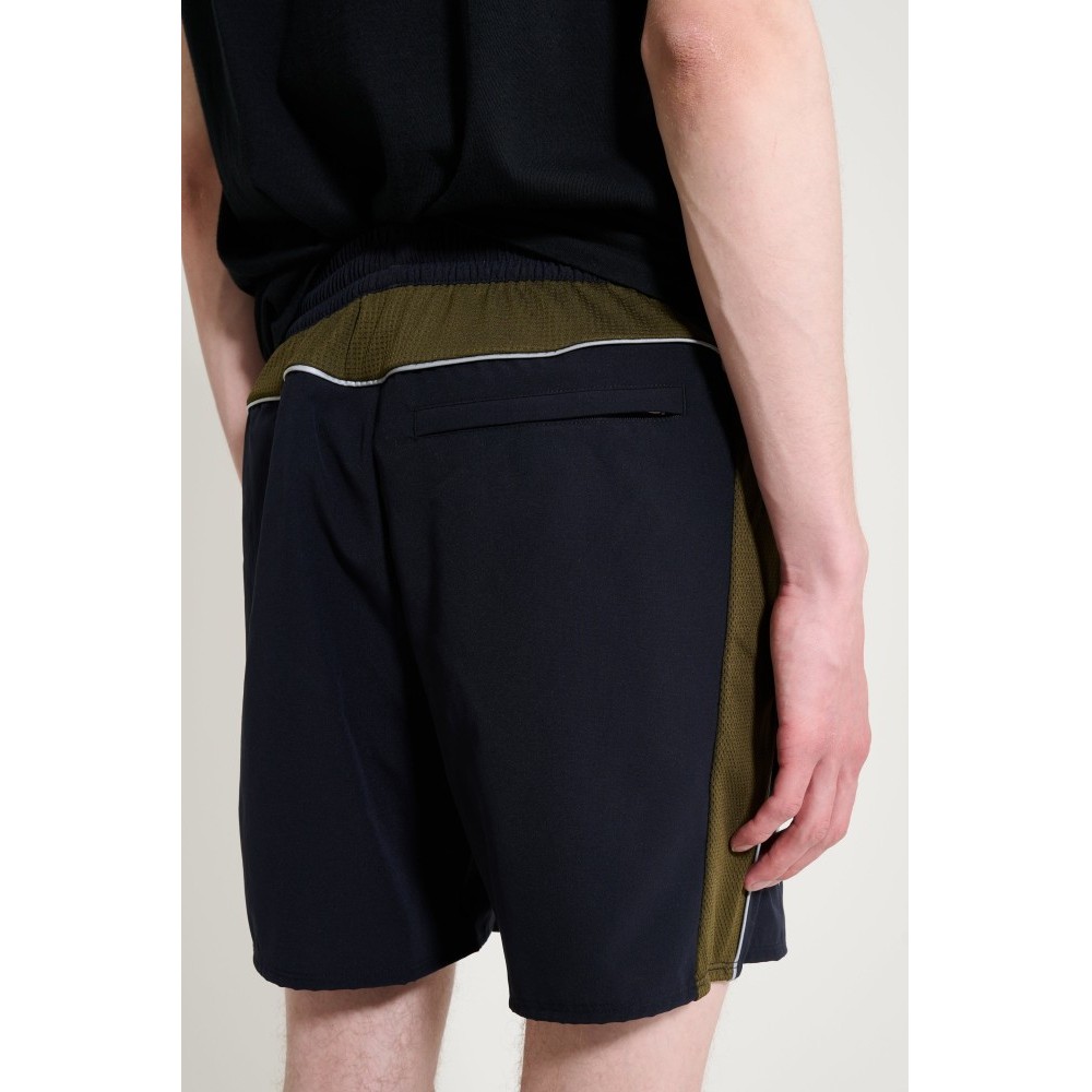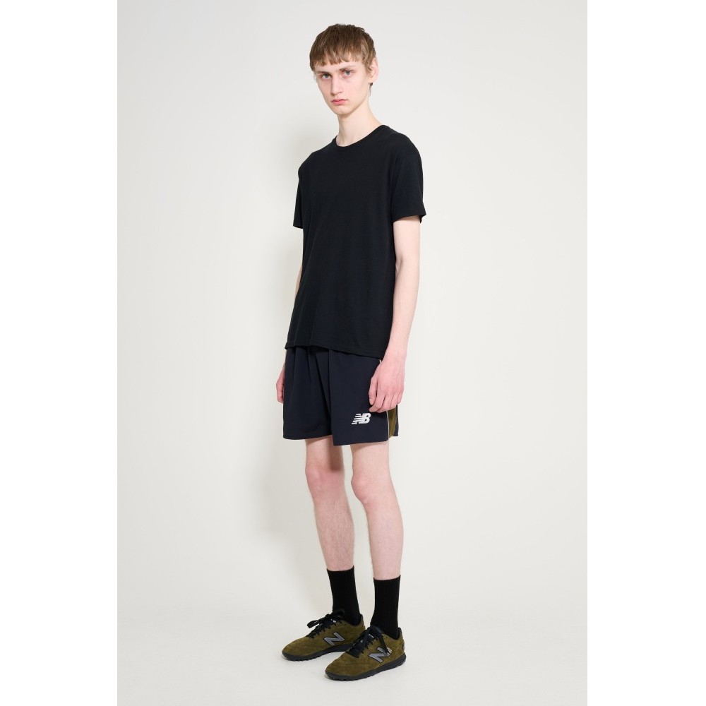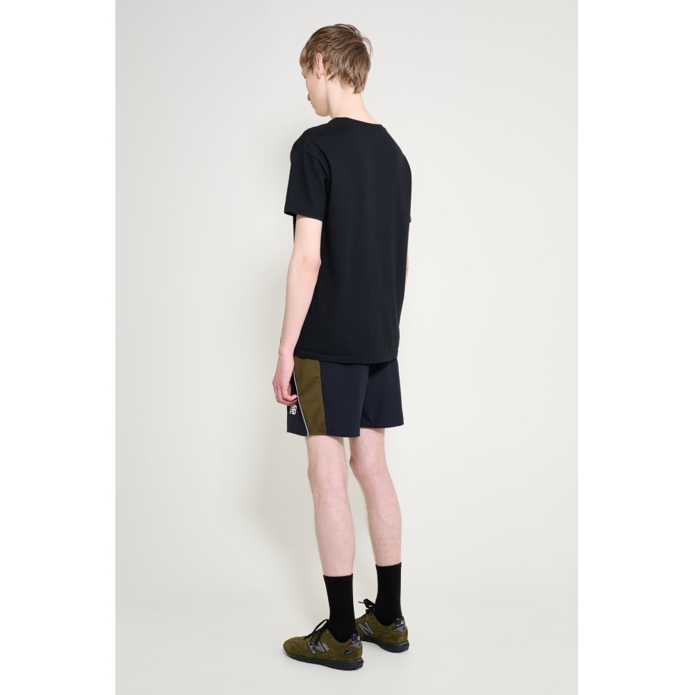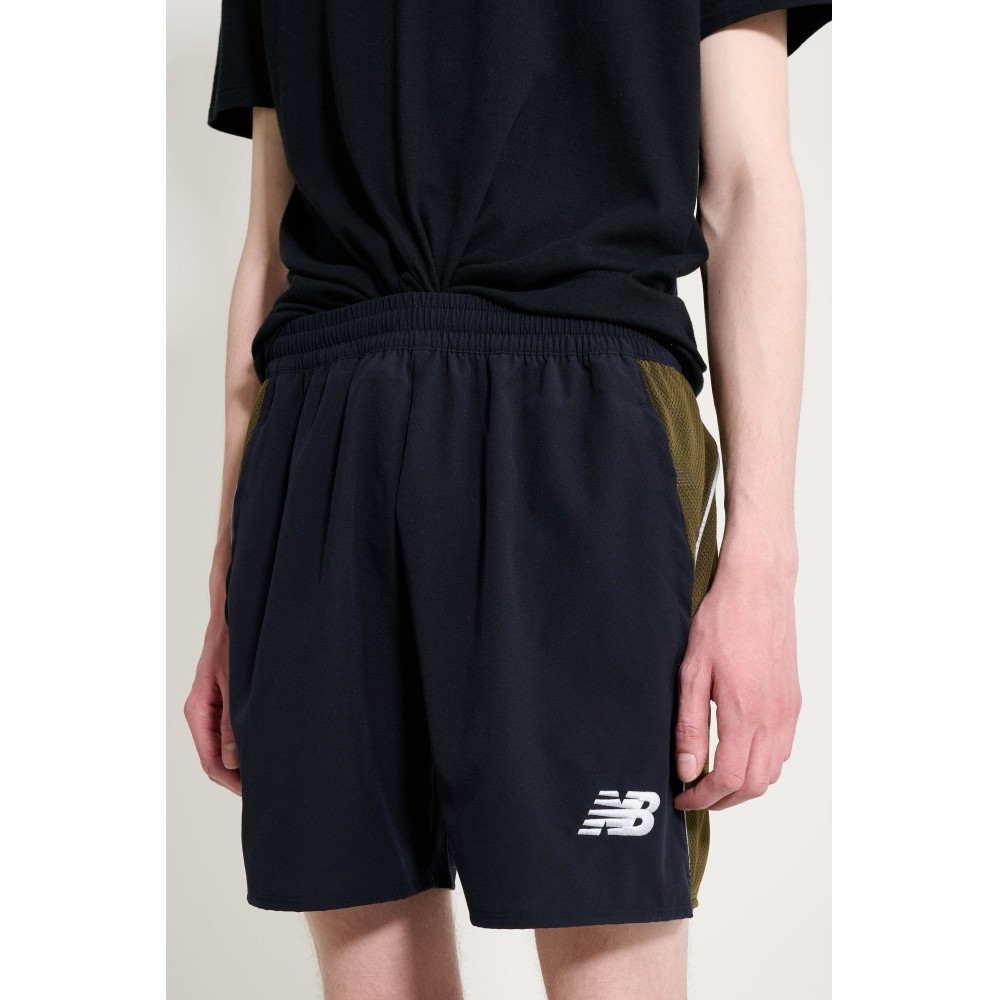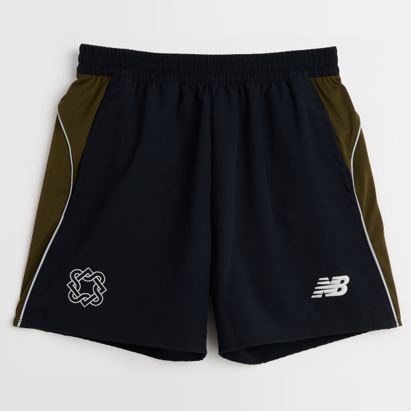 Shorts from New Balance x Lack Of Guidance. Black and olive green layout with panelled construction. Elasticated waistband with adjustable fastening. Breathable mesh running down the sides. New Balance and Lack Of Guidance logos placed on the legs, complemented by a zip back pocket. Designed within the Around The World football capsule.